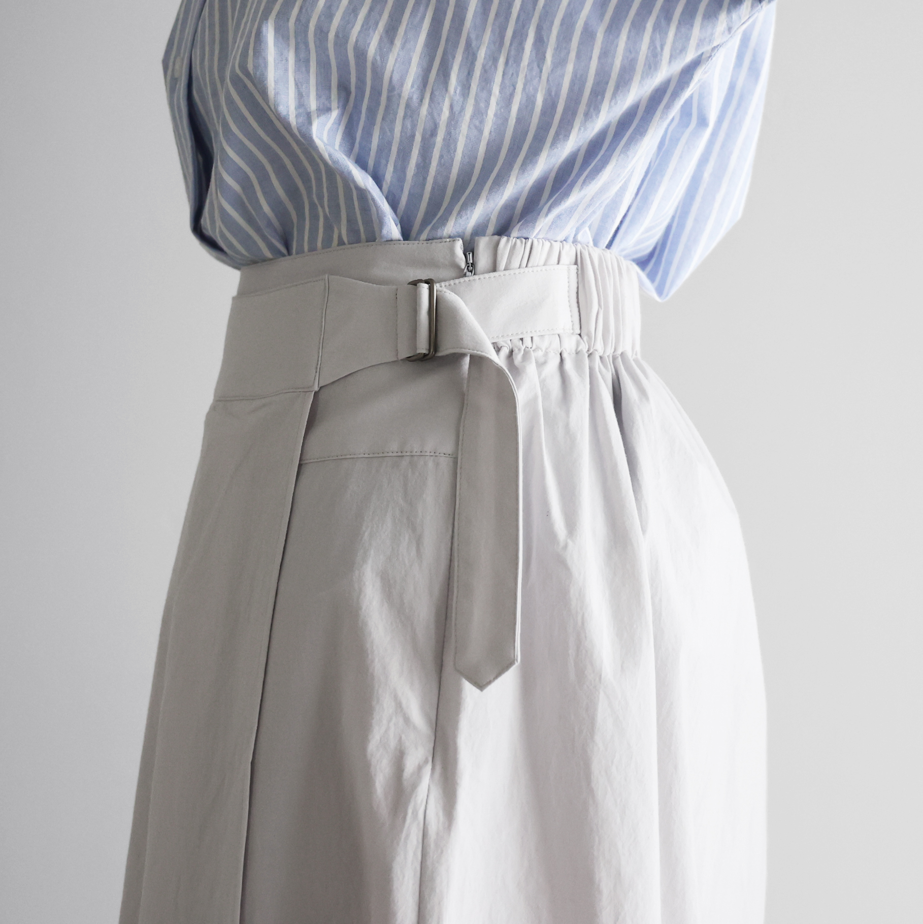 前面はシンプルなタックが入り、すっきりとしたシルエットが生まれます。ウエスト後ろはゴムの仕様になっていますのでウエストにゆとりがありどなたでも着用しやすいほか、ウエストにはベルトが付属していますので細かな調整ができるようになっています。