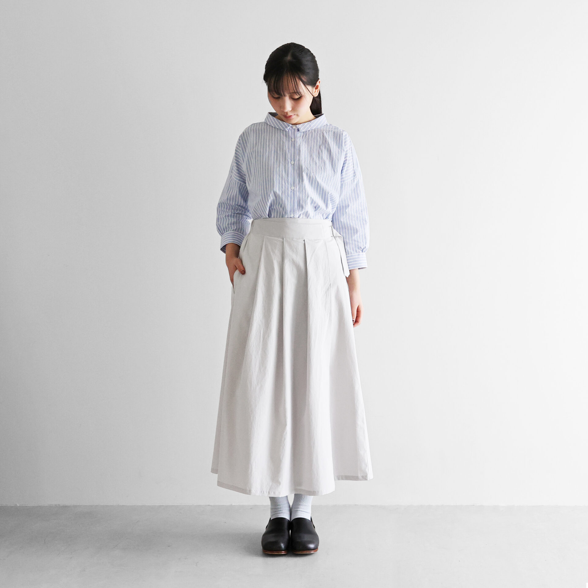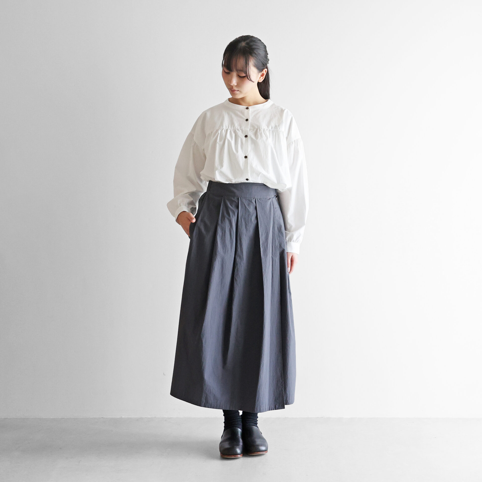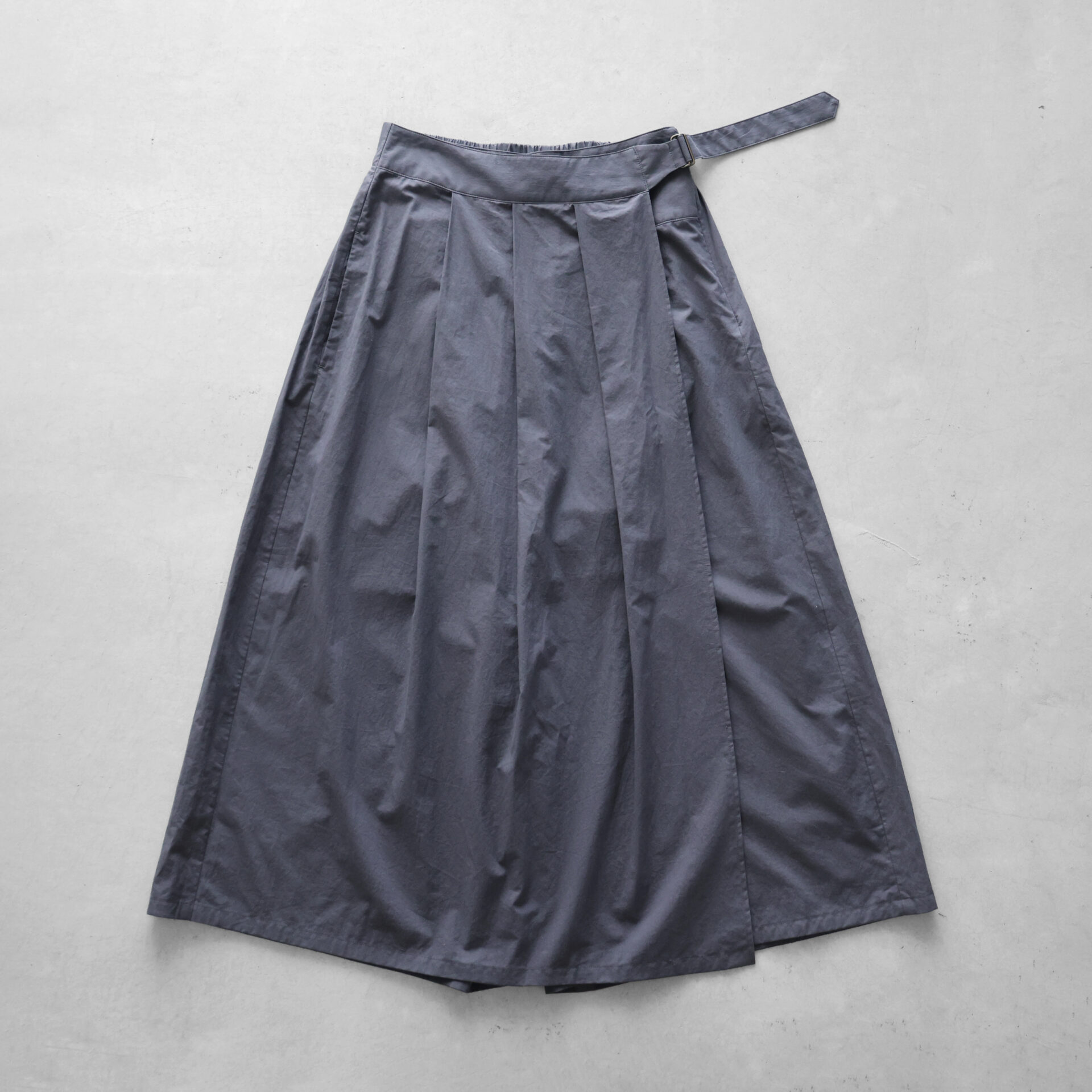 前面はスカート、後ろ面はスカートパンツに見えるユニークな形で、見る角度によってさまざまなスタイルが生まれます。