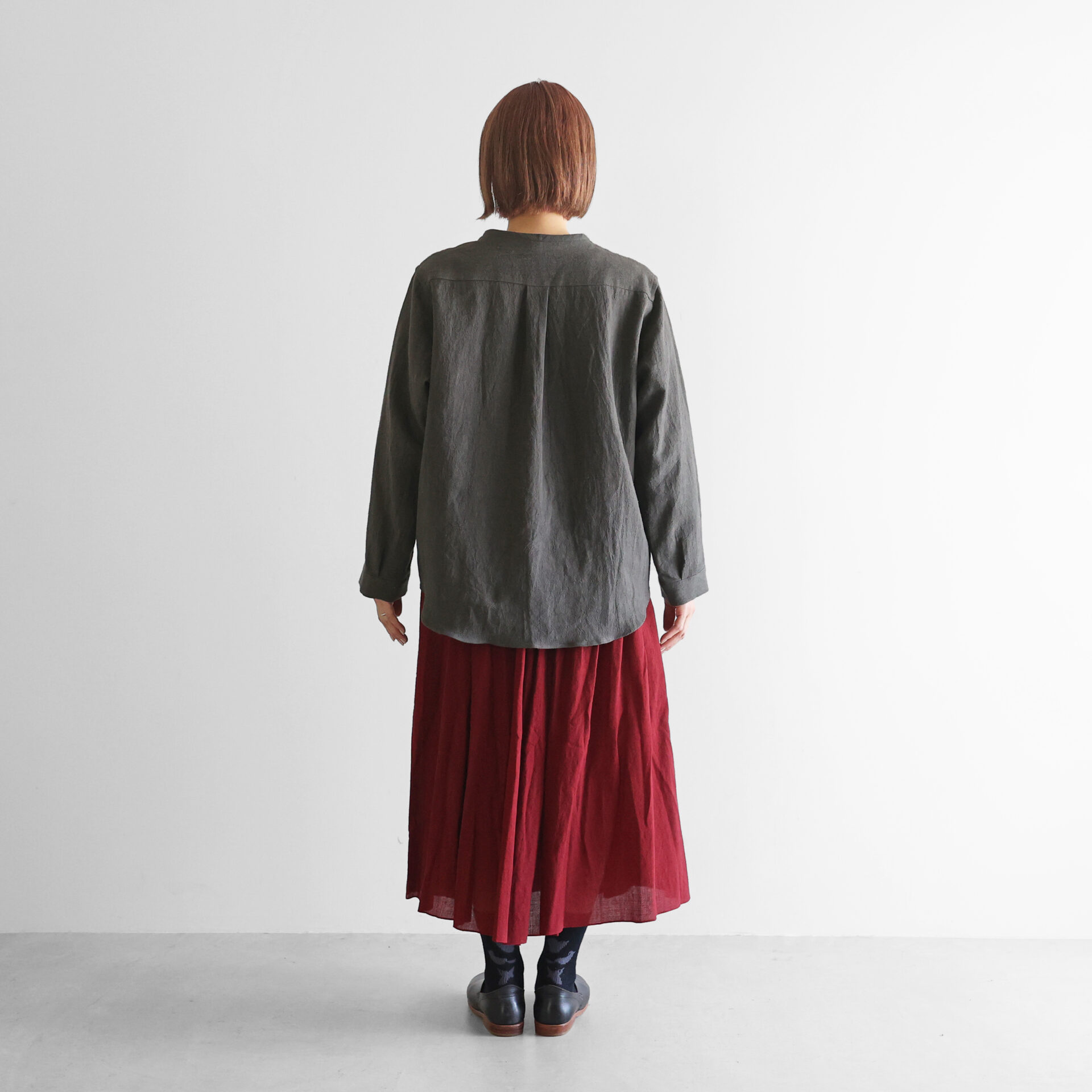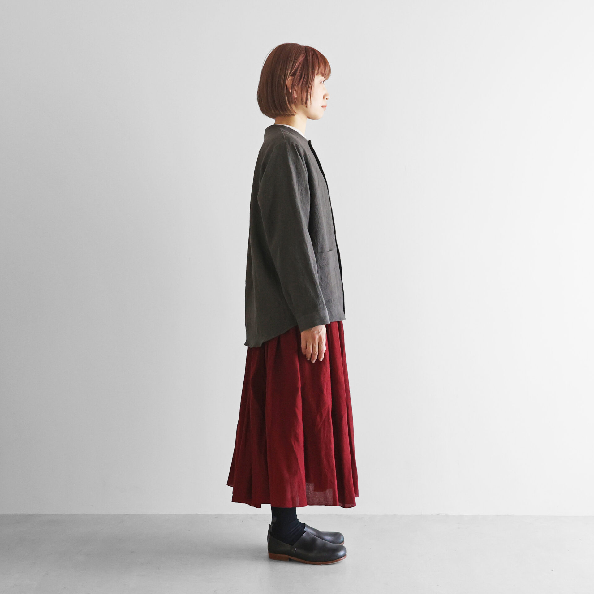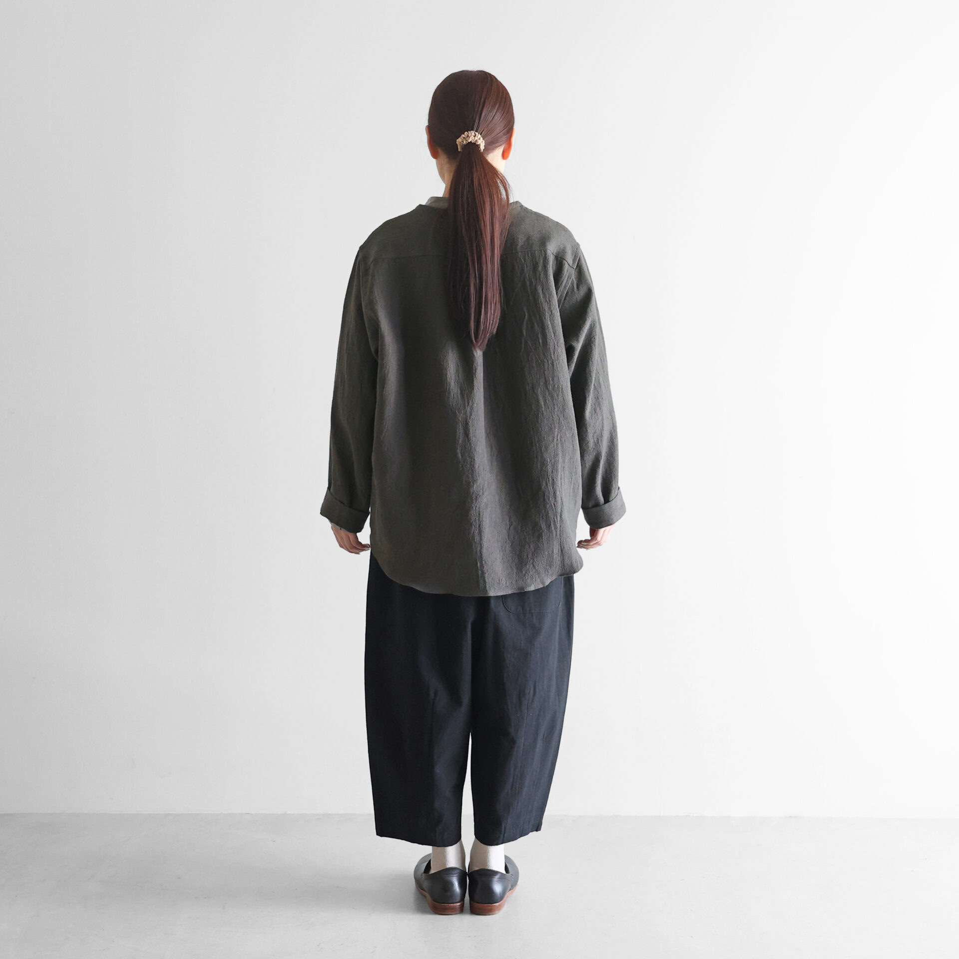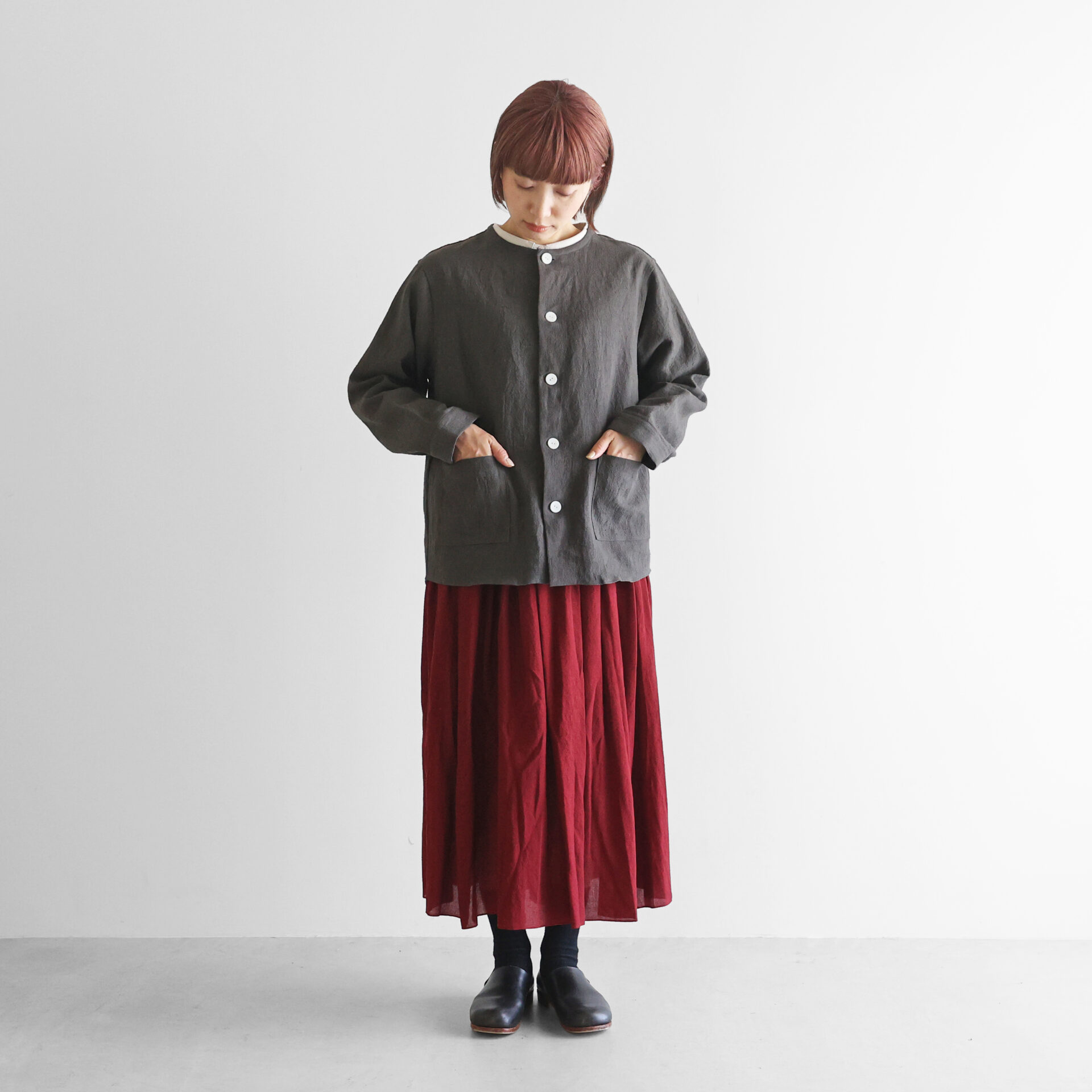 ノーカラーのすっきりとしたデザインのシャツジャケットで、適度に厚みがあるほか、とろみのある生地感のため中間着としても冬場を通して重宝していただくことができます。アウターとしても、シャツとしても、幅広いシーズンで活躍するアイテムです。