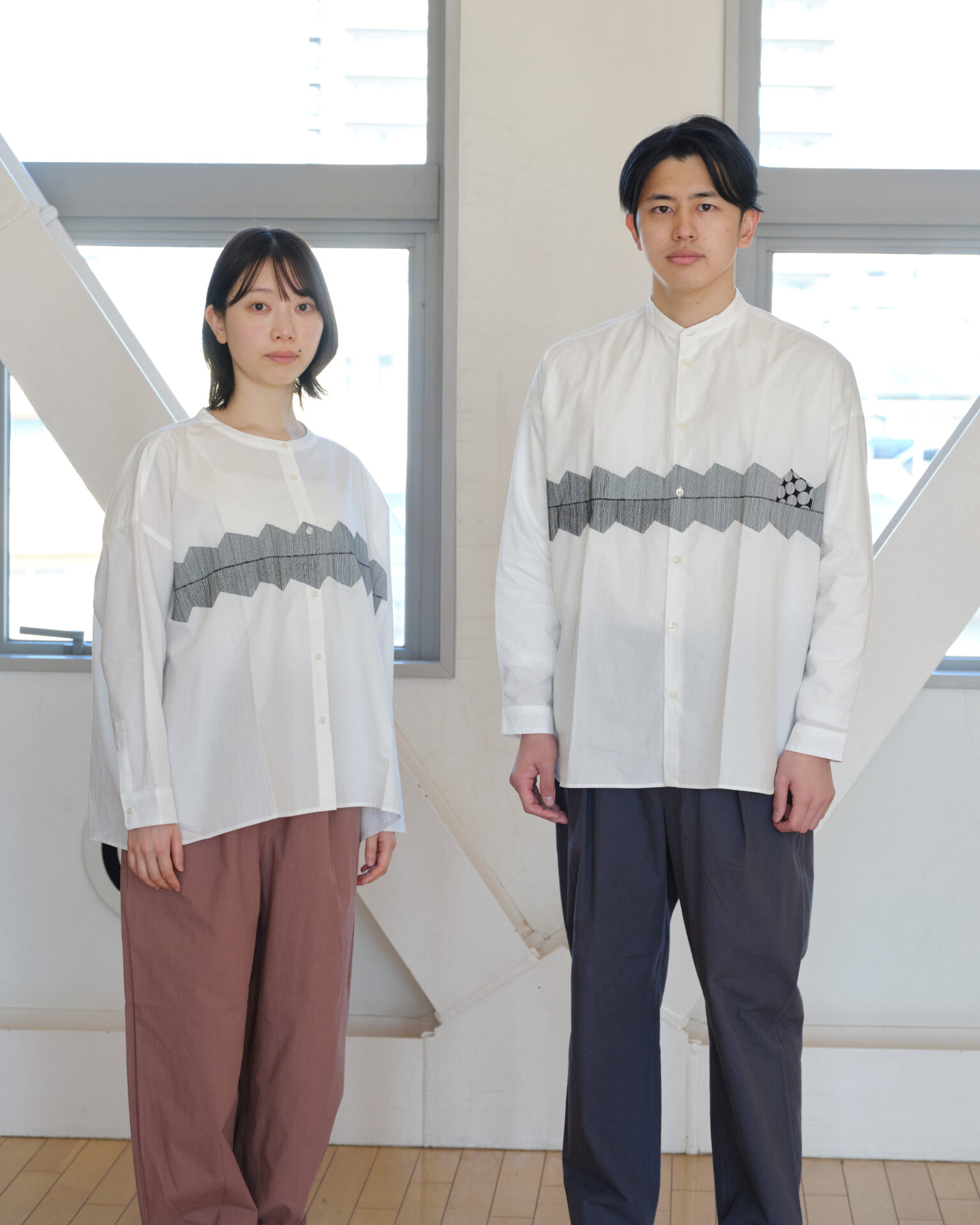 tops/015EM オーガニックコットン刺繍バンドカラーオーバーシャツ