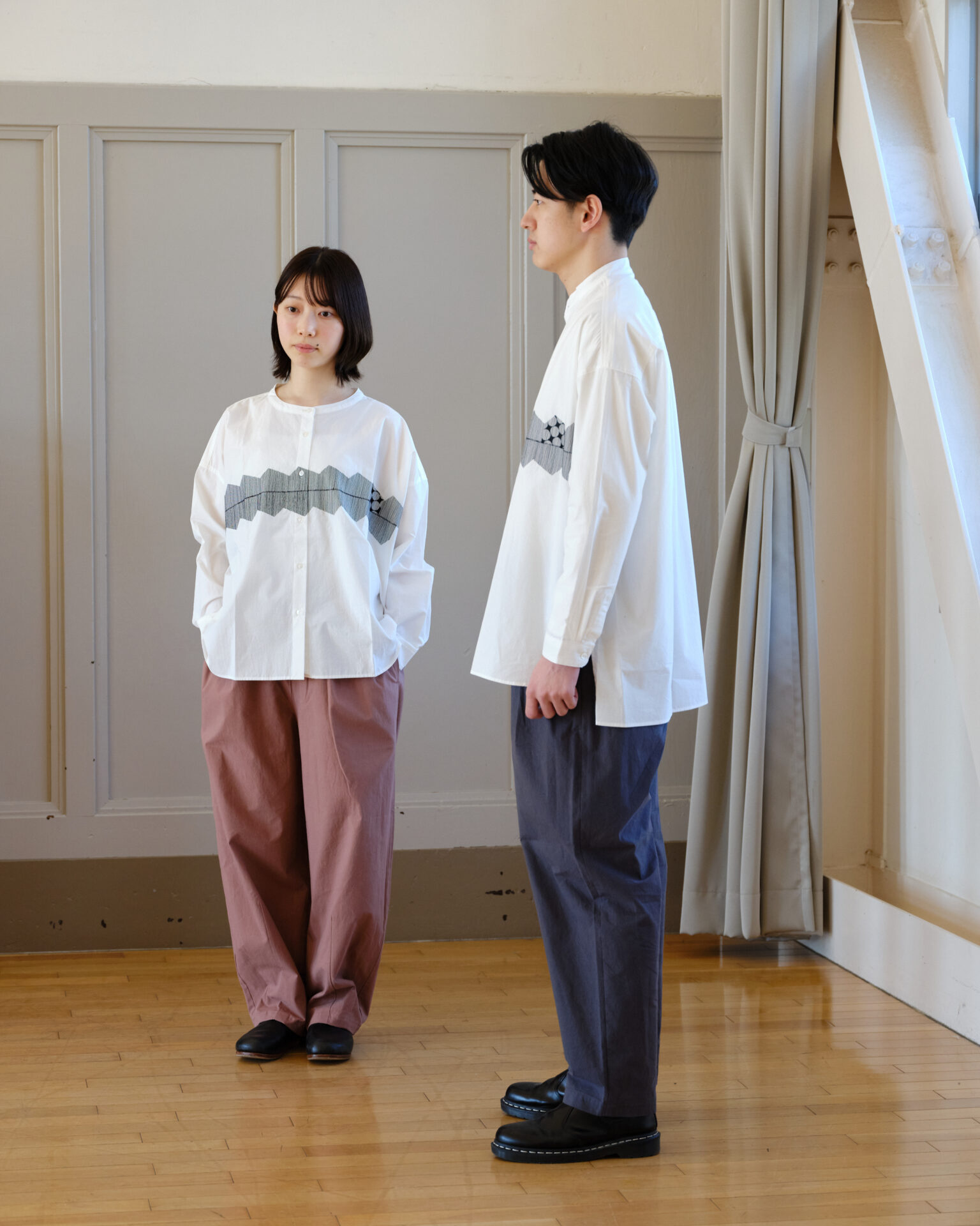U104EM オーガニックコットン刺繍バンドカラーワイドブラウス