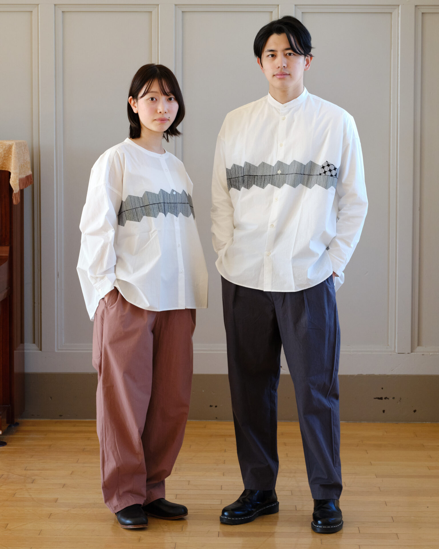 tops/015EM オーガニックコットン刺繍バンドカラーオーバーシャツ