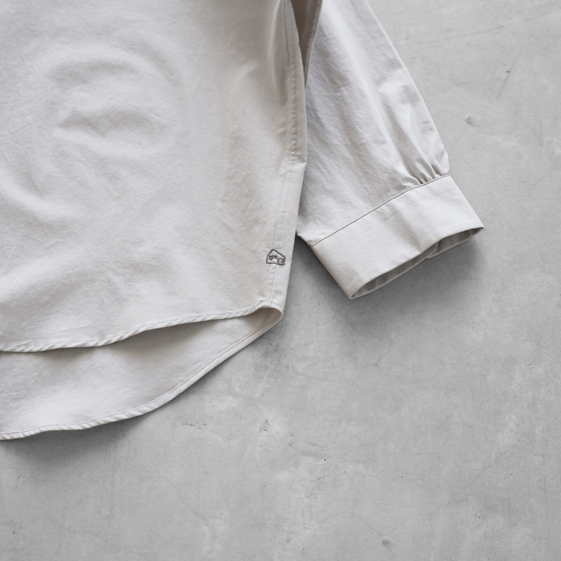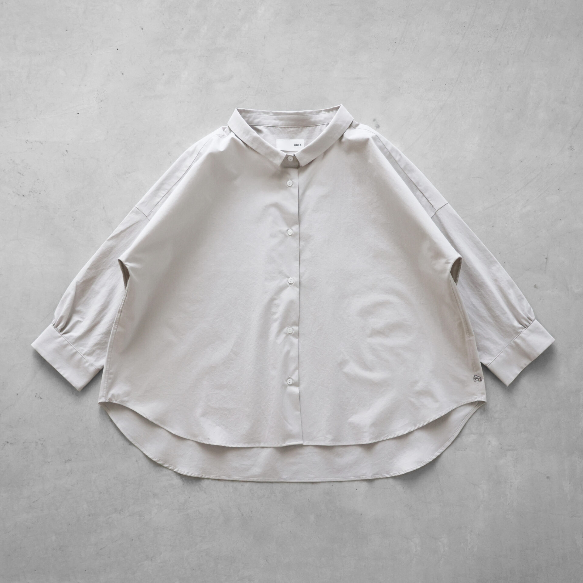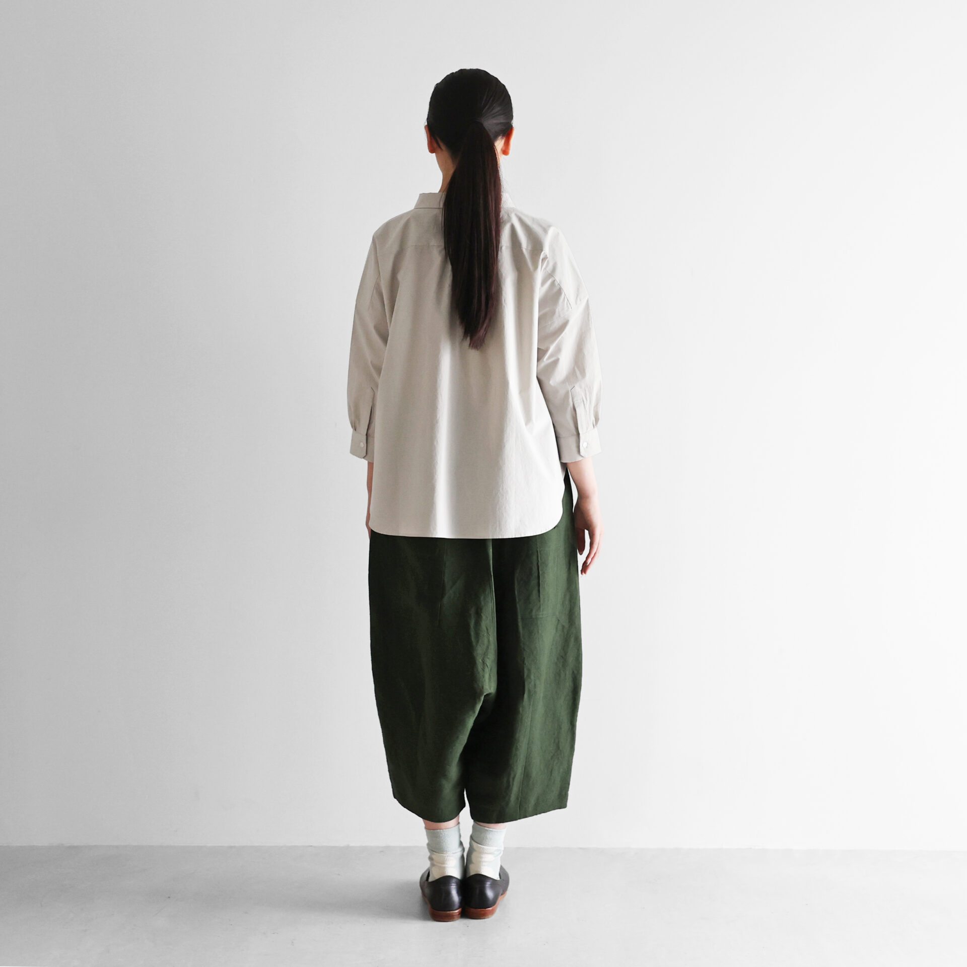 デザインは、身幅を大きくとったワイドシルエットのブラウスに仕上げ、肩の落ちる自然なAラインが生まれることで、スッキリとした印象のシルエットで着ていただけます。