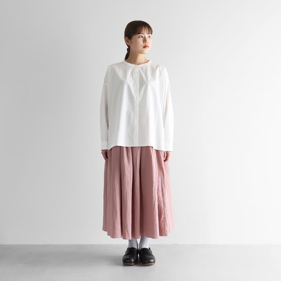 ダブルガーゼのサクラのスカート軽くてとても着心地がいいです。あまりにも軽いので、アレ?スカーと履いたっけ?と不安になるくらい軽いです。そして色がとっても可愛い色です。モノトーンはもちろんですが、私はカーキとの合わせが好きです。ダブルガーゼなのでとても気持ち良くてこれから春夏に向けてヘビロテになりそうです。