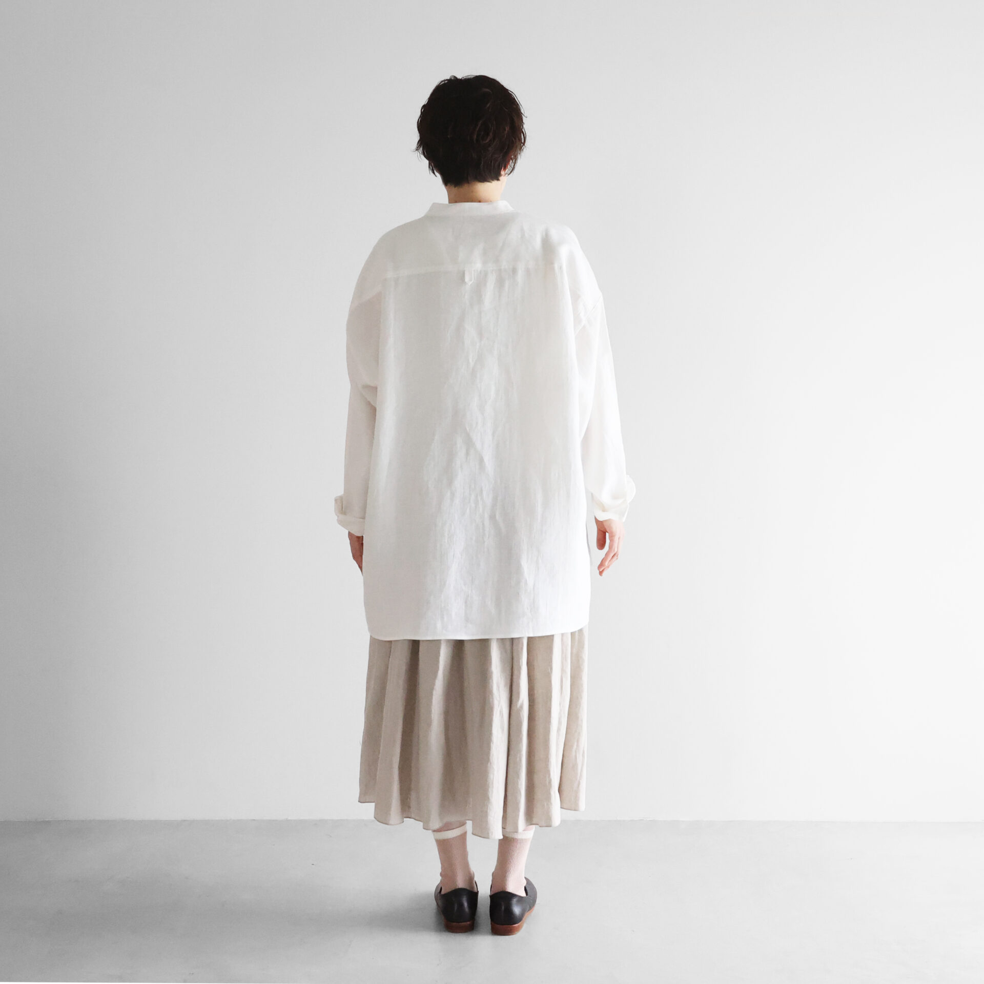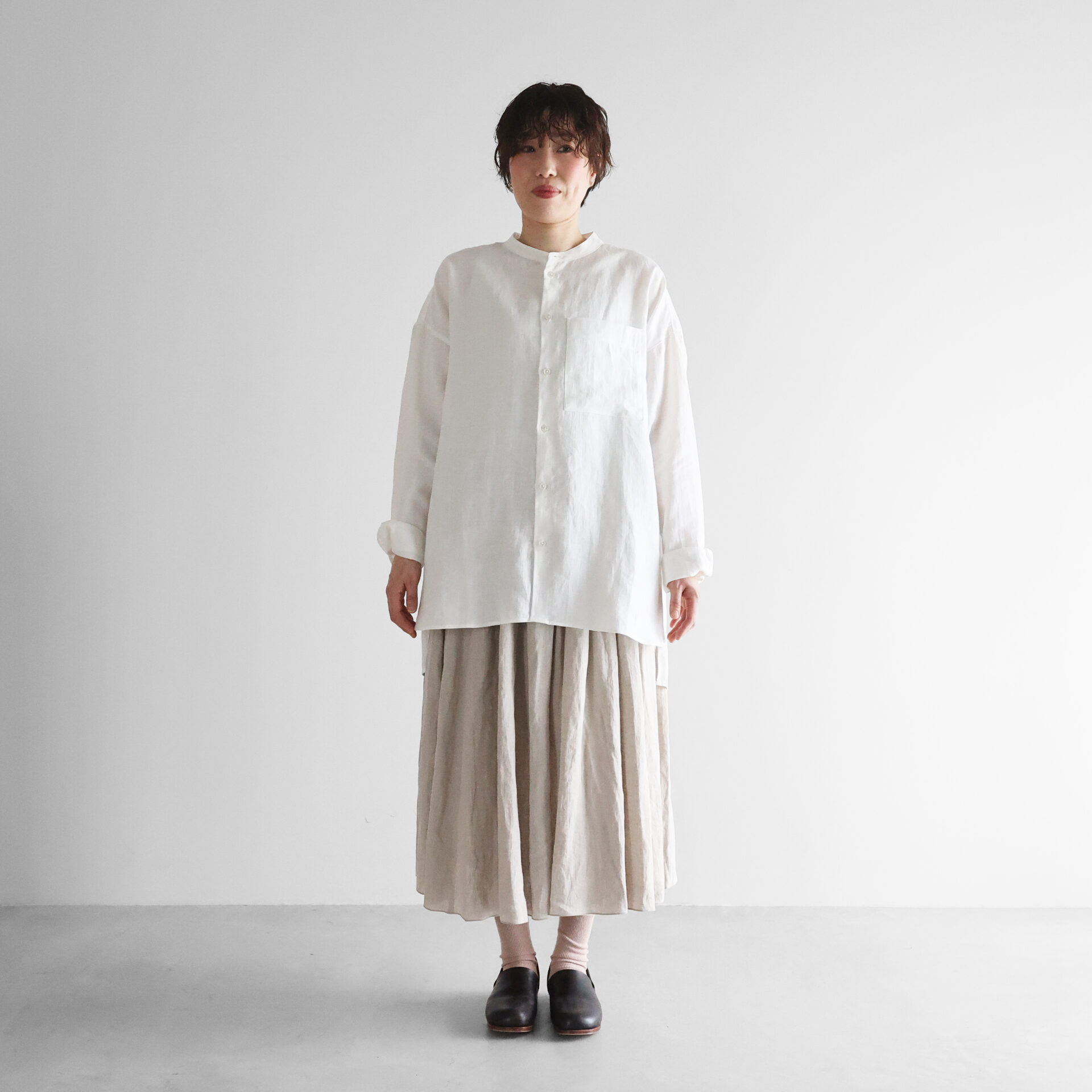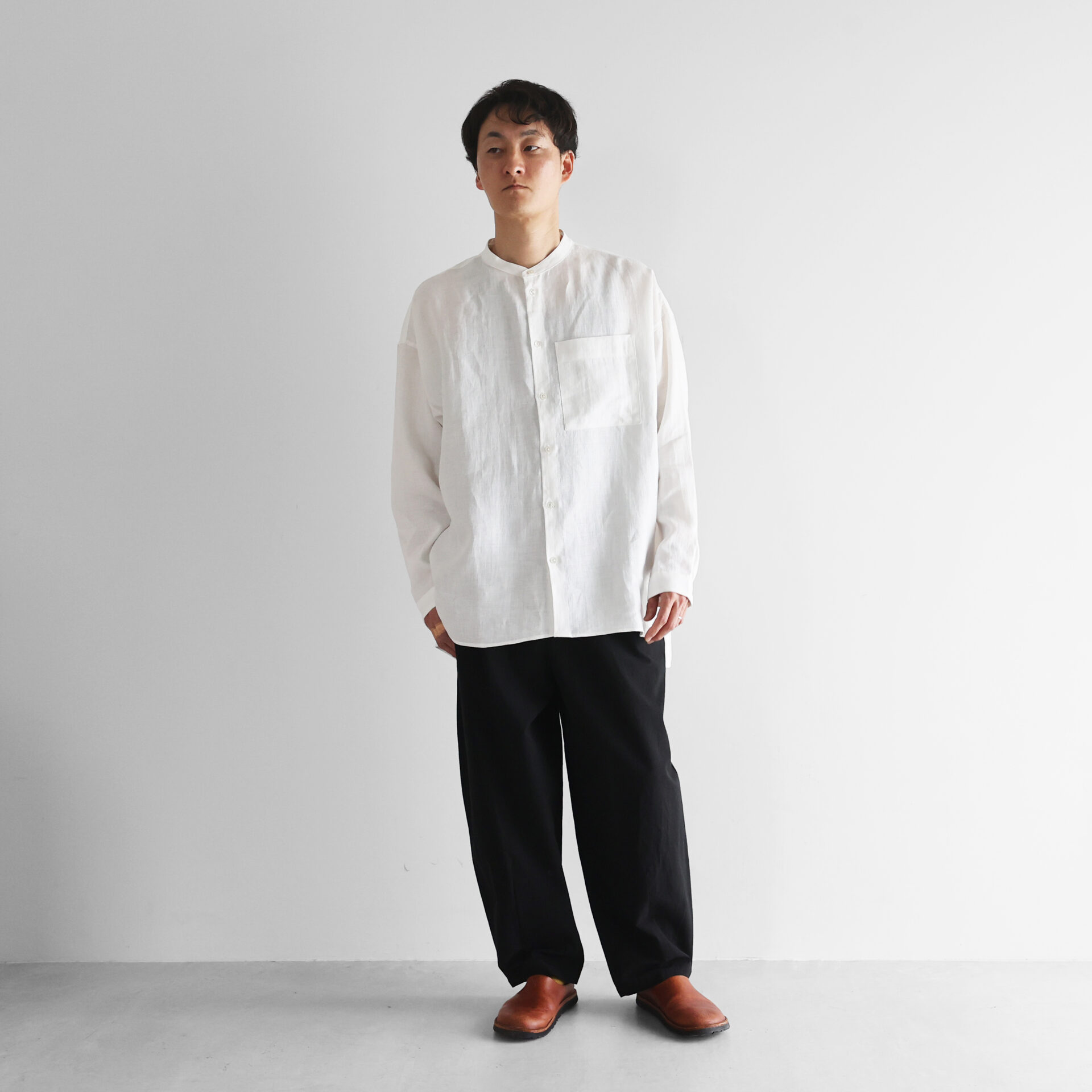 デザインは、身幅をたっぷりととったオーバーサイズのシャツで、バンドカラーのすっきりとしたデザインです。