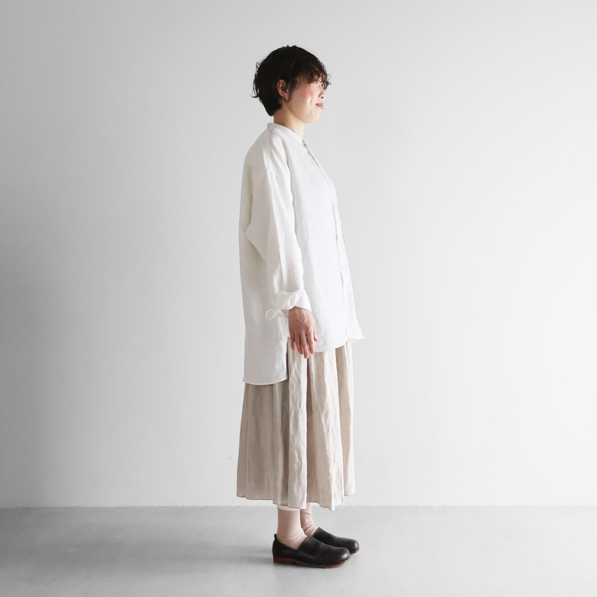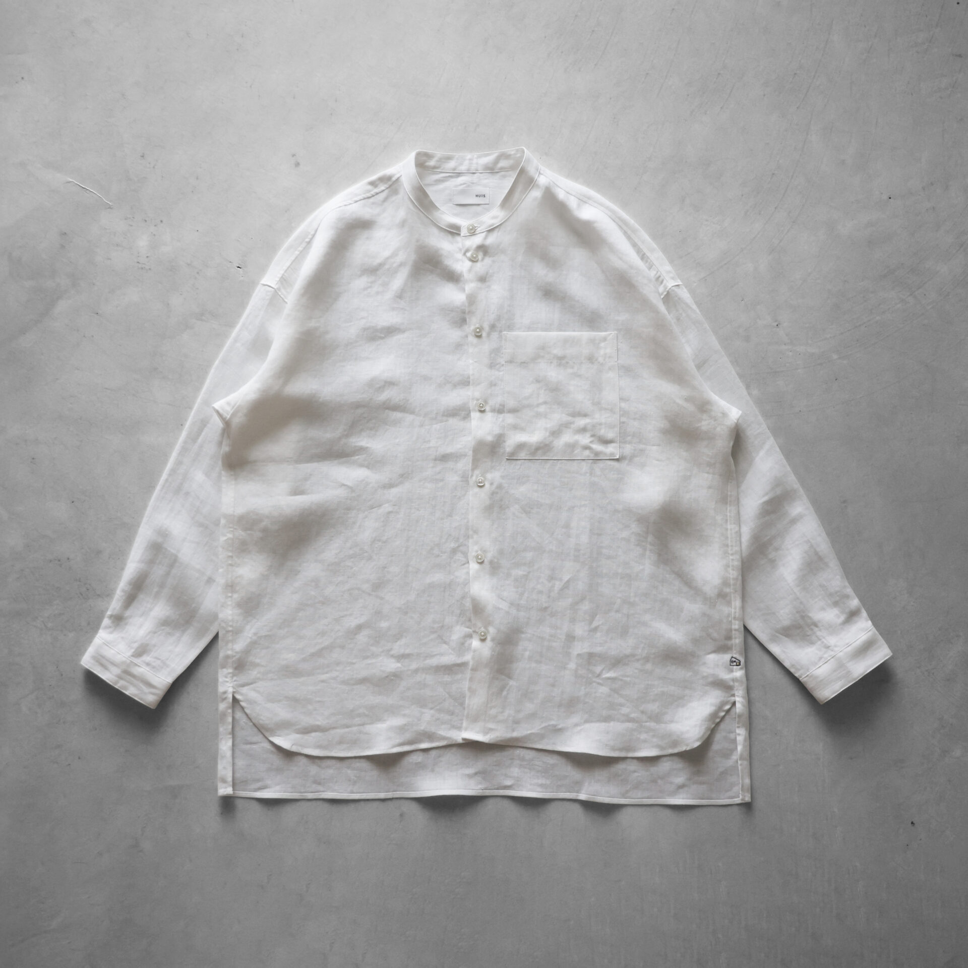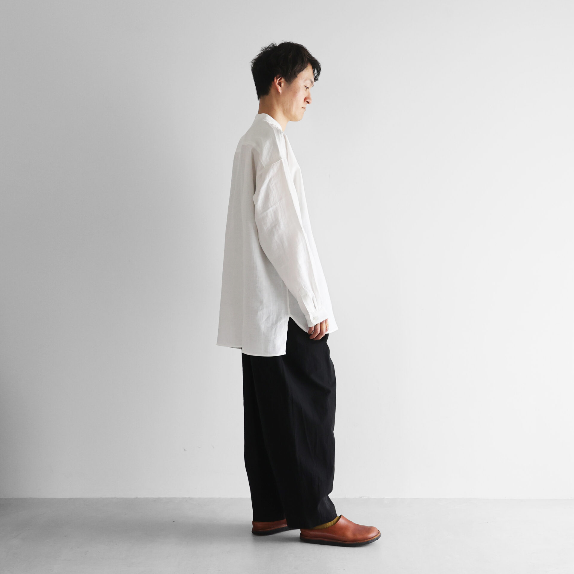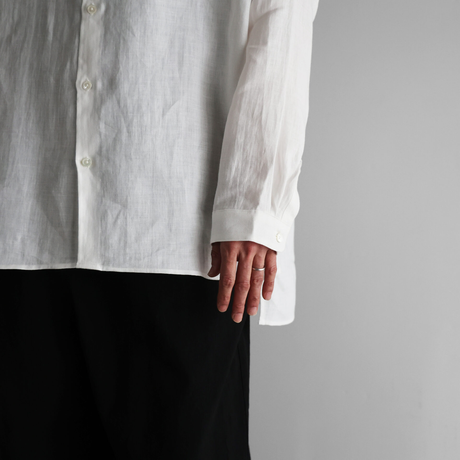 デザインは、身幅をたっぷりととったオーバーサイズのシャツで、バンドカラーのすっきりとしたデザインです。