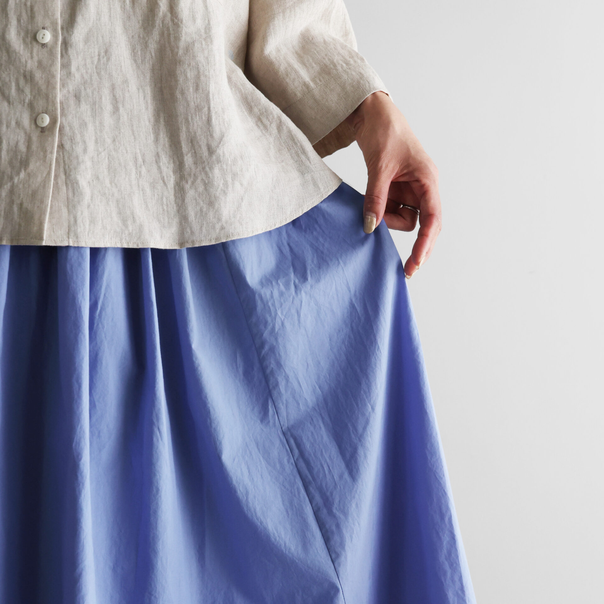 【超高密度による高級感のあるハリ感・しっかり感】と、【シャトル織機によるしなやかさ・柔らかさ】が共存した、贅沢で不思議な生地感は、身にまとうことで実感していただくことができると思います。