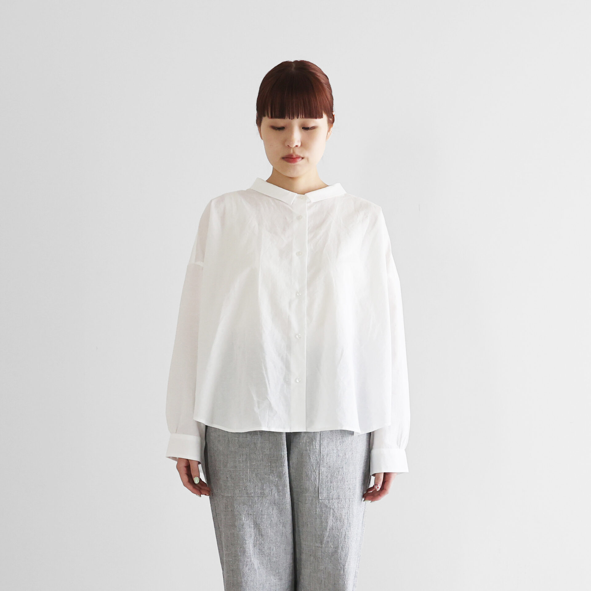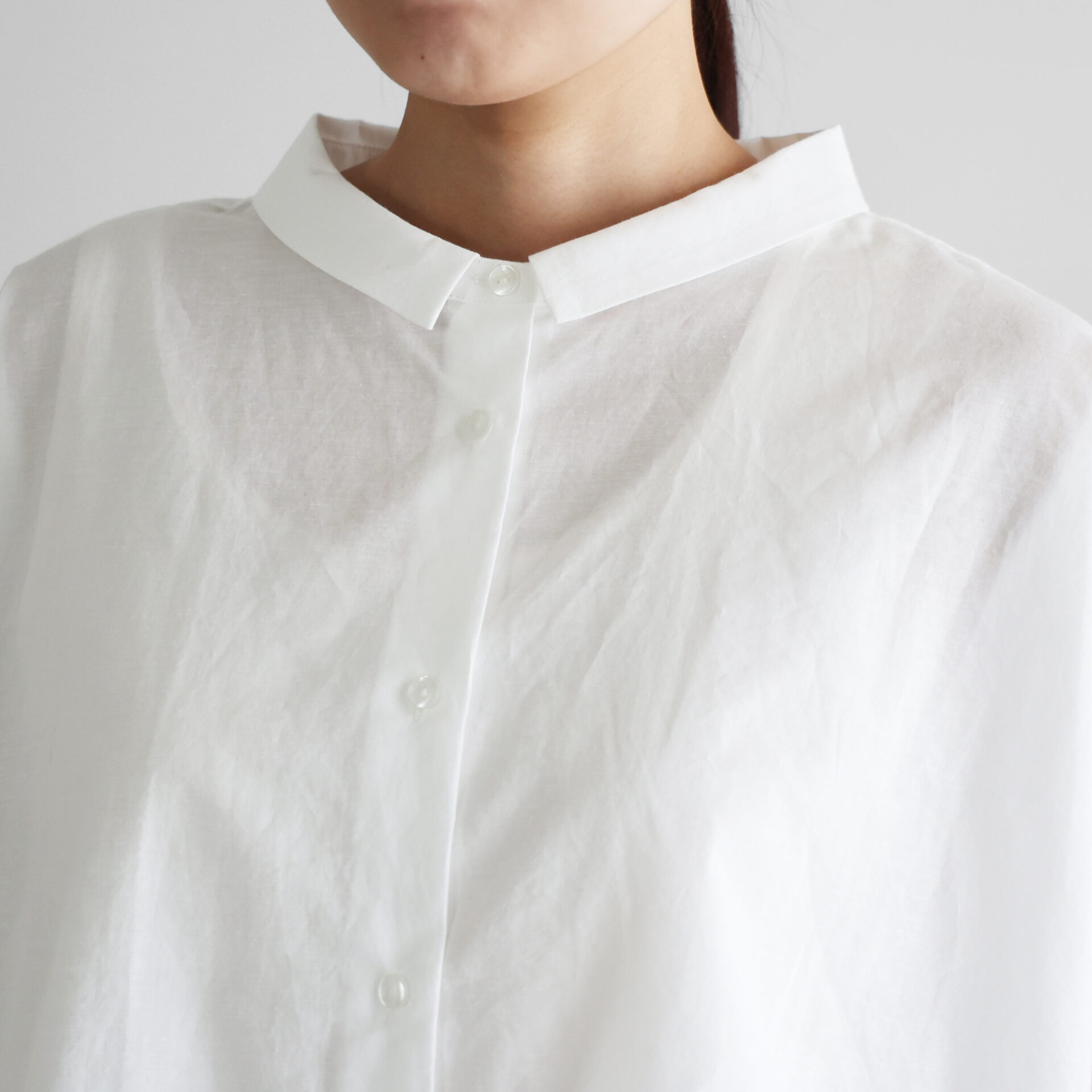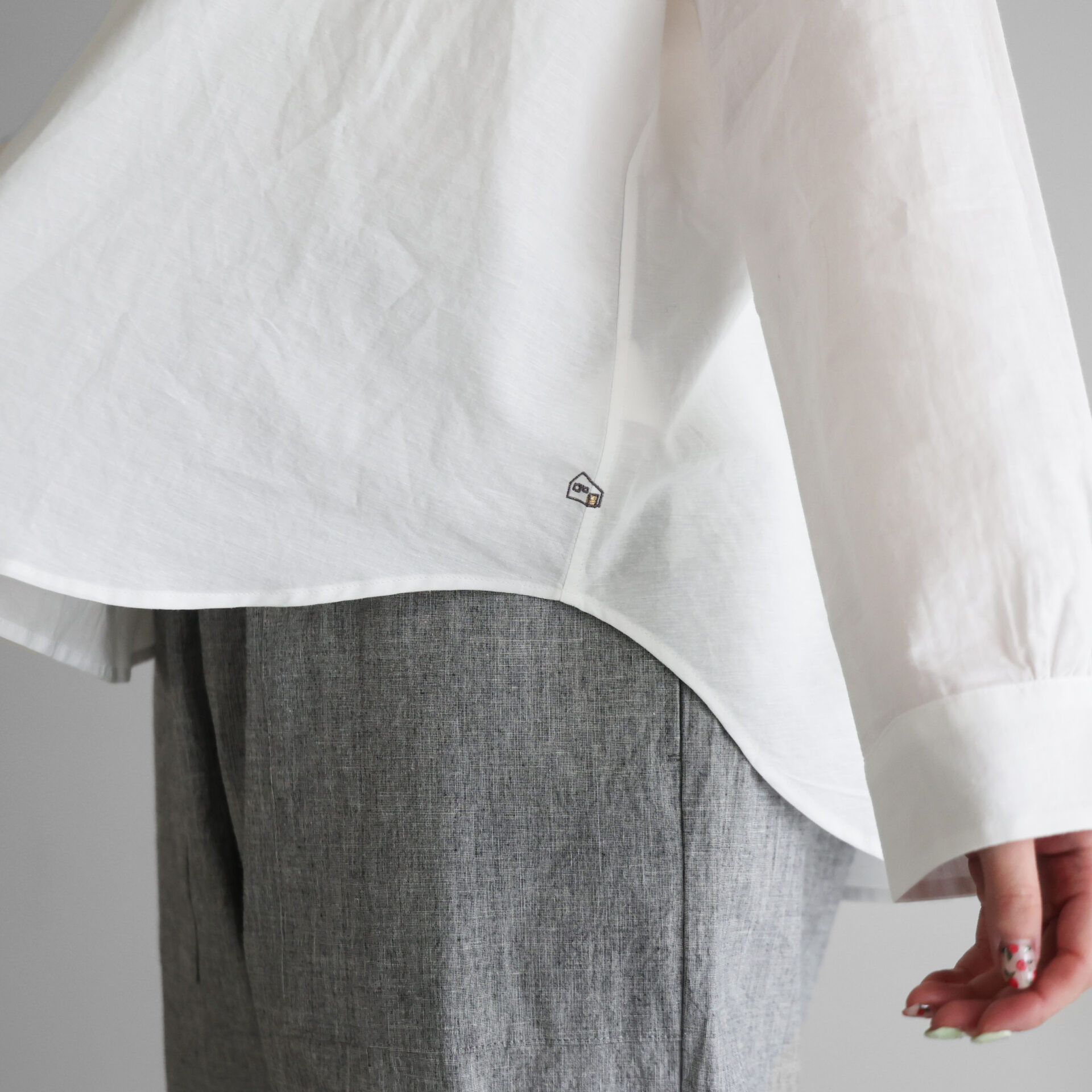 デザインは、身幅を大きくとったワイドシルエットのブラウスに仕上げ、肩の落ちる自然なAラインが生まれることで、スッキリとした印象のシルエットで着ていただけます。