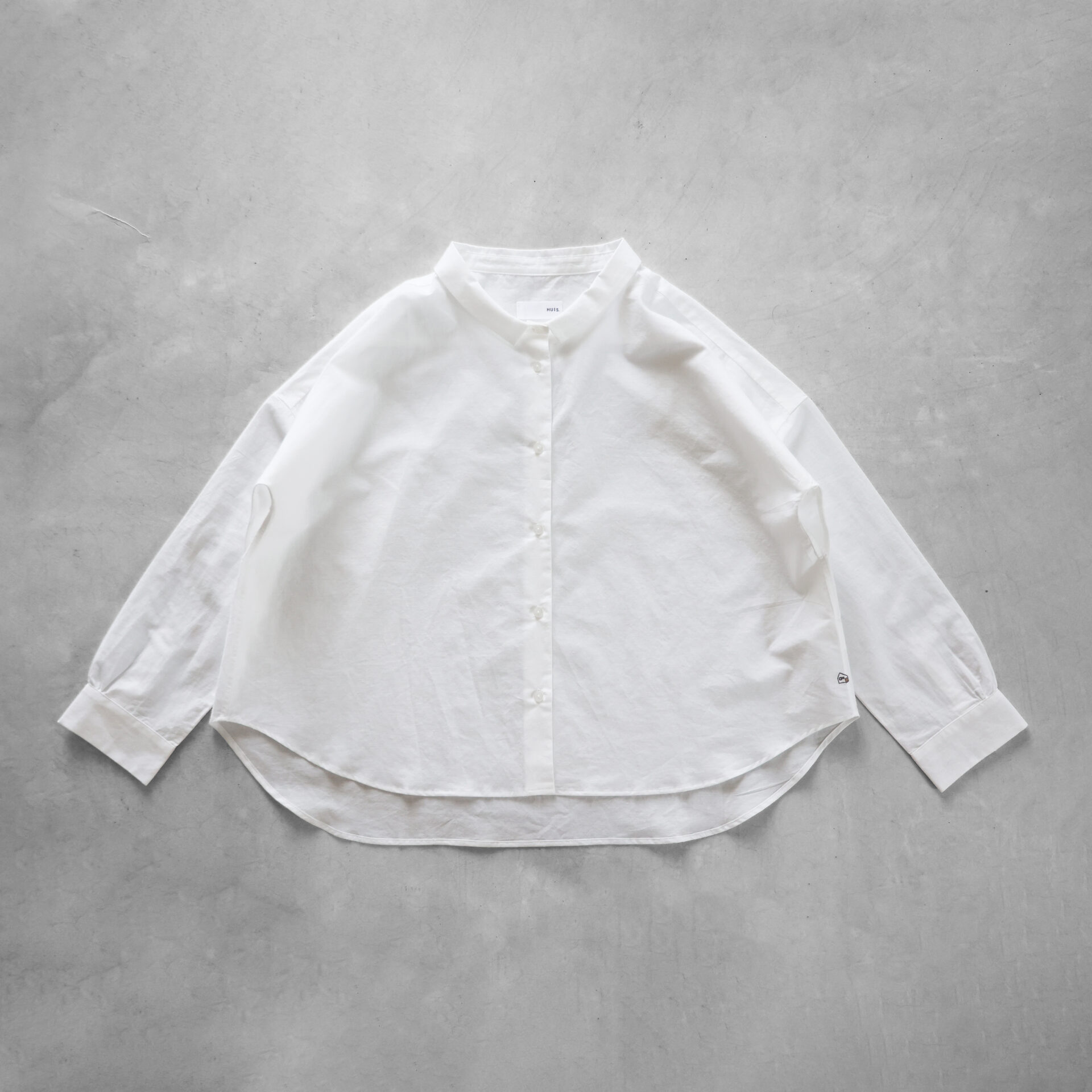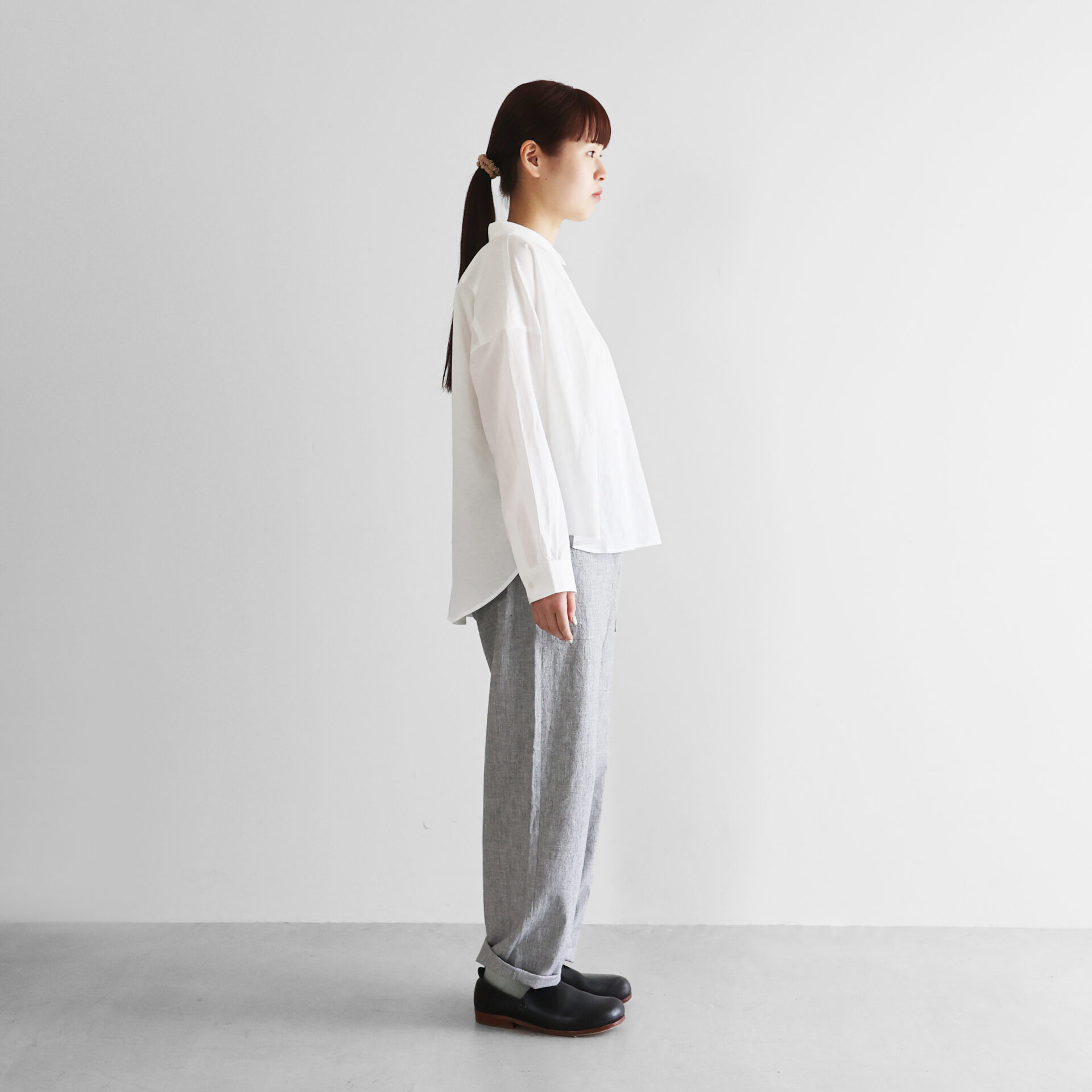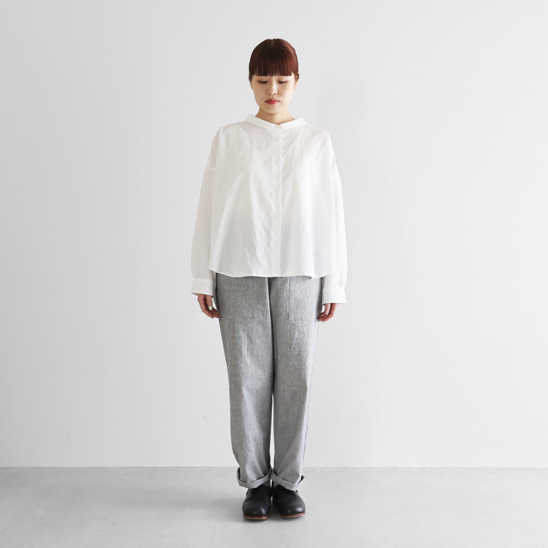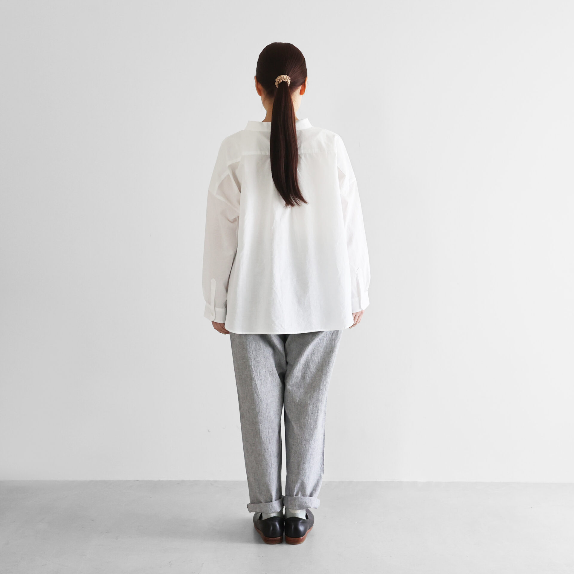 デザインは、身幅を大きくとったワイドシルエットのブラウスに仕上げ、肩の落ちる自然なAラインが生まれることで、スッキリとした印象のシルエットで着ていただけます。