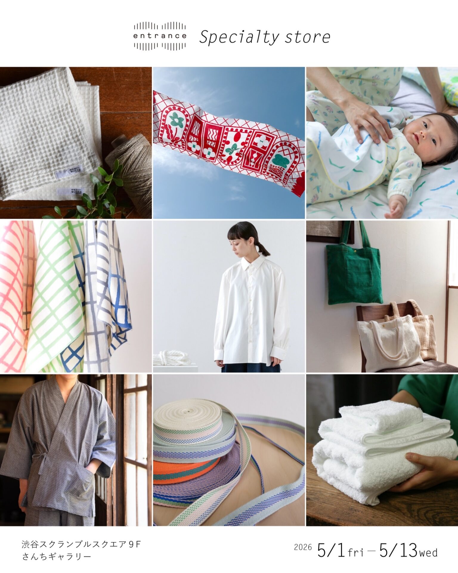 遠州織物に関わる若手メンバーを中心に会社や業種の枠を超え産地の活性化を目指して活動する遠州産地のプロジェクトチーム「entrance」が、渋谷スクランブルスクエア9F 渋谷ショールーム併設の「さんちギャラリー」初出展です!