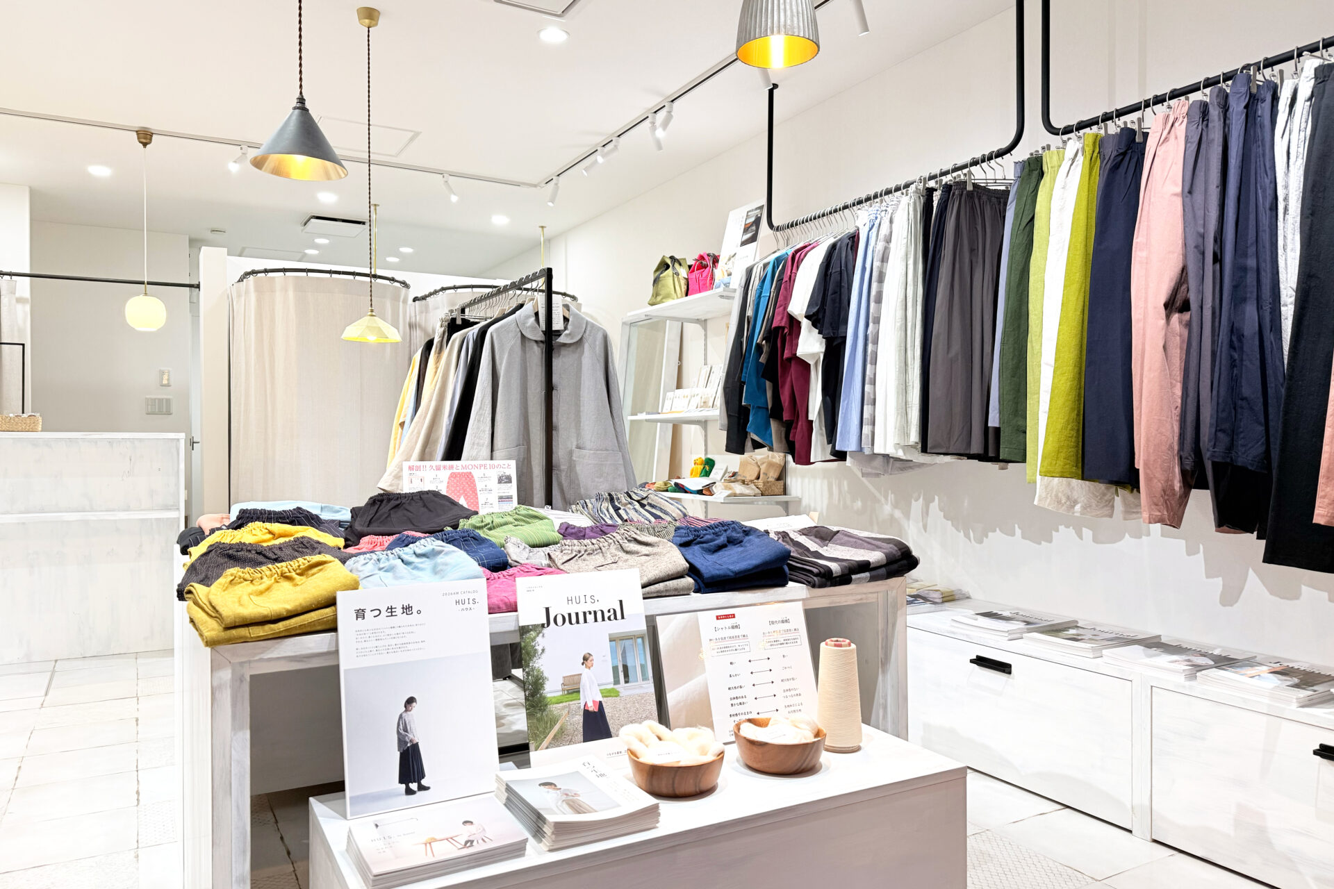 HUISのアイテムを豊富にお取り扱いいただいているほか、うなぎの寝床さんやトリプル・オゥさんなど、国内繊維産地に根差したブランドさんも多数お取り扱いされています。