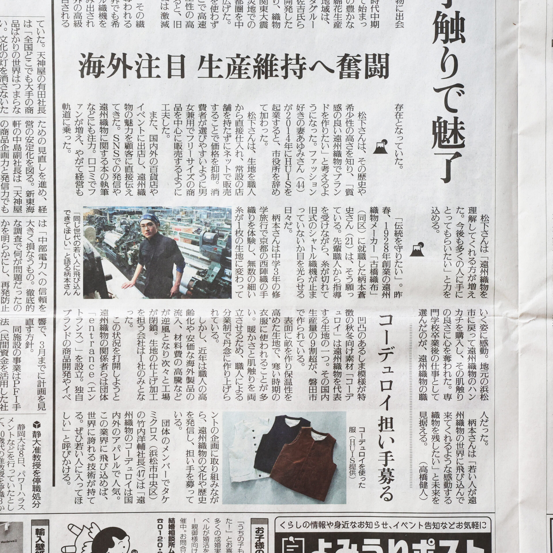 紙面では、遠州産地が抱える現状や生産を続ける難しさだけでなく、若い担い手の存在や、遠州コーデュロイをはじめとする素材の可能性にも触れていただいています。