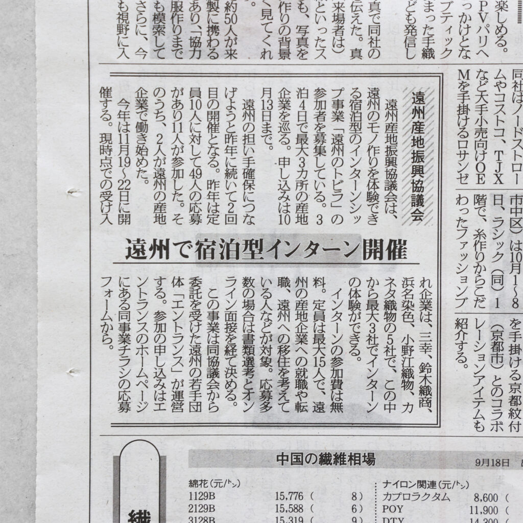 遠州産地振興協議会が主催する、宿泊型インターンシップ事業「遠州のトビラ」の記事が、繊維ニュース に掲載されました。
