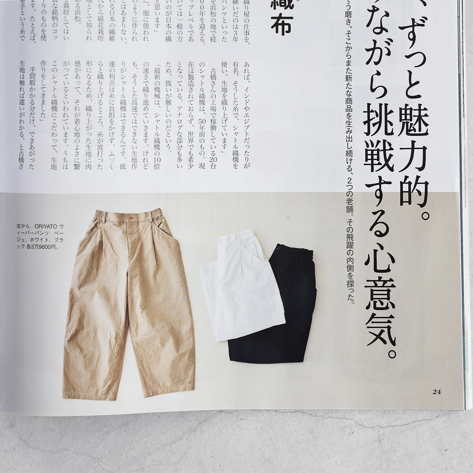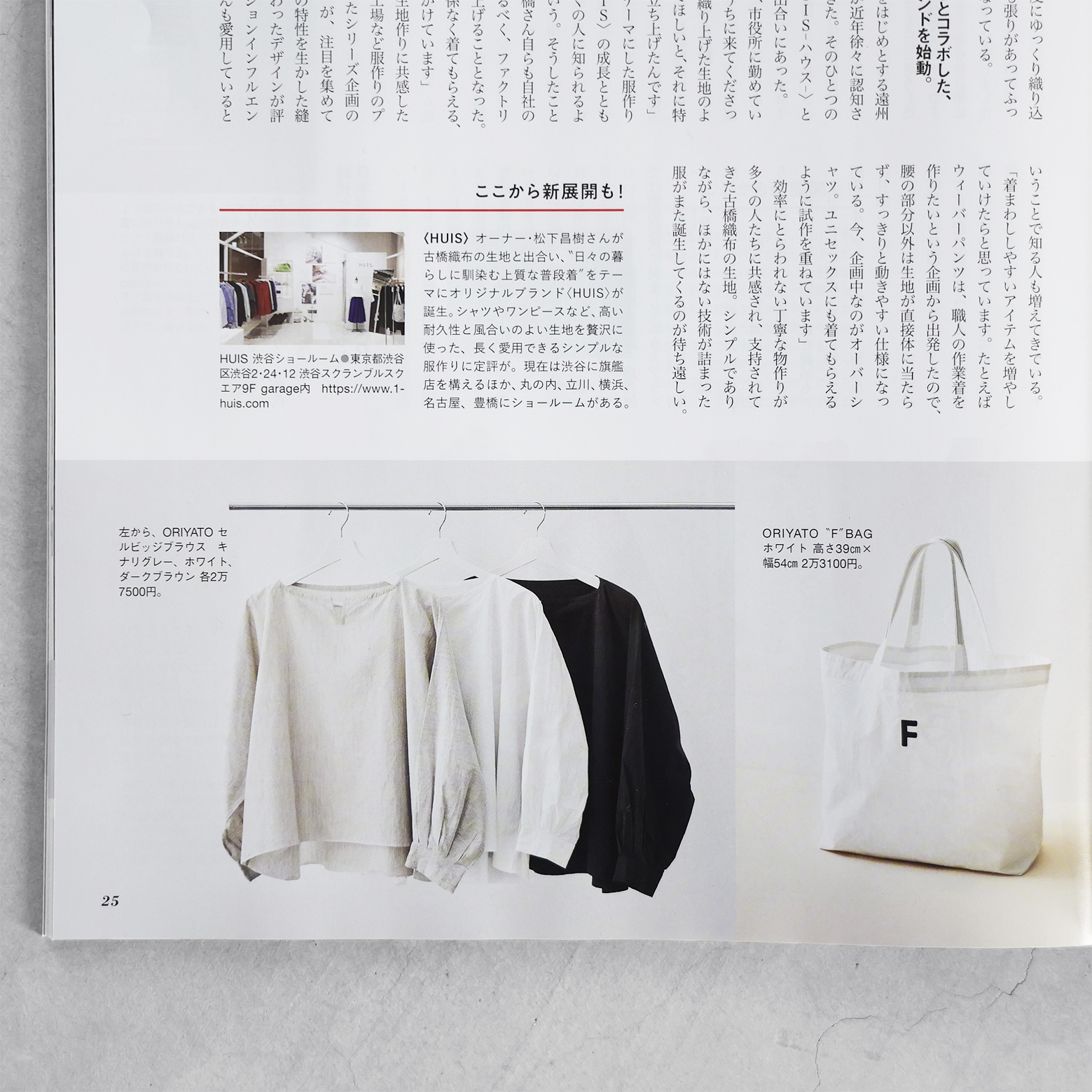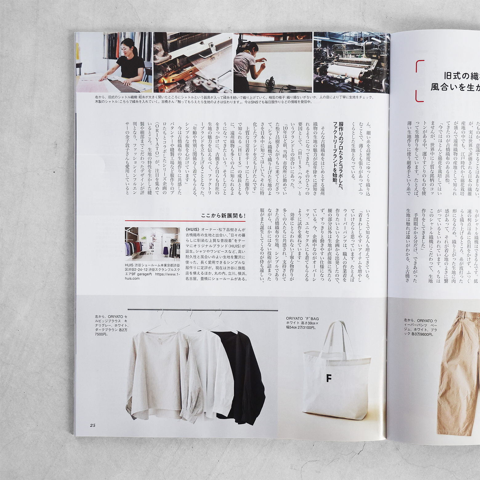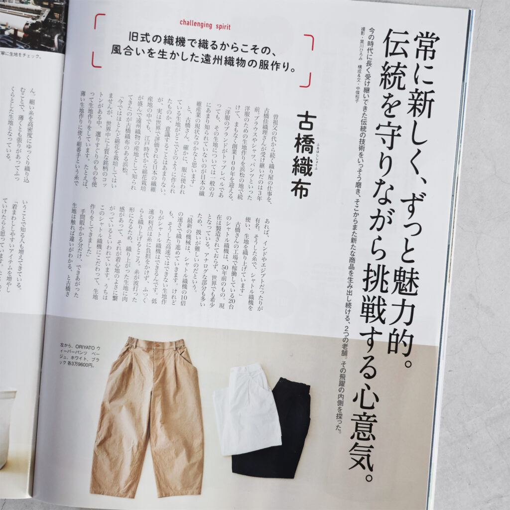 織物産地としての遠州の歴史や、古橋織布さんが代々大切にされてきた技術やこだわり、そして伝統を守るための新たな取り組み「ORIYATO」などについて、「クロワッサン」さんらしいやわらかな文体で、丁寧にご紹介いただいています。