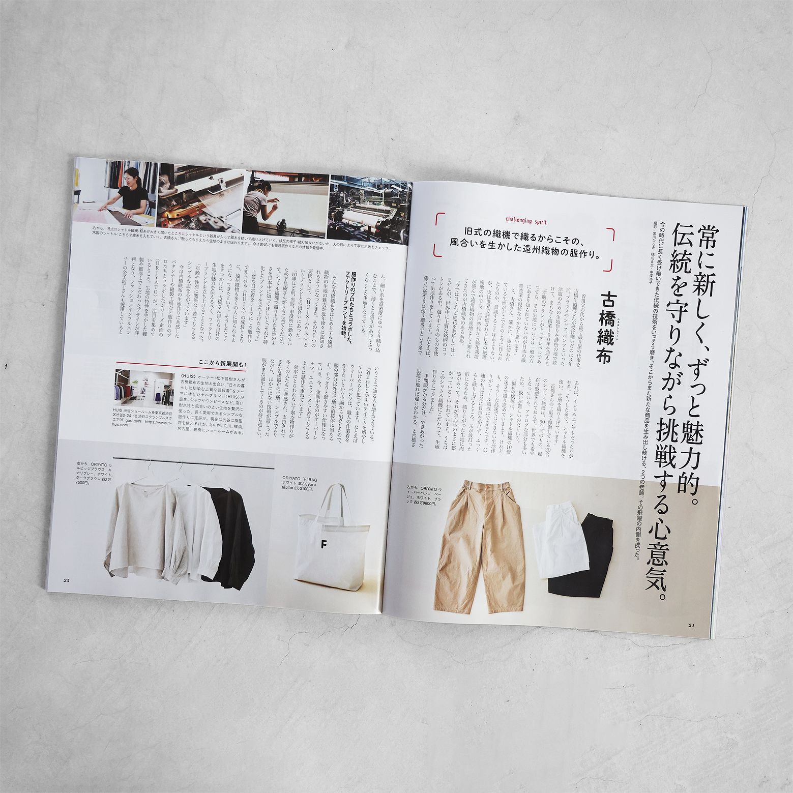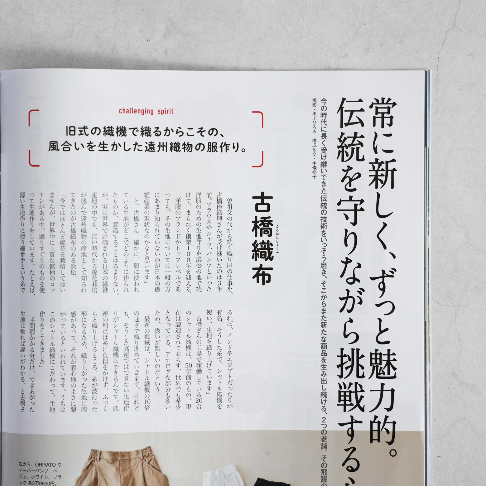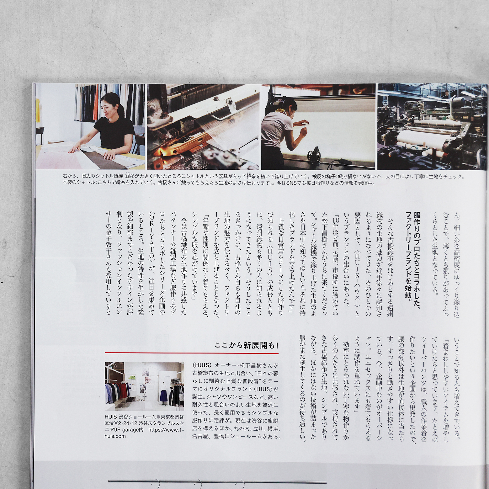 そんな老舗のひとつとして、創業1928年、まもなく創業100年を迎える「古橋織布」さんにご注目いただき、見開き1ページで大きく紹介いただいています。