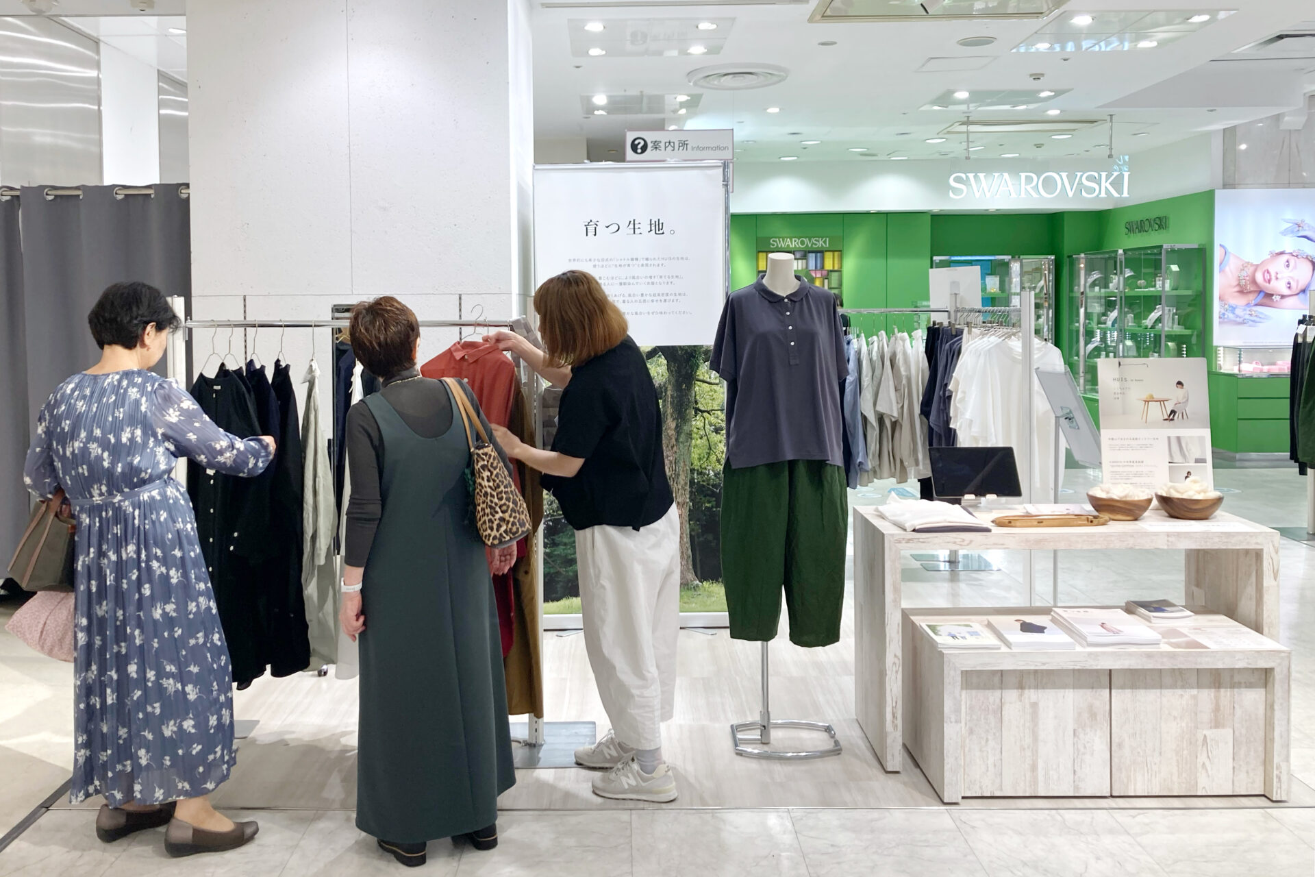 広くゆとりのある葵テラスいっぱいに遠州織物による風合い豊かなHUISの秋冬新作商品がたっぷりと並びます。人気のコーデュロイの商品もご覧いただけます。