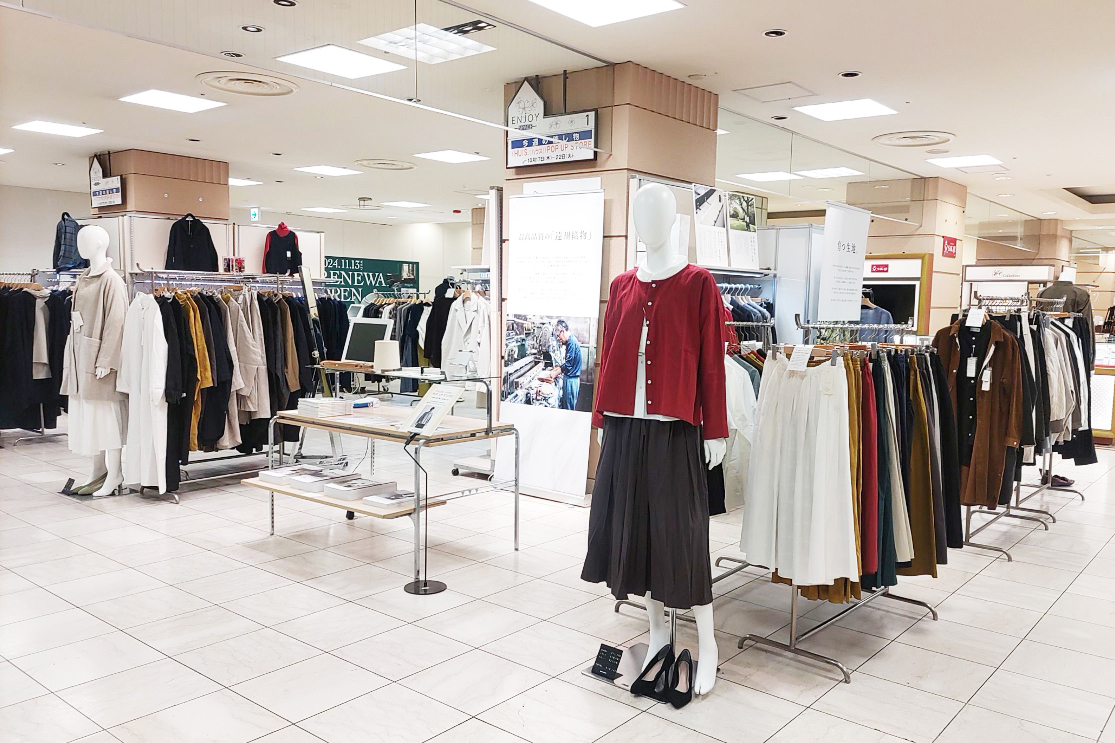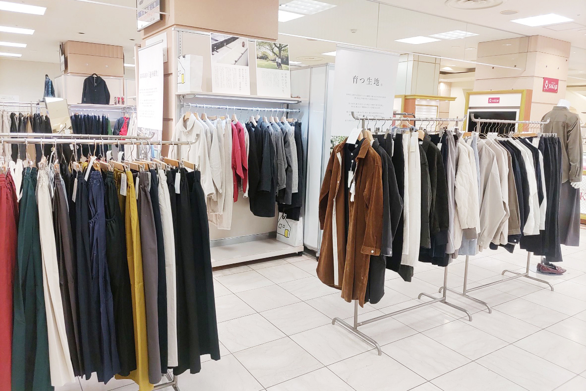 各地のPOPUPイベントでも好評いただいている、遠州の自然と職人が織りなすシャトルコーデュロイや秋冬の新作など豊富なラインナップがクレアモール沿いの西口入ってすぐのイベントスペースいっぱいに並びます。