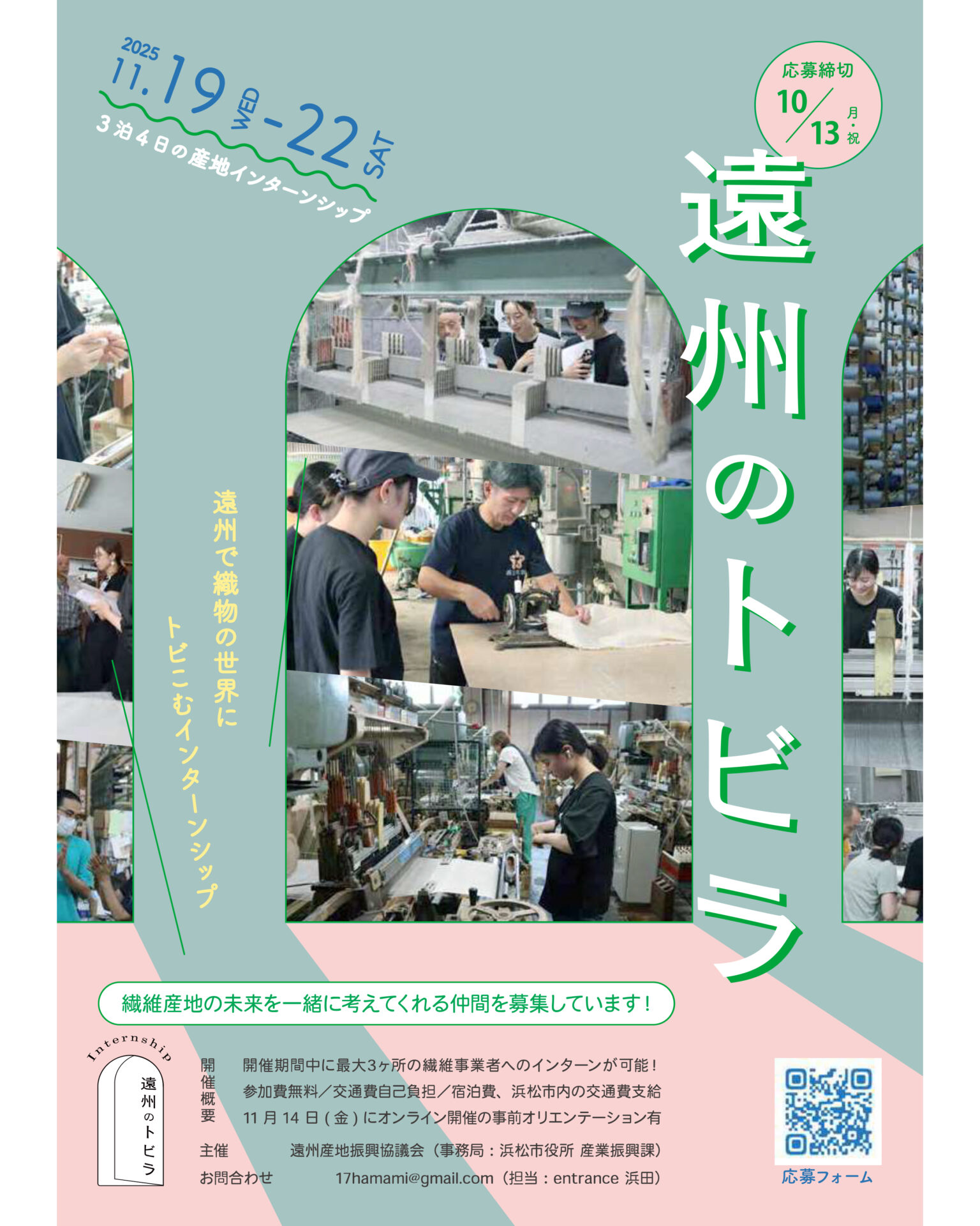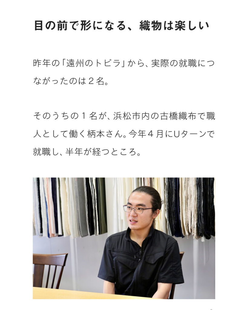 昨年「遠州のトビラ」に参加したことをきっかけに古橋織布さんに就職した若手職人さん、entrance代表浜田さん、受入事業者の浜名染色の尾上さんなど、さまざまな角度から遠州産地とインターンについてご紹介いただいています。