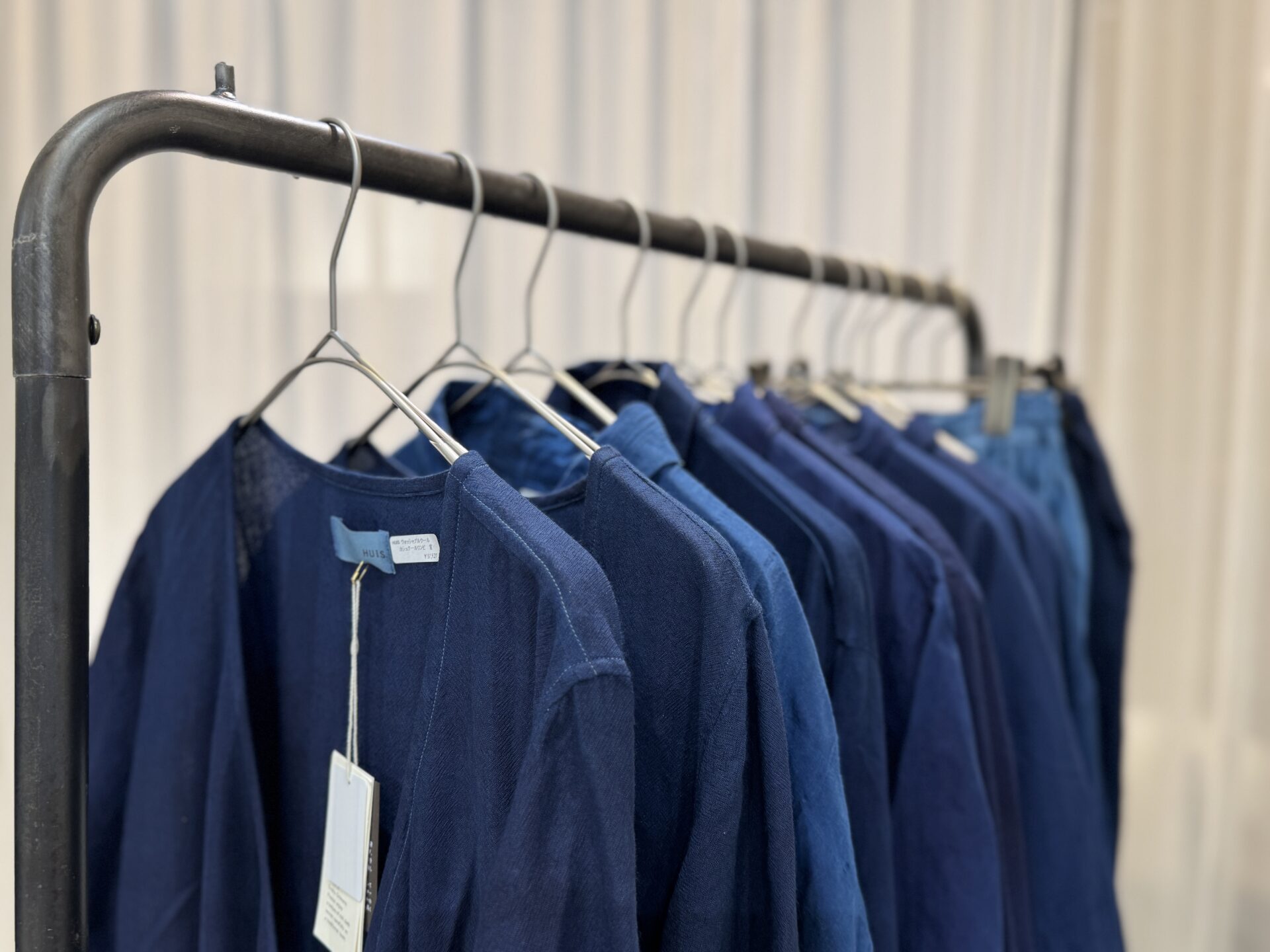 また、「暮らしのおへそ」一田憲子さんとのコラボレーションで生まれた特別限定生産の「【暮らしのおへそ一田さん×HUISコラボ】おへそリネンワンピース」の本藍染めも登場。
