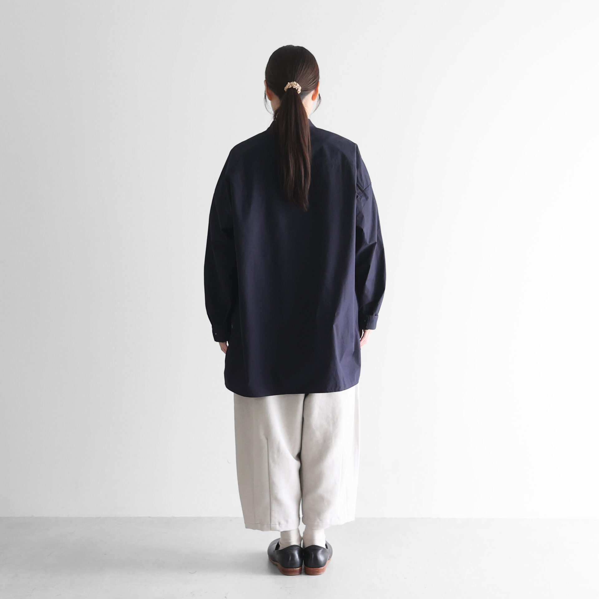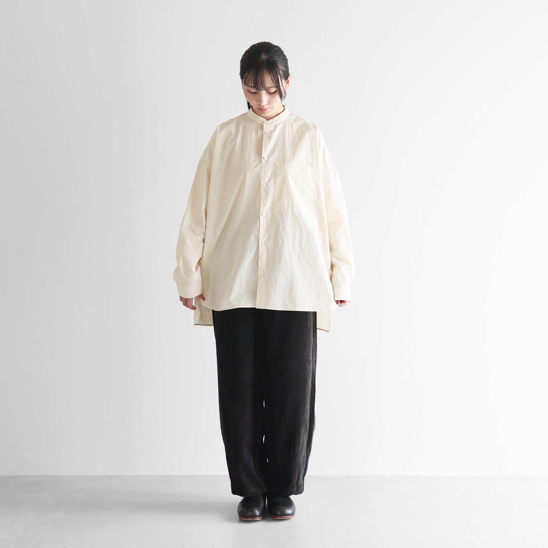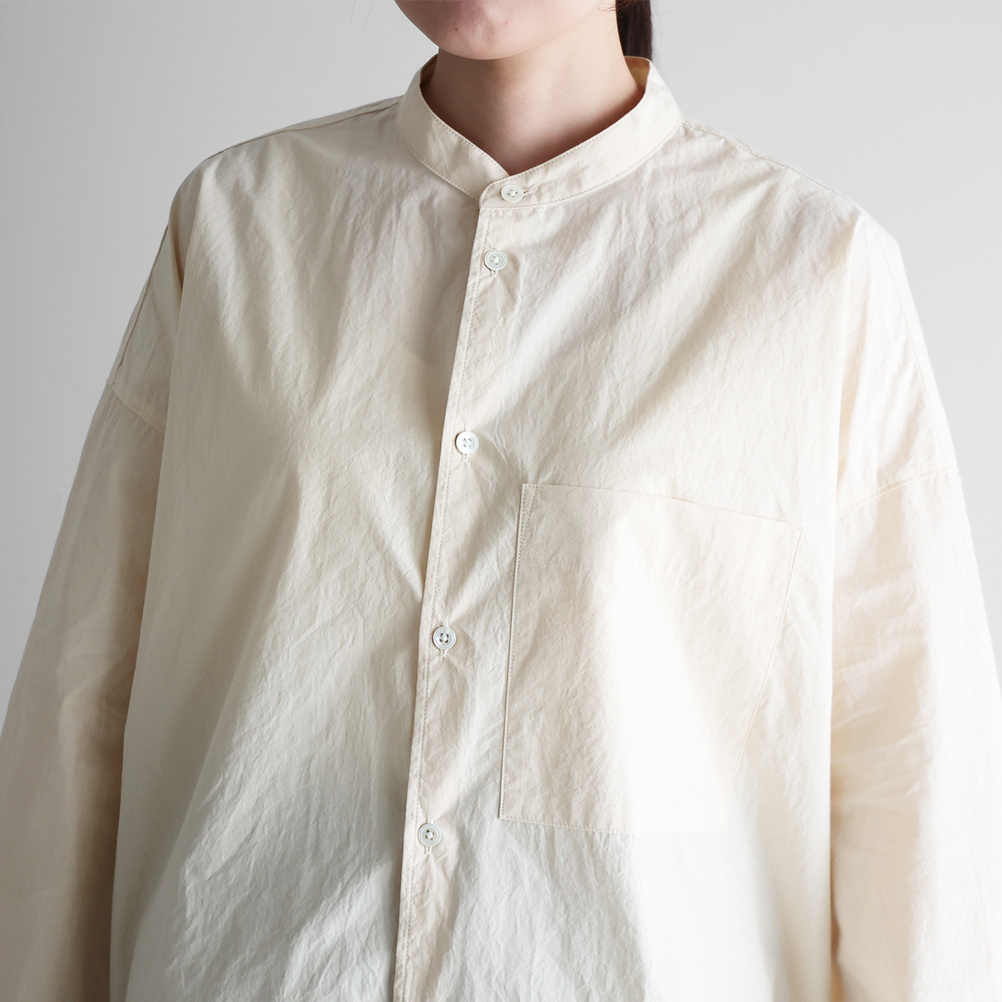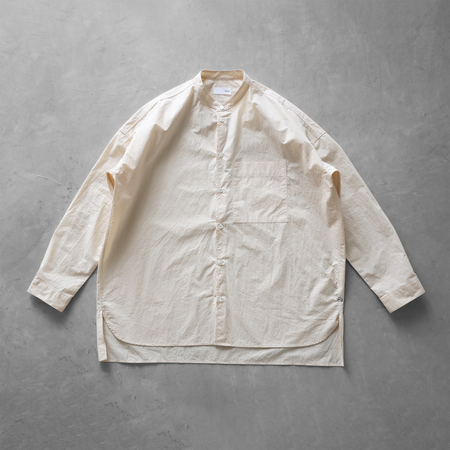 デザインは、身幅をたっぷりととったオーバーサイズのシャツで、バンドカラーのすっきりとしたデザインです。