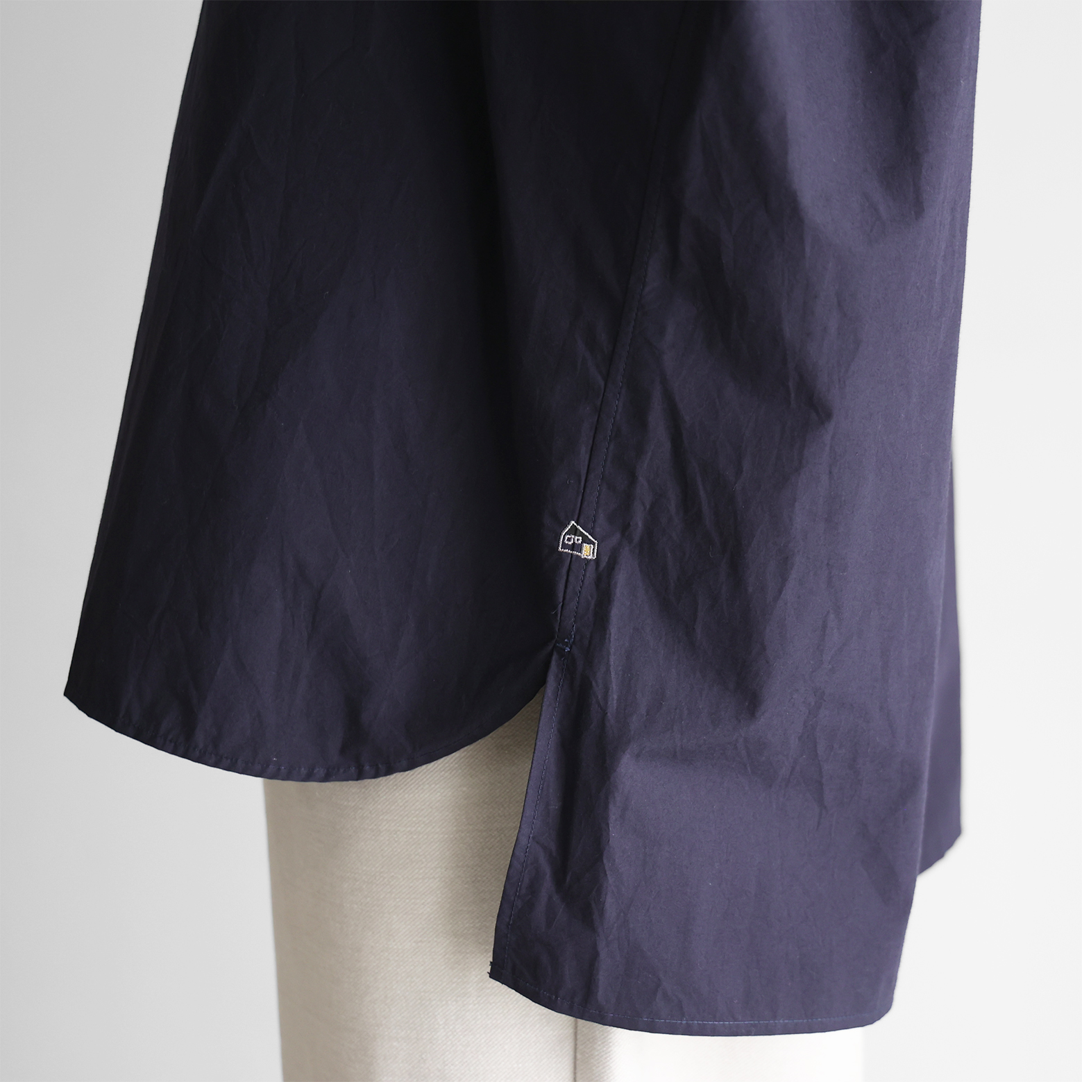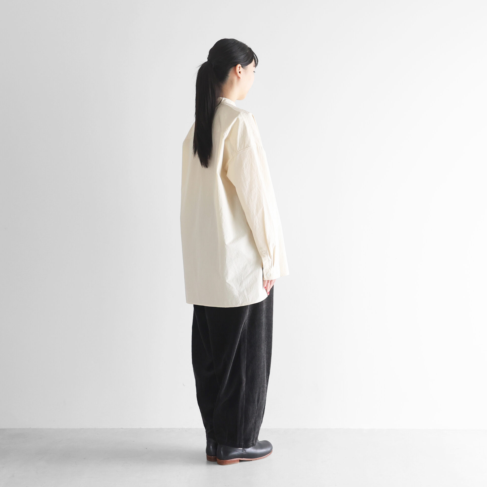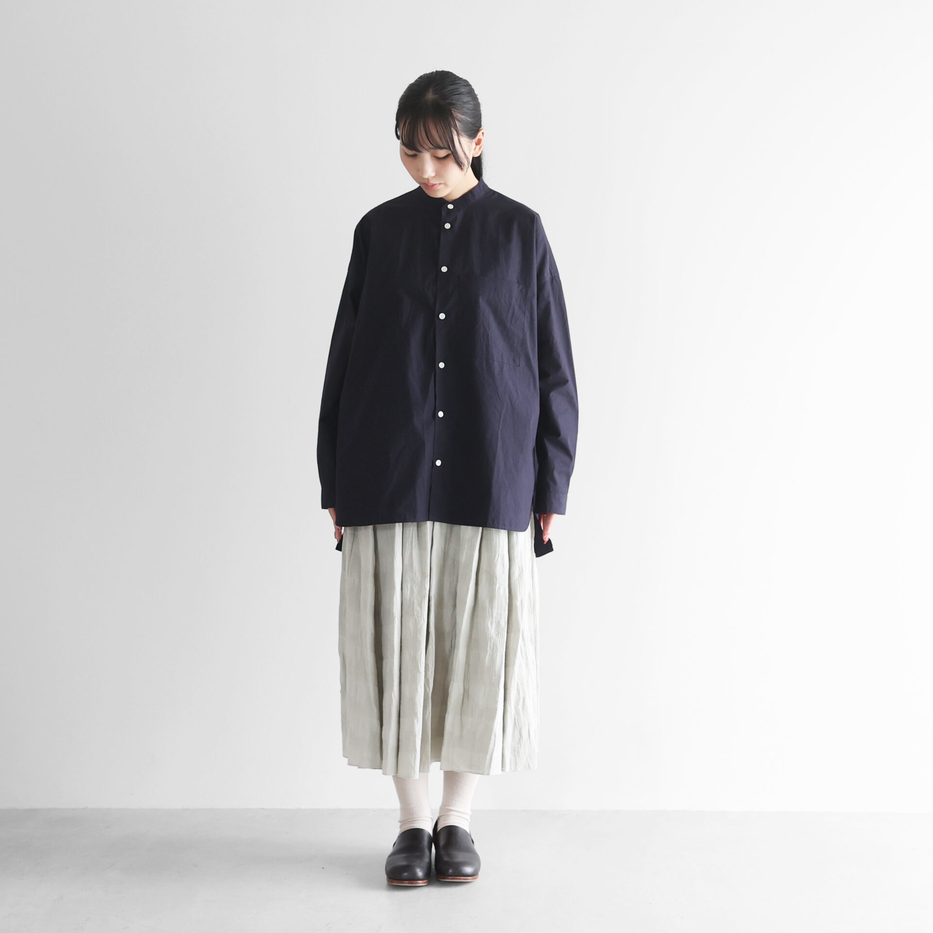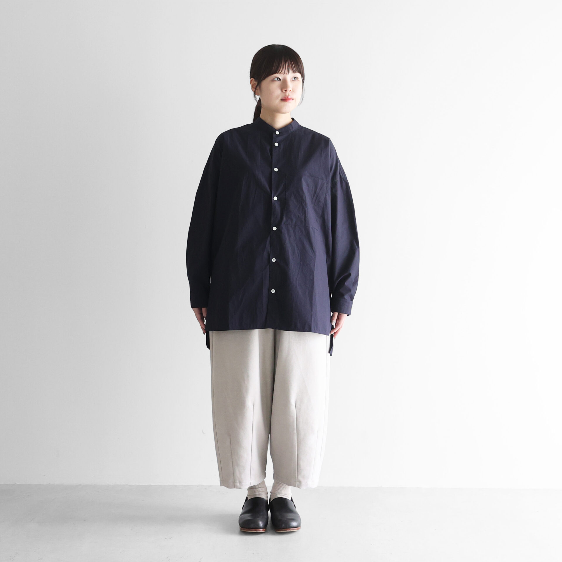 デザインは、身幅をたっぷりととったオーバーサイズのシャツで、バンドカラーのすっきりとしたデザインです。