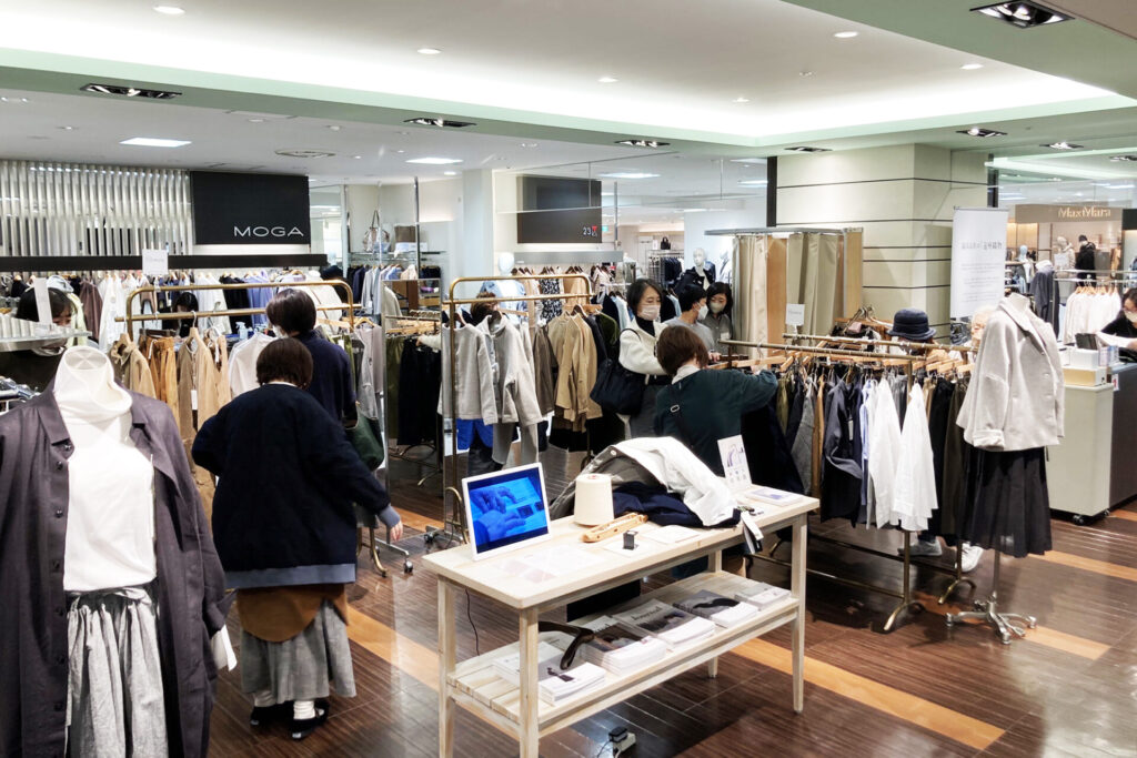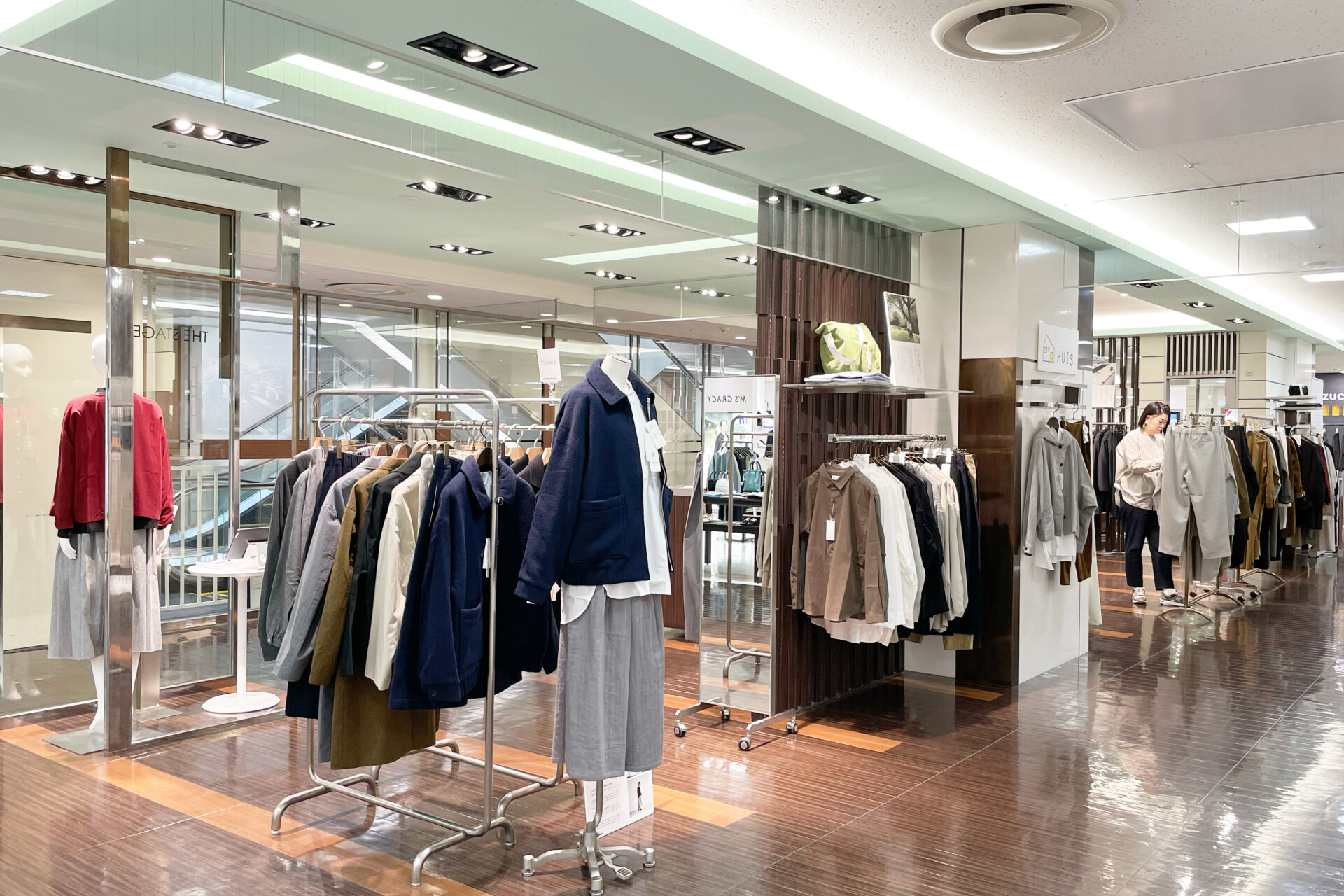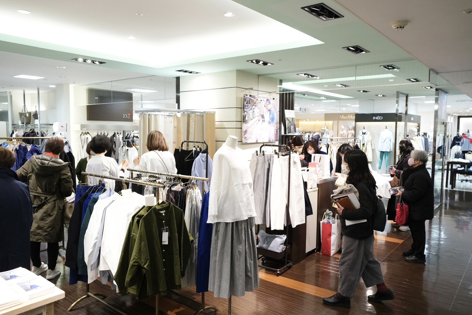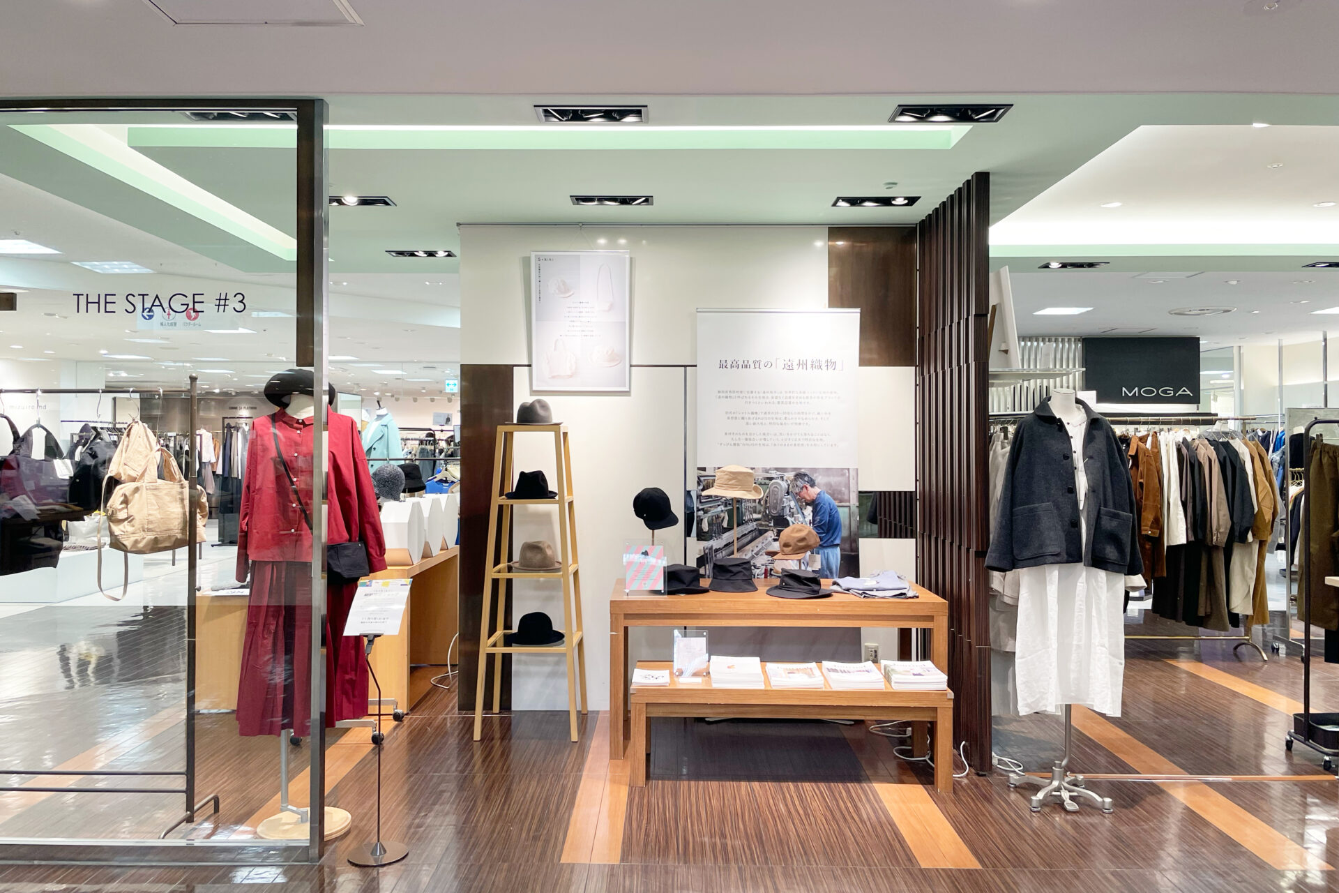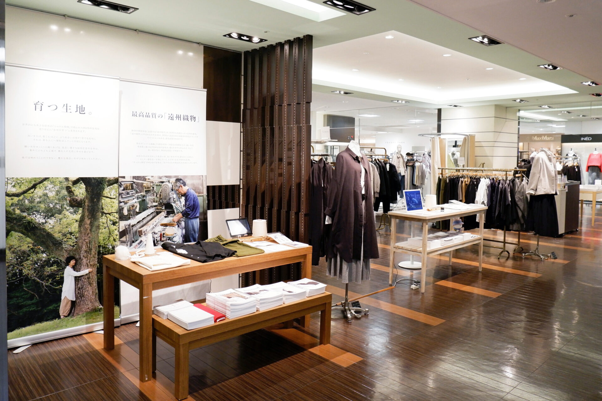 天然素材による着心地のいい遠州織物によるお洋服がエスカレーター横イベントスペースにたっぷりと並びます。