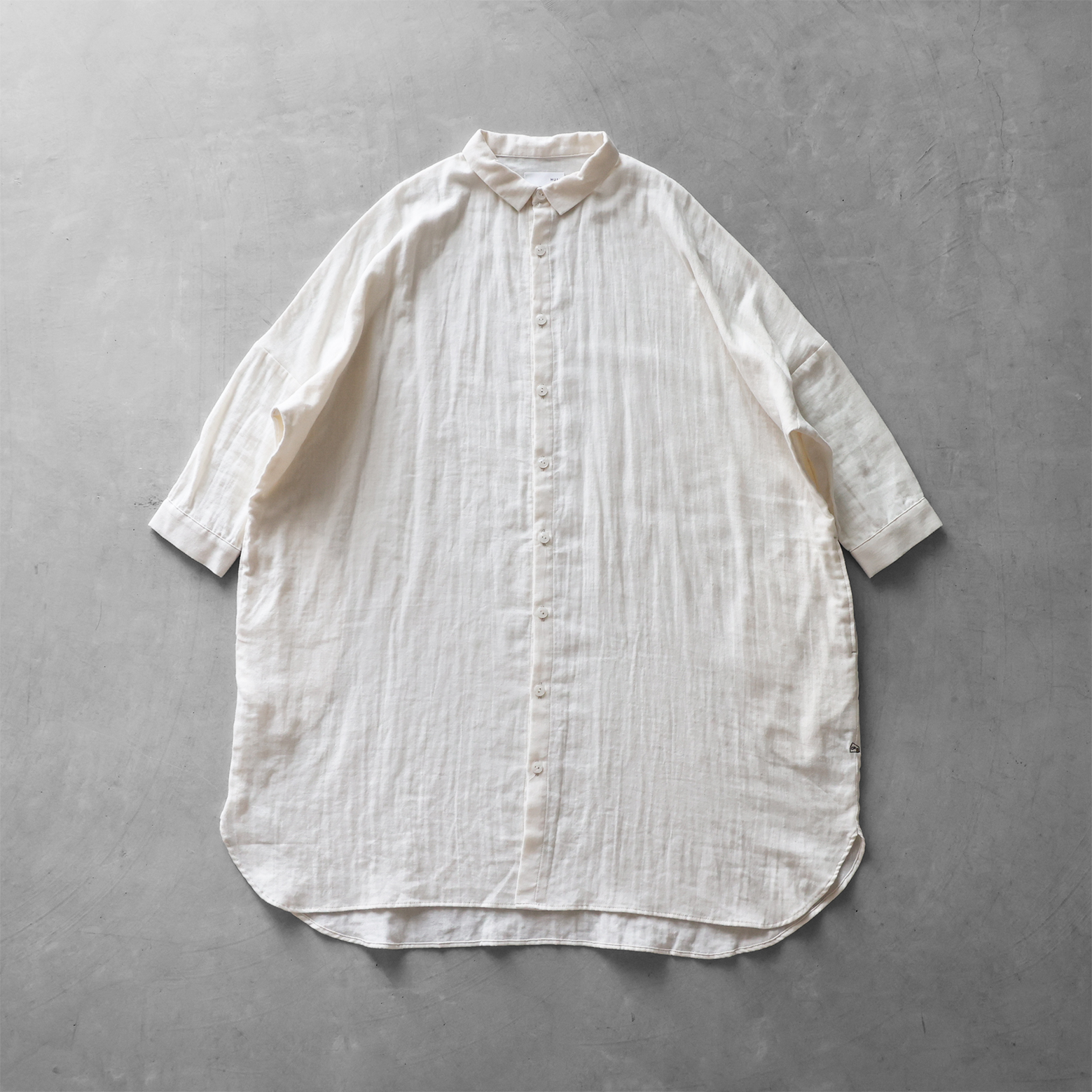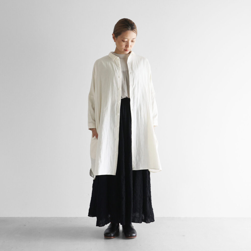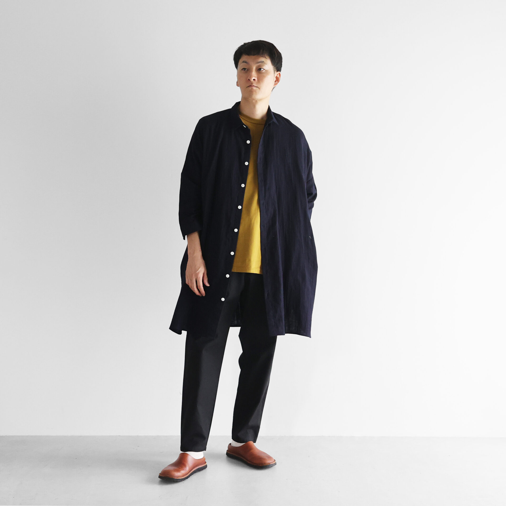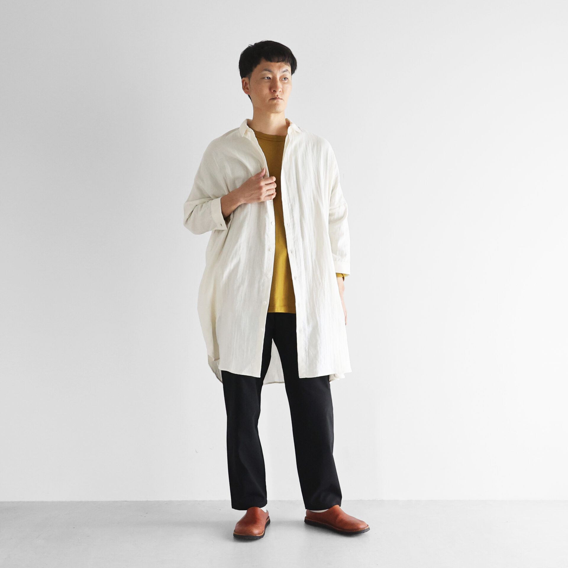 デザインは、身幅をたっぷりととったオーバーサイズのロングシャツで、どなたでもしっくりと馴染むサイズ感。アウター感覚で羽織って着ていただくこともできます。