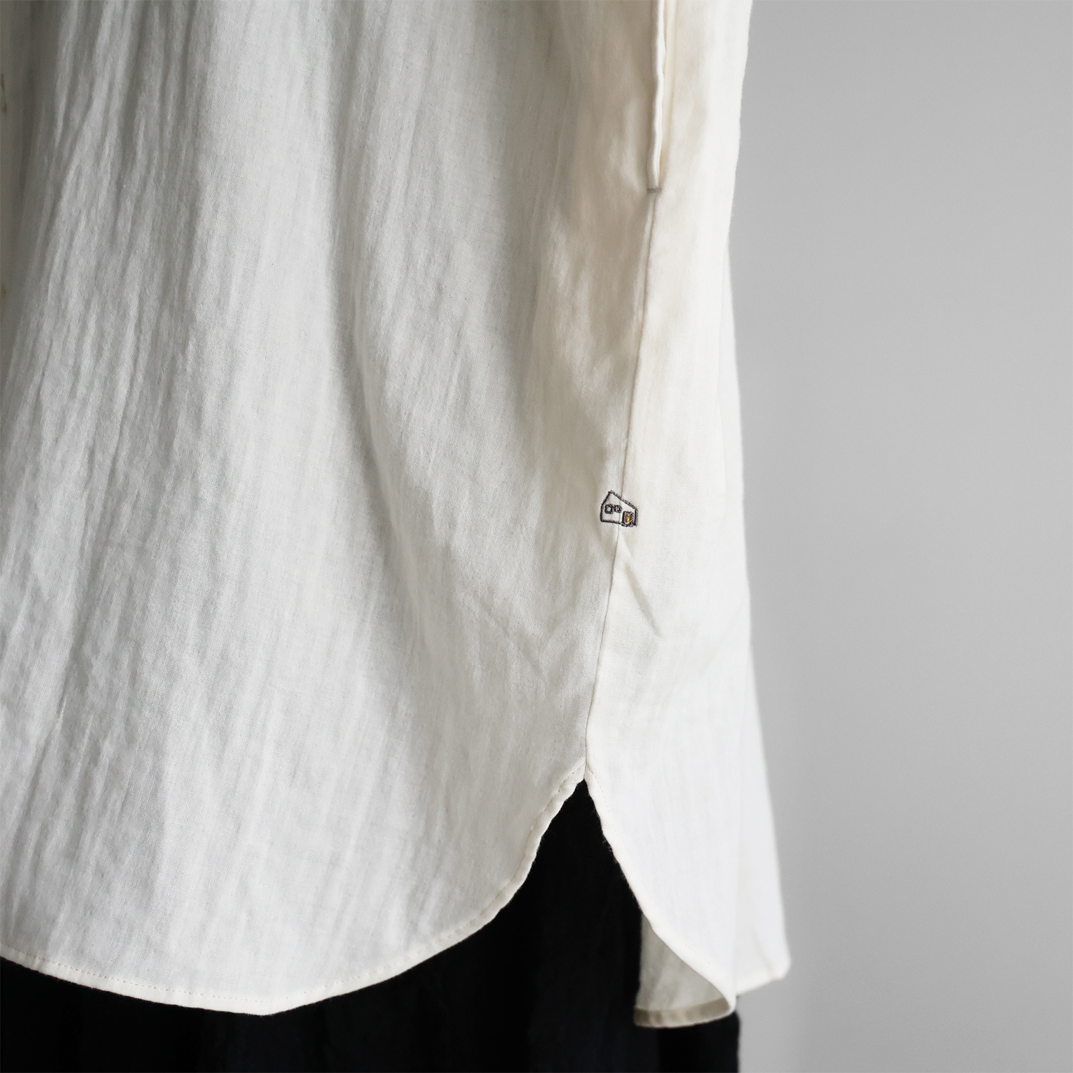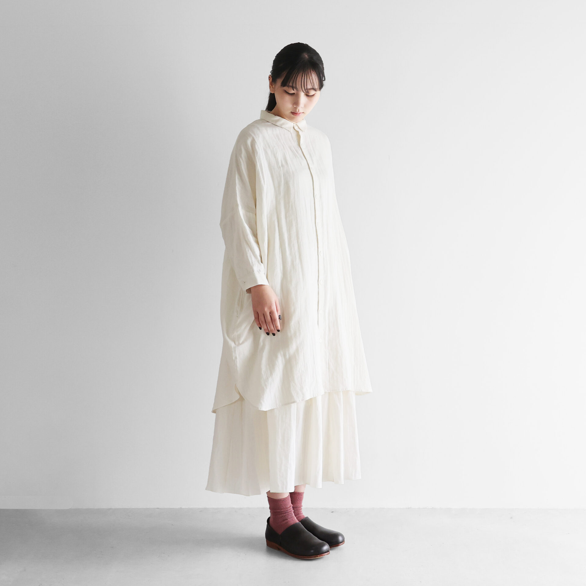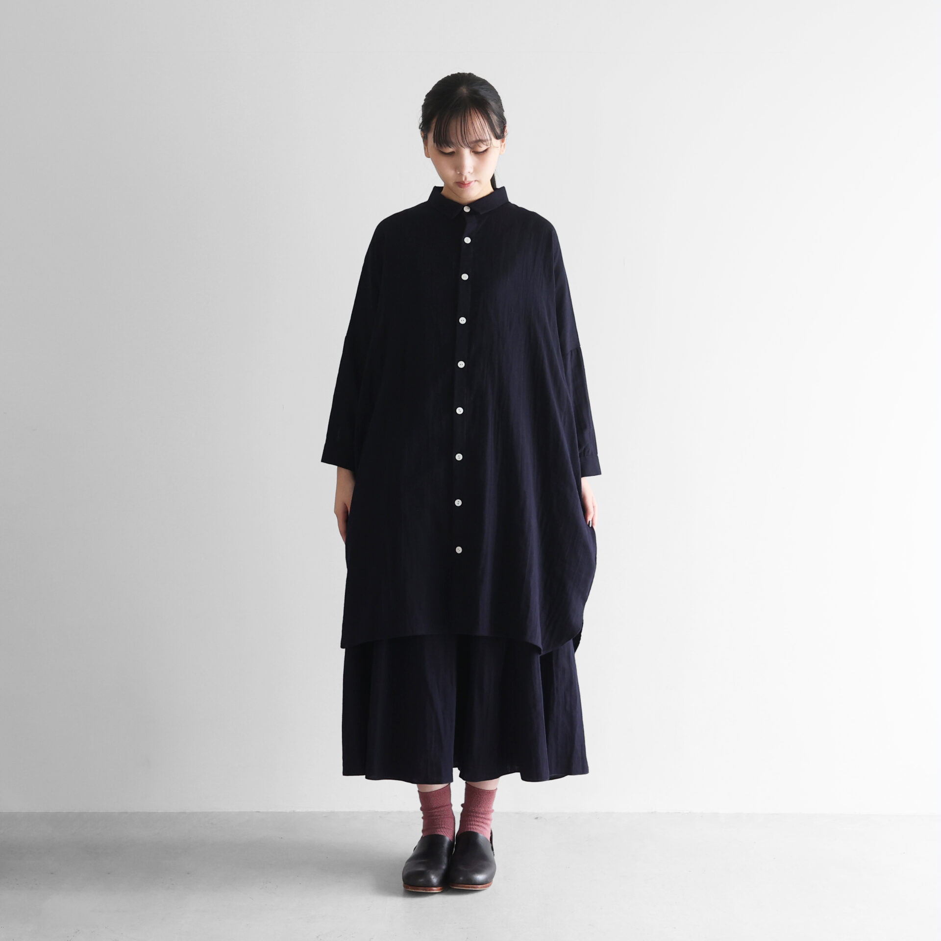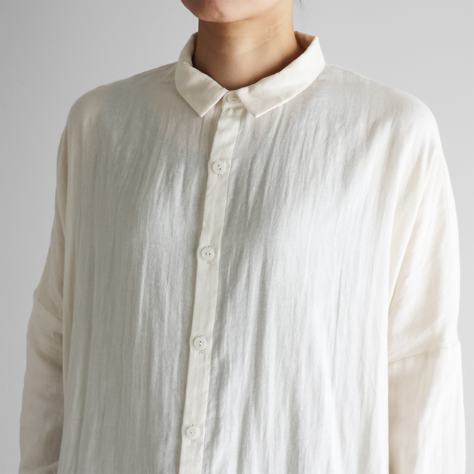 デザインは、身幅をたっぷりととったオーバーサイズのロングシャツで、どなたでもしっくりと馴染むサイズ感。アウター感覚で羽織って着ていただくこともできます。