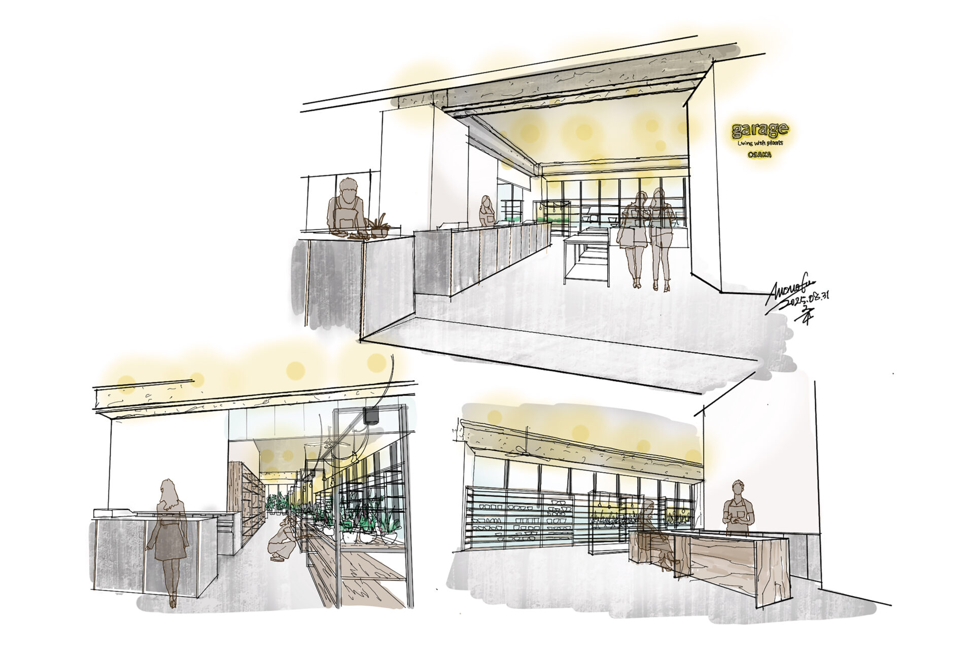 HUIS大阪ショールームがオープンするのは、「garage OSAKA」店舗入り口、通路に面した大変わかりやすい場所です。