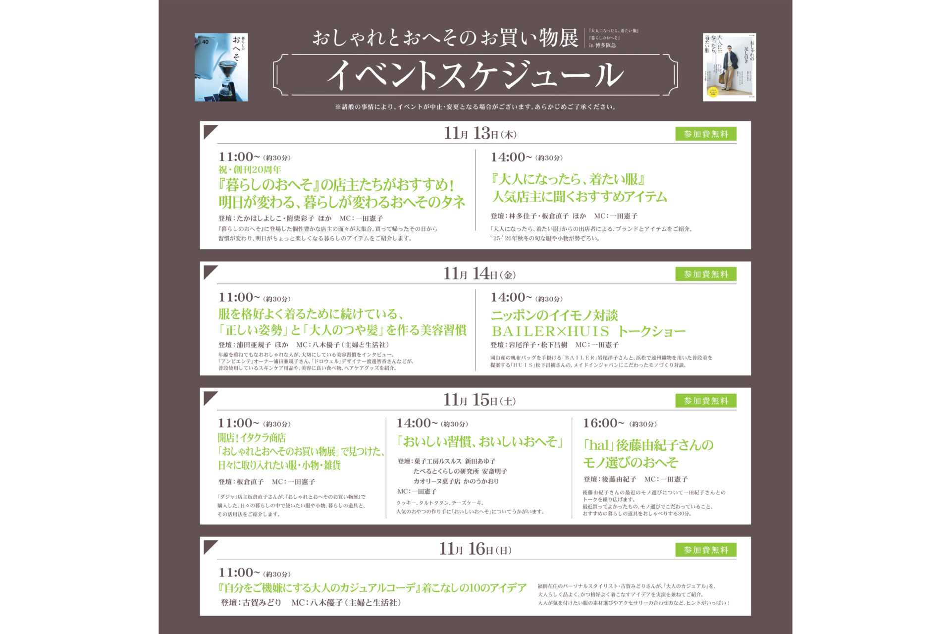 こちらのイベントはそれぞれの雑誌に登場するブランドや作り手さんが阪急博多に集結し、大人世代にぴったりの服と小物と出会えたり、毎日の習慣がちょっと変わる器や雑貨を手に入れたりと、「おしゃれとおへそのお買い物」を楽しめる特別な5日間。