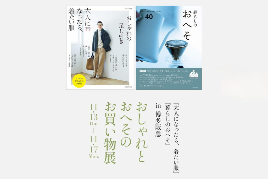 こちらのイベントはそれぞれの雑誌に登場するブランドや作り手さんが阪急博多に集結し、大人世代にぴったりの服と小物と出会えたり、毎日の習慣がちょっと変わる器や雑貨を手に入れたりと、「おしゃれとおへそのお買い物」を楽しめる特別な5日間。