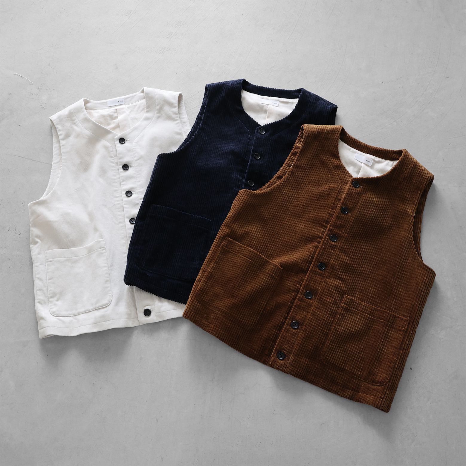 また、今回のプロジェクトのために、HUISでは初めてシャトルコーデュロイによるベストを特別に企画生産しました。