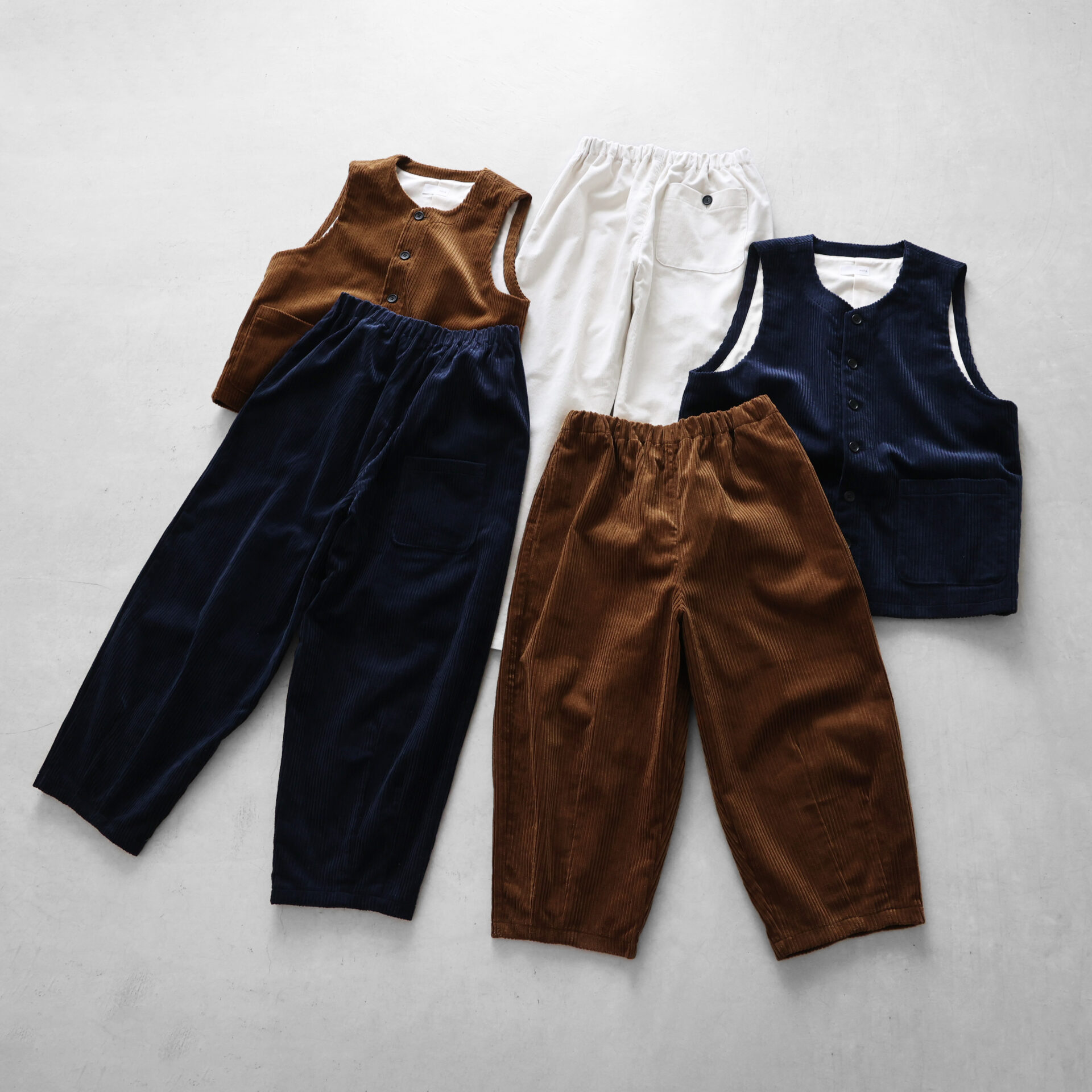 貴重な国産コーデュロイ、そして、遠州の先人たちが築き上げた「コール天」の存在を伝え、より多くの方に遠州の誇りとその着心地の良さを味わっていただきたく、シャトルコーデュロイを贅沢に使用した、ベストとパンツを作りました。