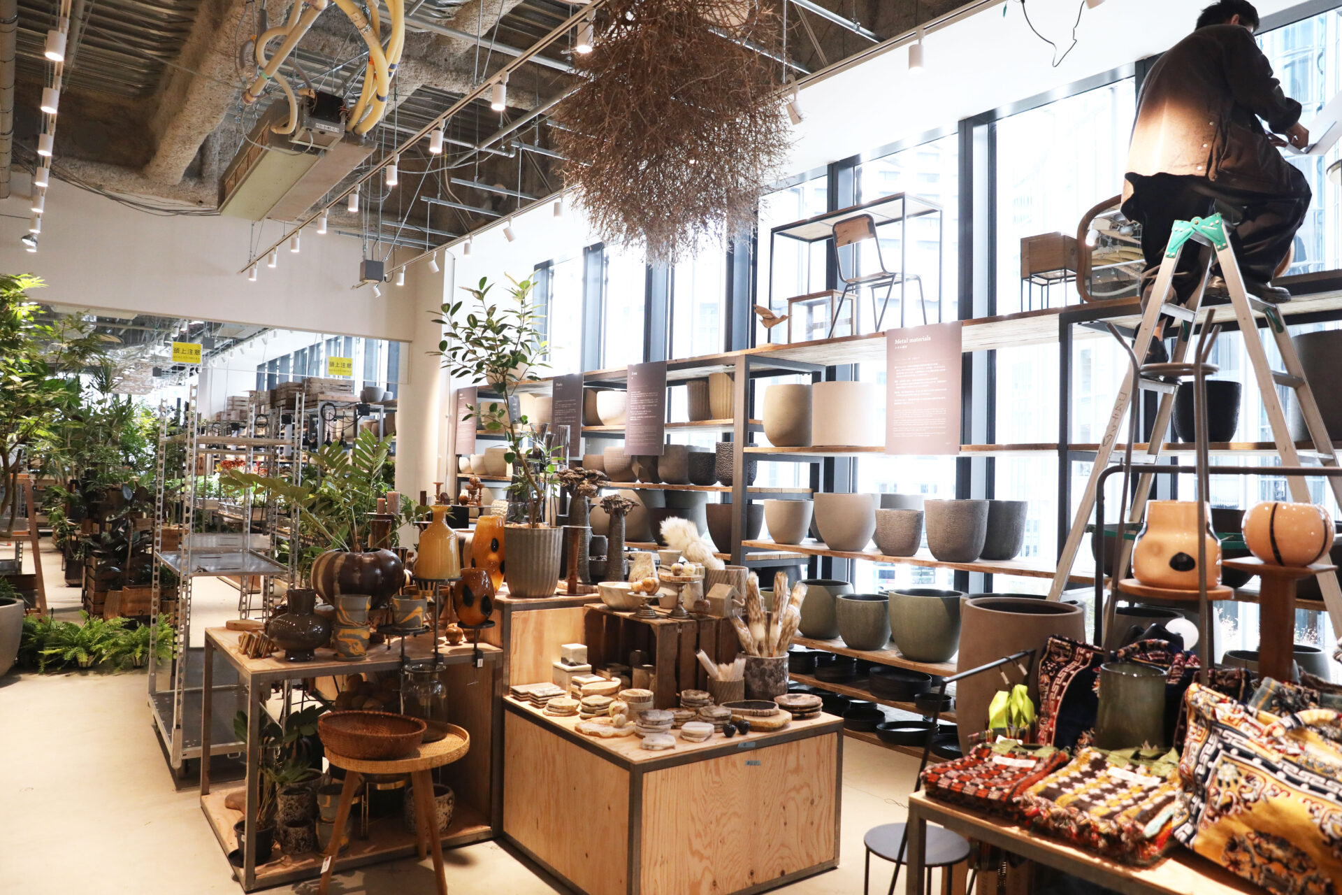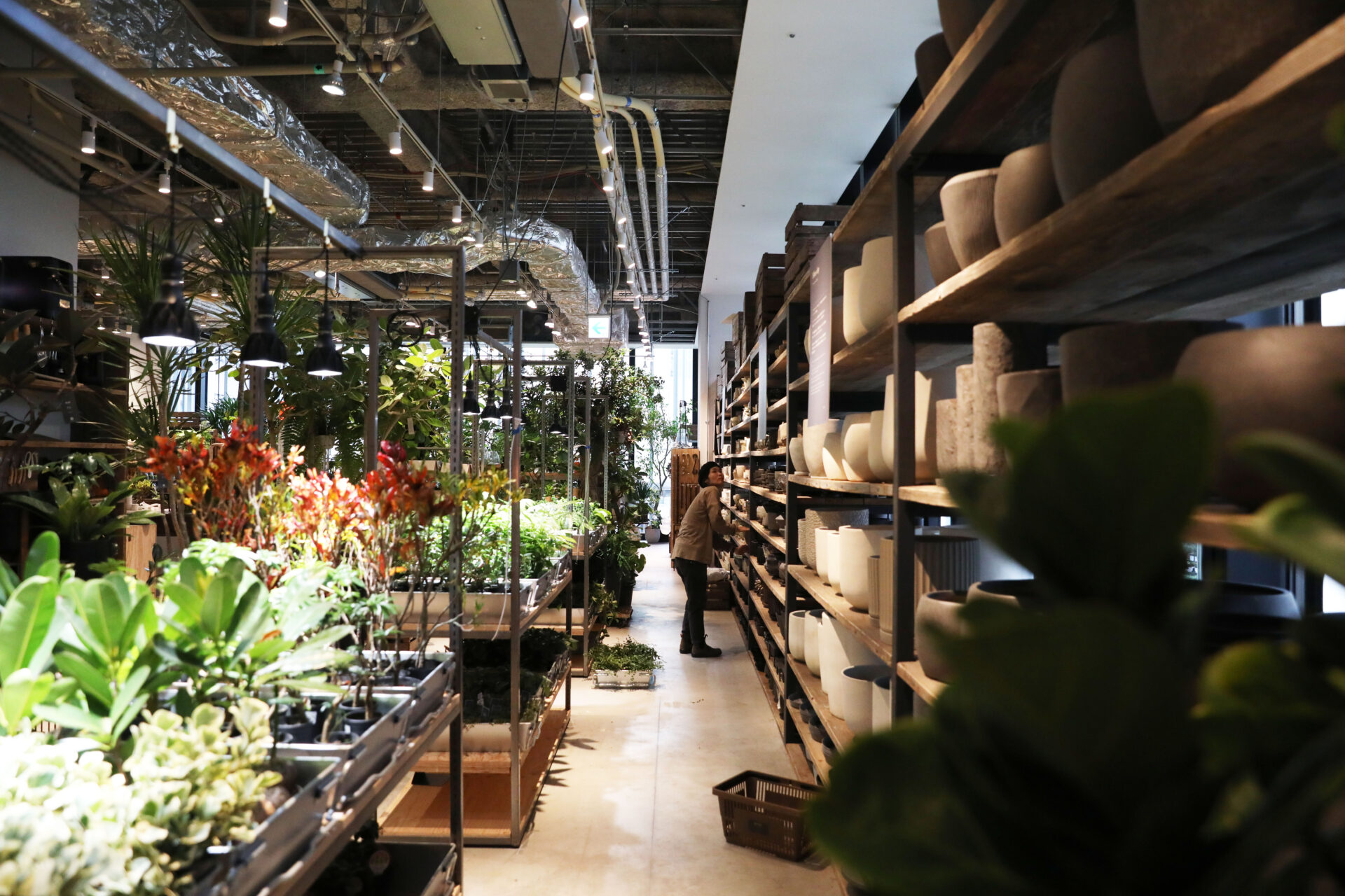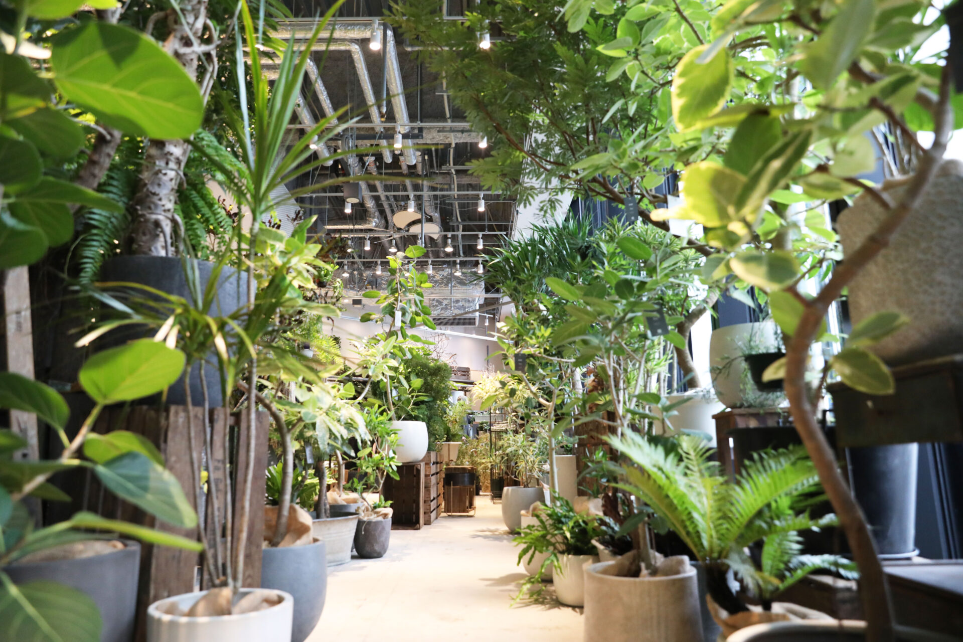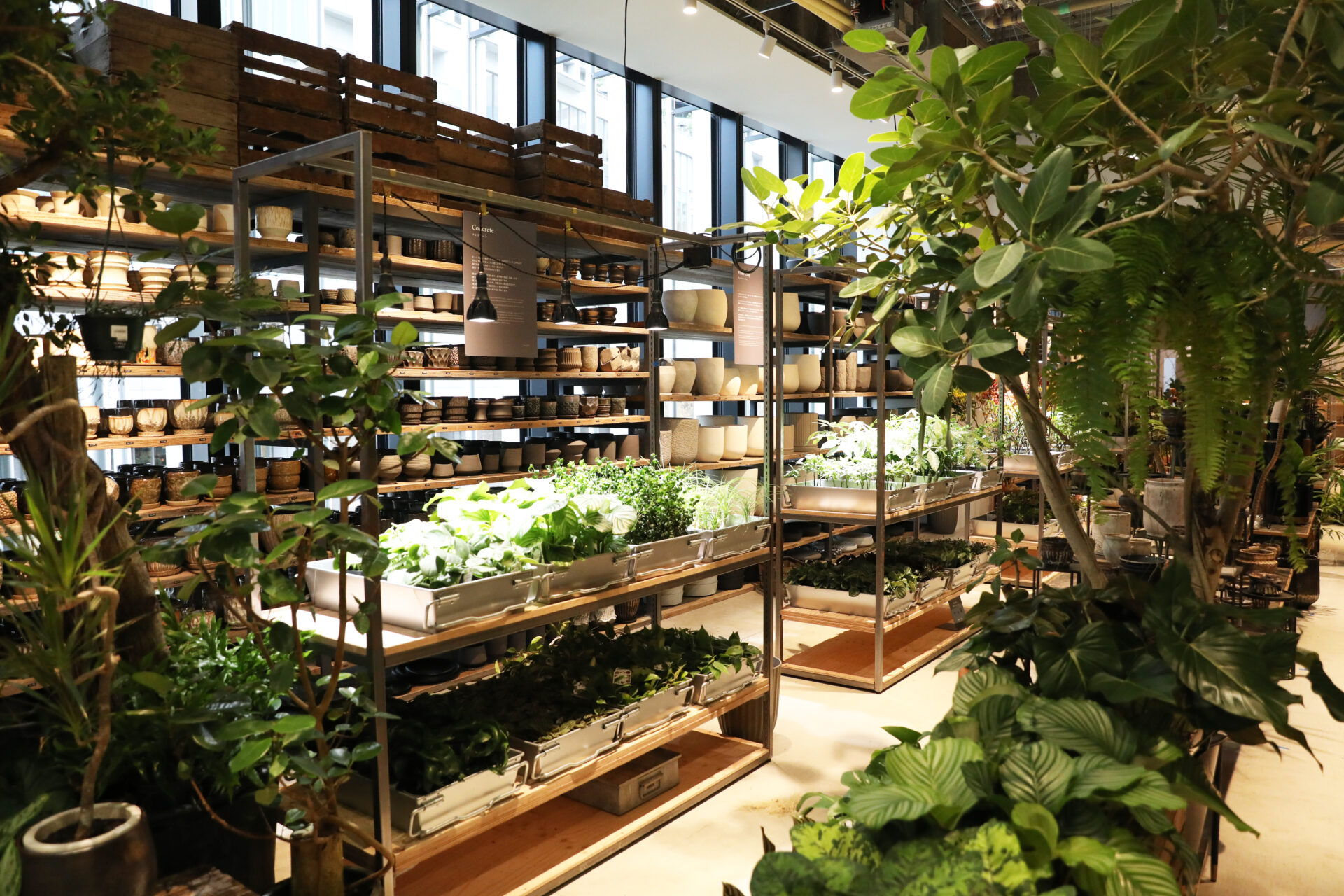 自然光がたっぷりと降り注ぐ大空間に、garageさんセレクトの個性豊かな植物や雑貨が所狭しと並びます。
