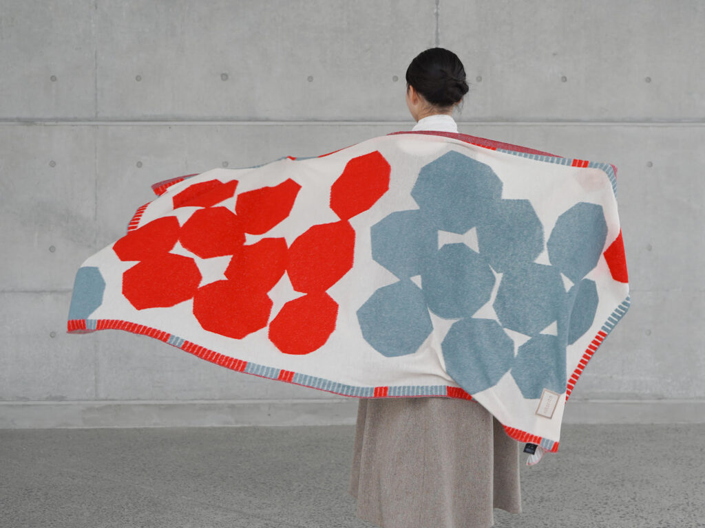 軽くてあたたかく、持ち運びにも便利な軽やかに首もとを包むスヌード「sora」シリーズの新色や、上杉家の城下町・米沢に今も残る「お堀」から着想を得たストール「oh.hori」など、山形米沢ならではの美しさが込められた新作アイテムが多数並びます。