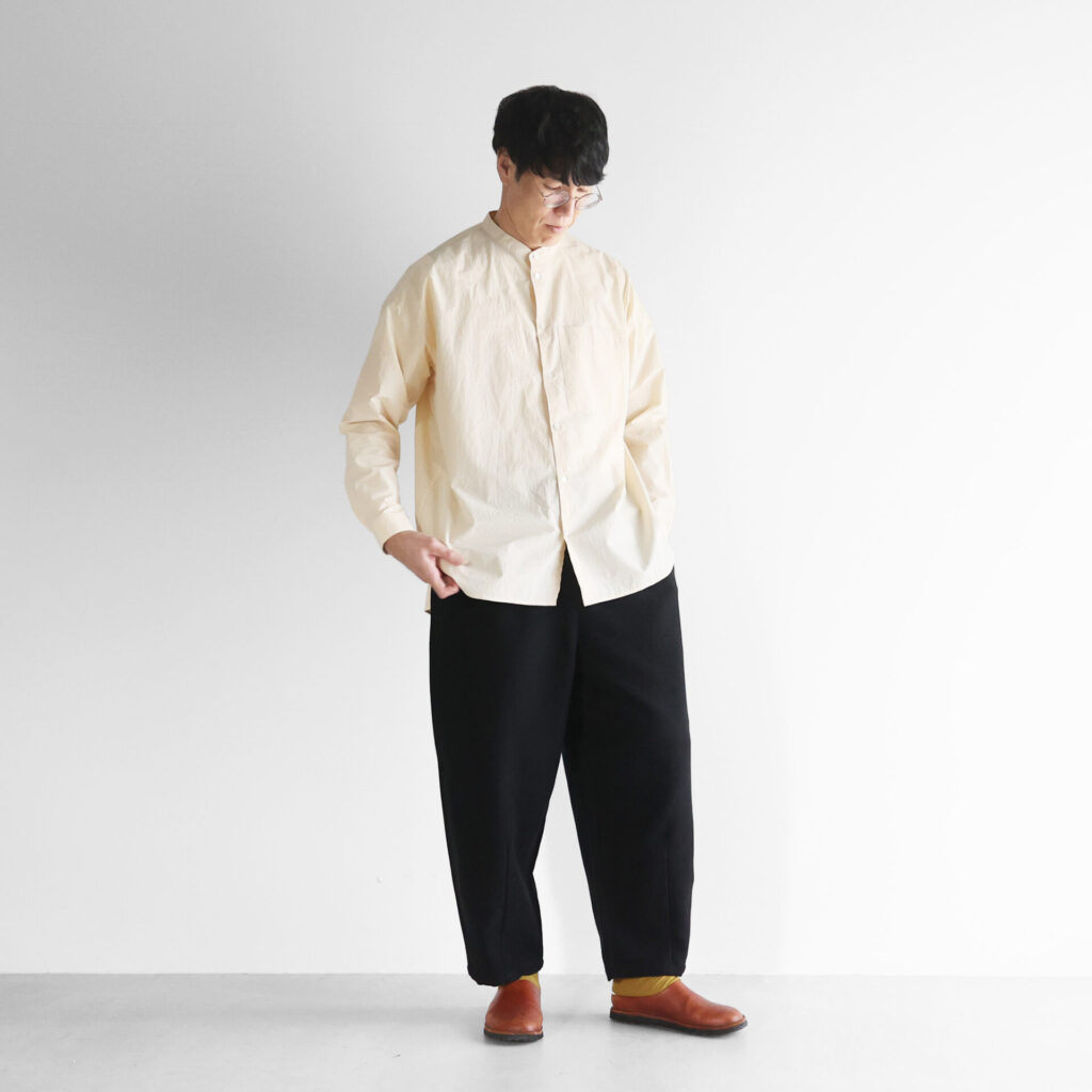もも周りにたっぷりと生地を使用したバルーンパンツで、裾に向けてテーパードがかかったきれいなラインのシルエットです。定番のバルーンパンツのフルレングス版で、少しロールアップして履いていただくと調整がしやすい丈感。男性の方にもおすすめです。右後ろについた下がり気味のポケットがポイント。
