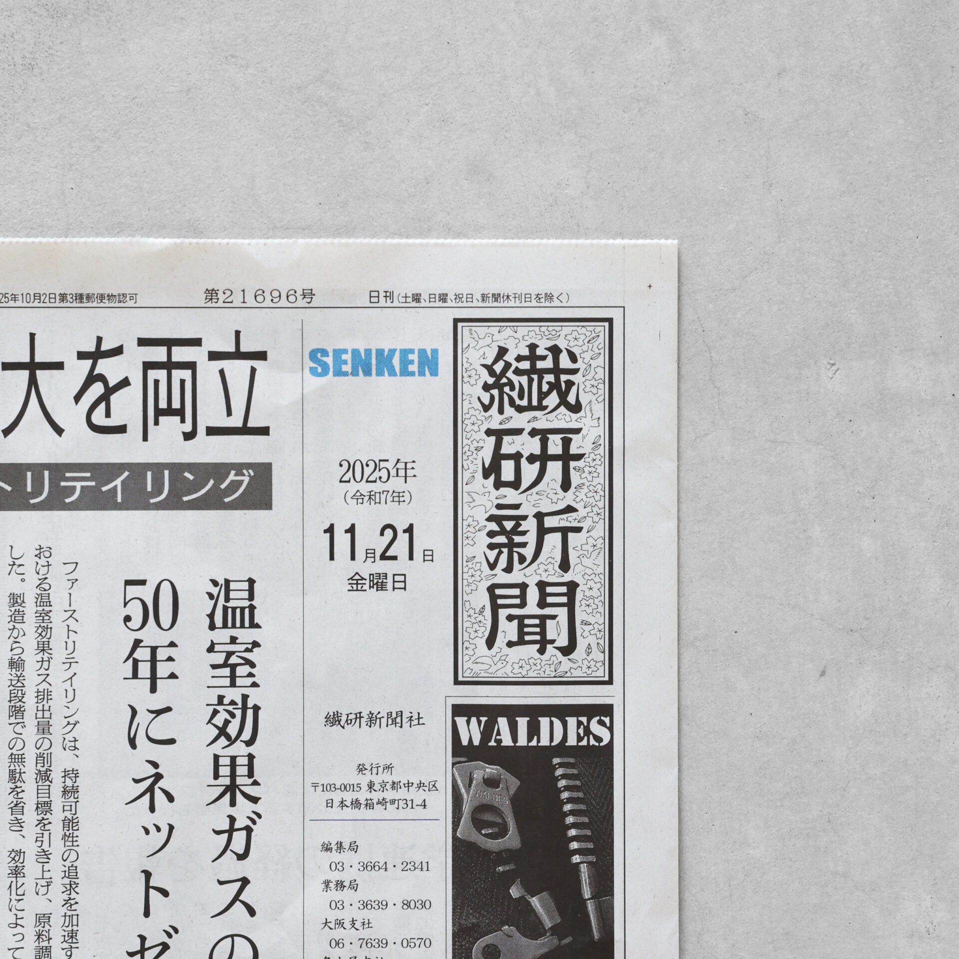 11/21付けの繊研新聞さんに柴咲コウさんの全国ツアー「KO SHIBASAKI LIVE TOUR 2025 ACTOR’S THE BEST 〜邂逅〜」浜松公演限定で販売されるコラボハンカチの制作販売についてや「遠州織物✕久留女木の棚田プロジェクト」がグッドデザインしずおか2025大賞(知事賞)を受賞したことを掲載いただきました。