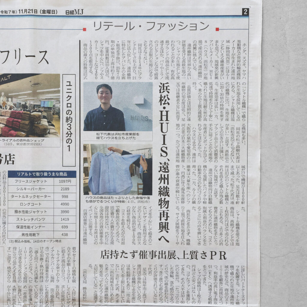 HUISでは、希少な遠州織物を使った服づくりを続けるためにさまざまな面で工夫をしています。