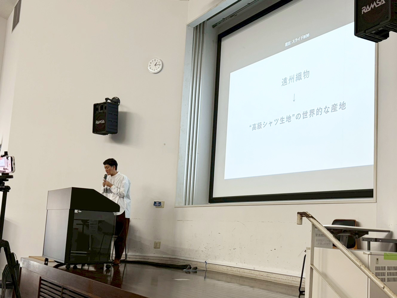 10/31(金)、デザイン学部の授業の一環として弊社代表松下にお声がけいただき、デザイン学部デザイン学科所属の2〜4年生約60名を対象に「”遠州織物”から紐解く浜松の地域産業とブランディング」というテーマで講義を行いました。