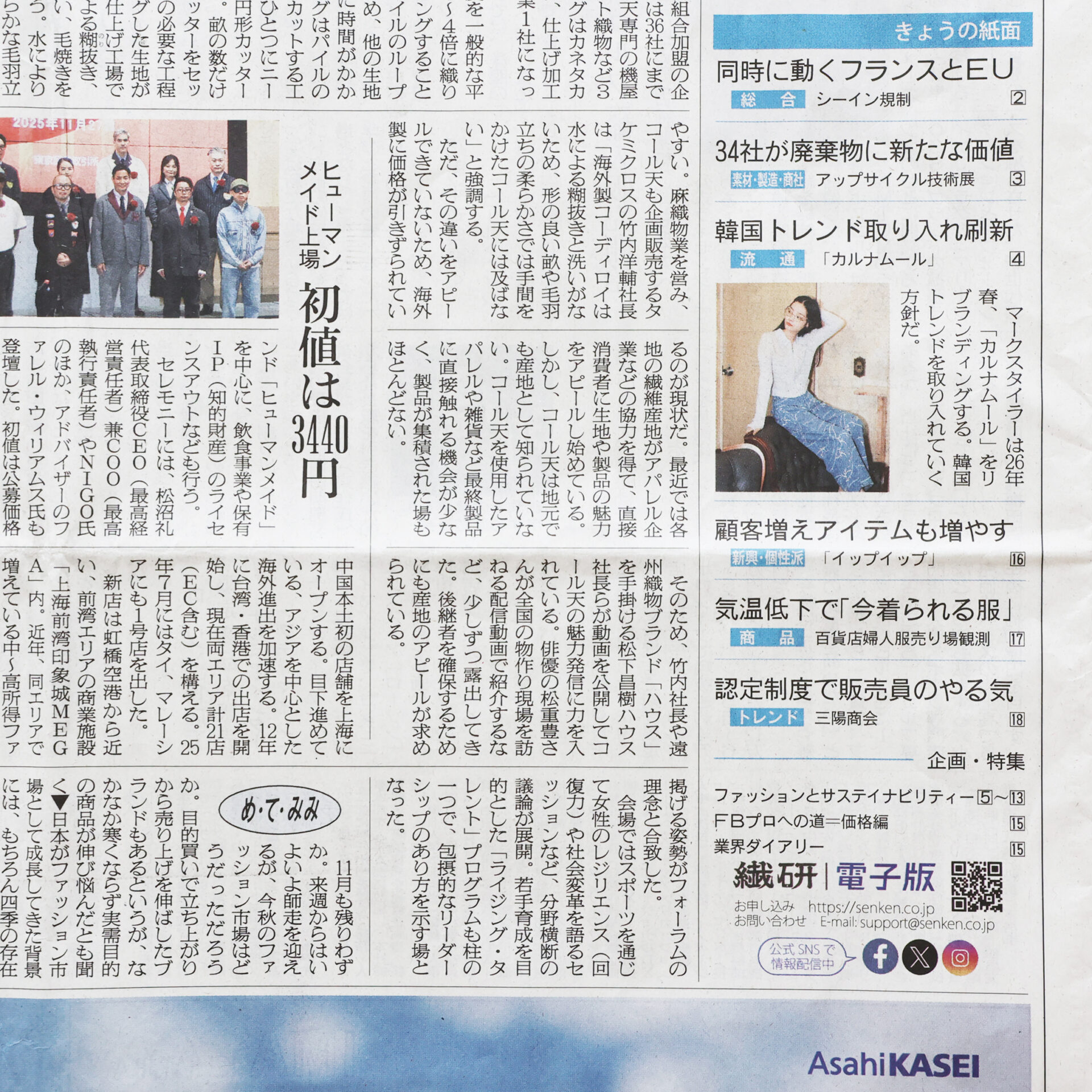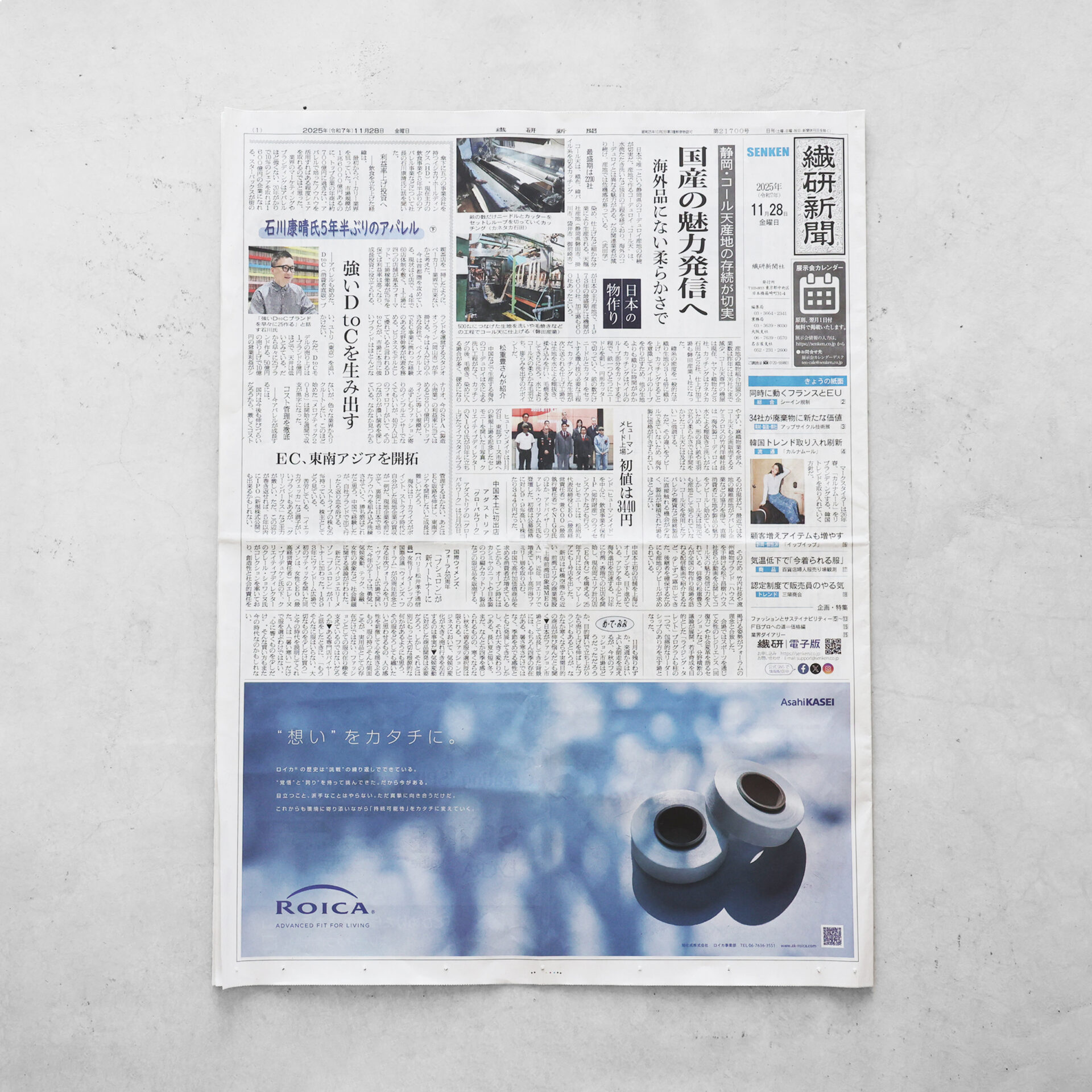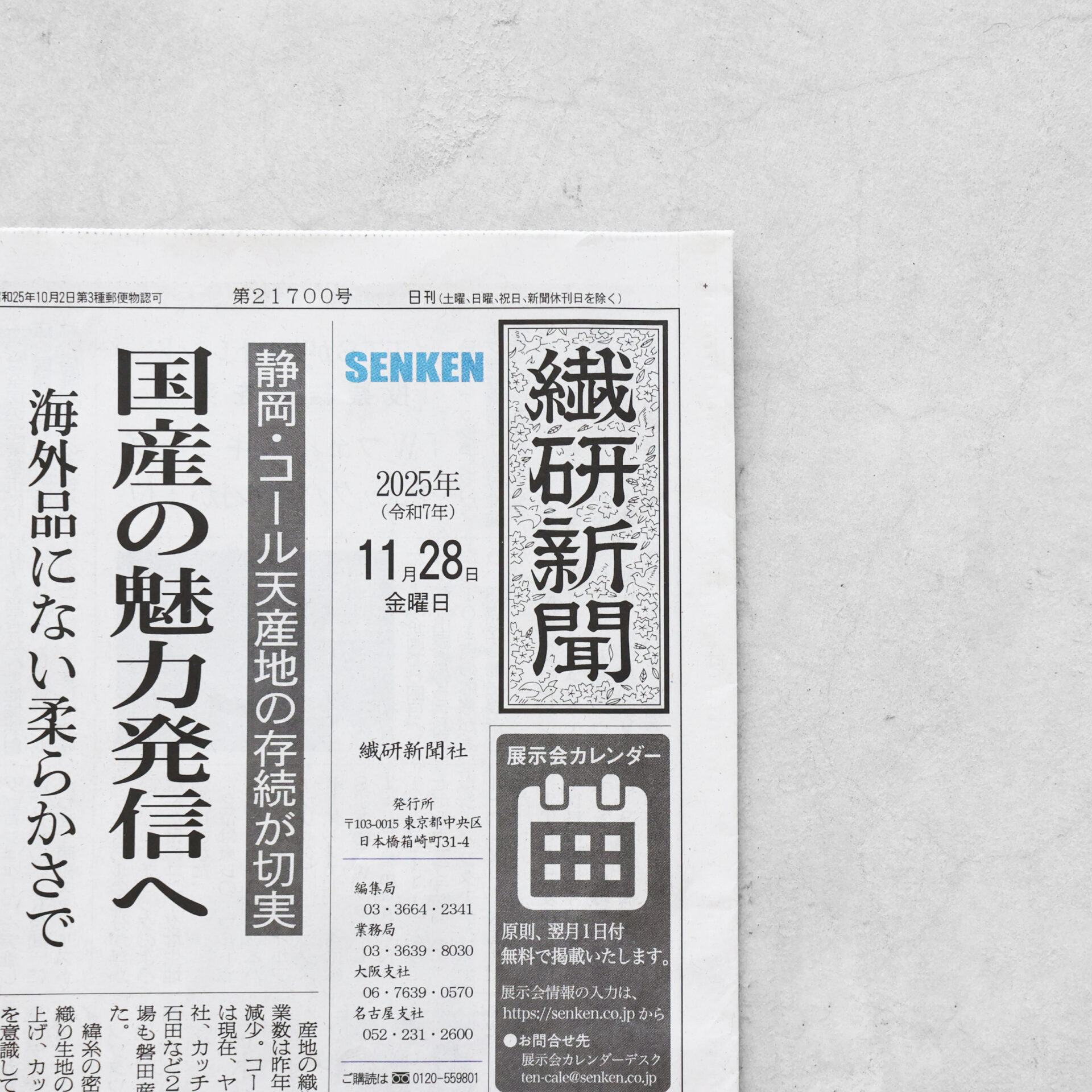 取材では、コール天がなぜ特別な生地なのか、そして現在ほんのわずかとなってしまった機屋さん・加工場さんのことなども丁寧に触れていただいています。国内コーデュロイ=コール天を守り続ける産地の姿を、より多くの方に知っていただける機会になりました。
