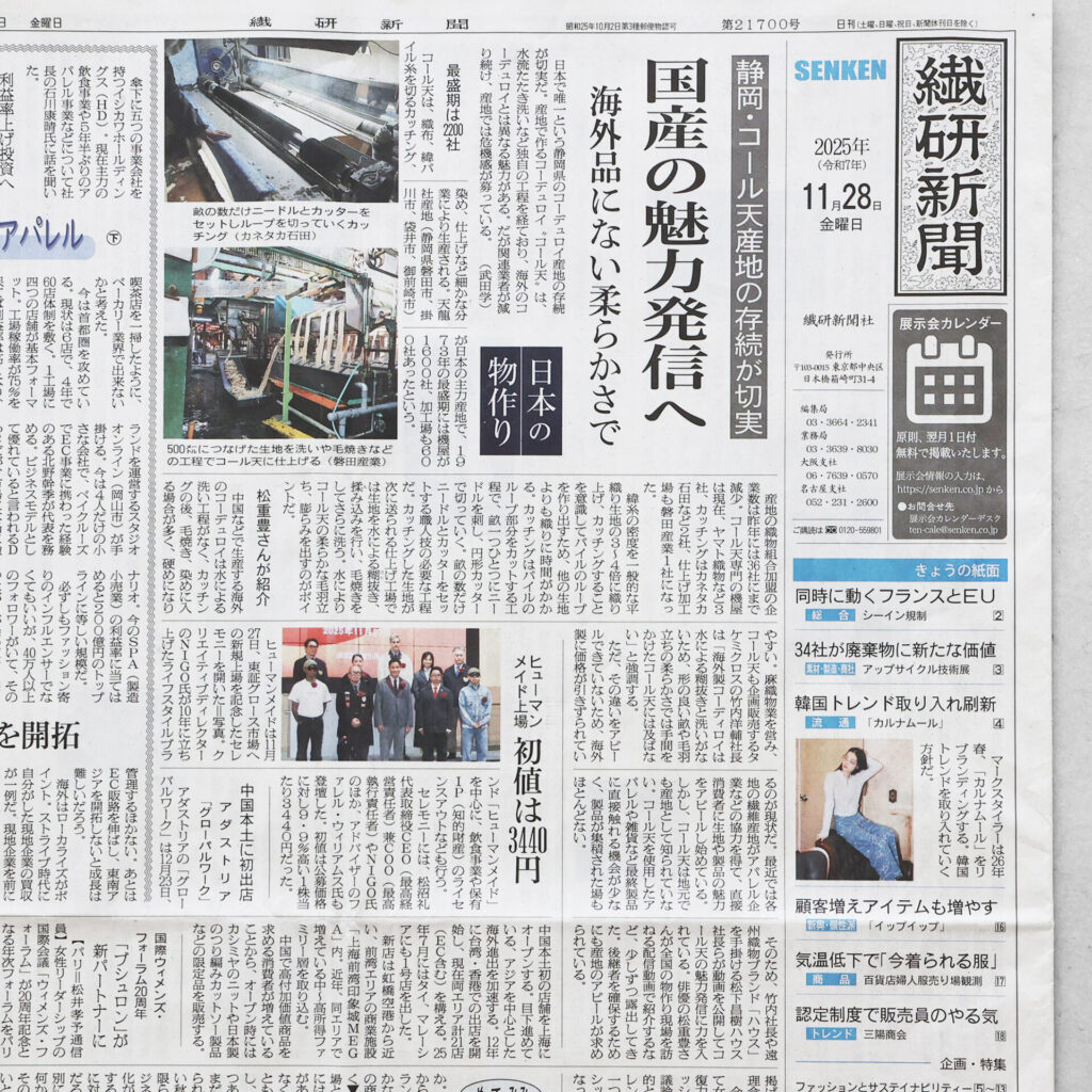 取材では、コール天がなぜ特別な生地なのか、そして現在ほんのわずかとなってしまった機屋さん・加工場さんのことなども丁寧に触れていただいています。国内コーデュロイ=コール天を守り続ける産地の姿を、より多くの方に知っていただける機会になりました。