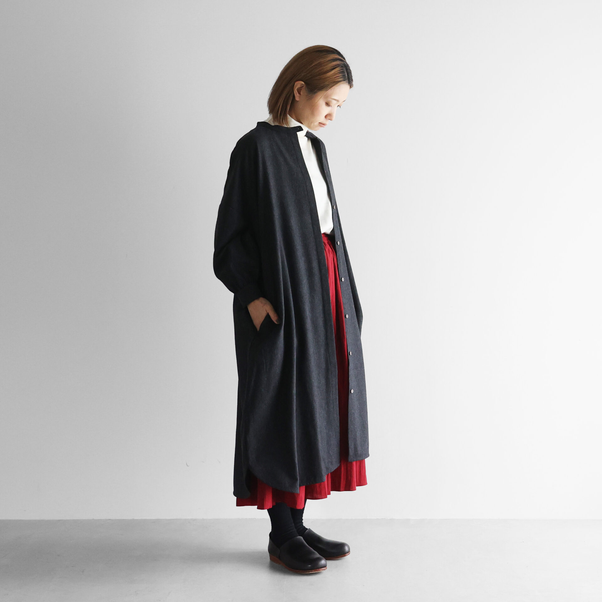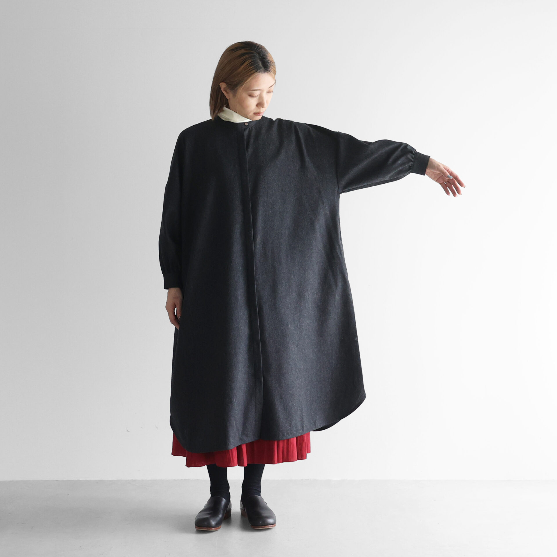 前合わせは隠ボタンになった比翼型でポケット付で、前を開けてきていただければアウターのような羽織のワンピースとしても重宝していただけます。