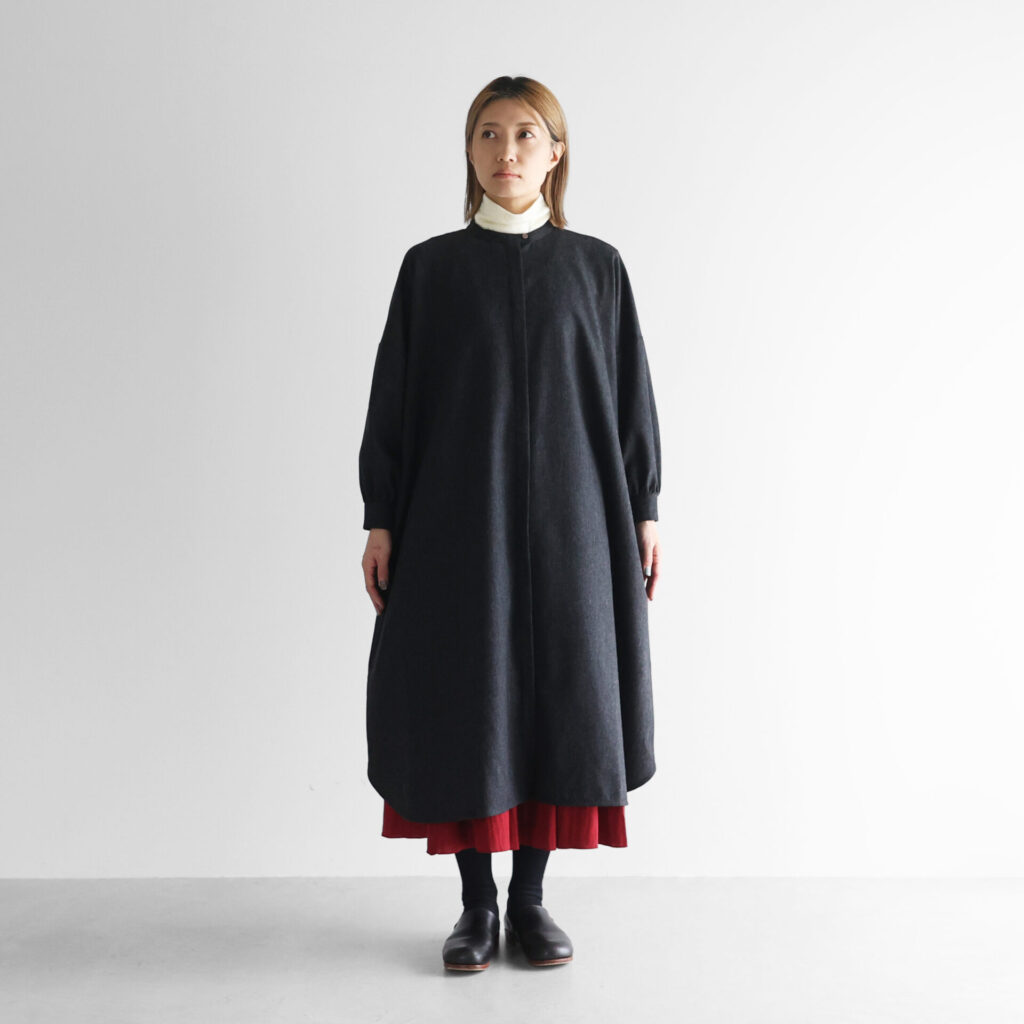 デザインは身幅をたっぷりととったゆったりシルエットのワンピースで、袖がゆるやかなバルーン型になったデザインです。