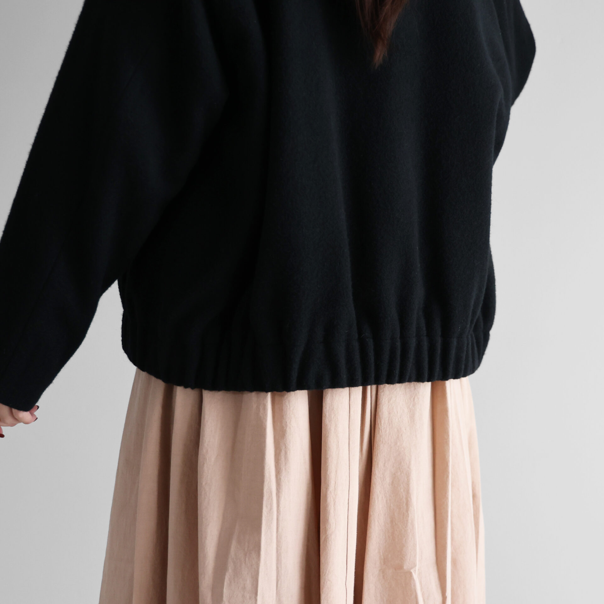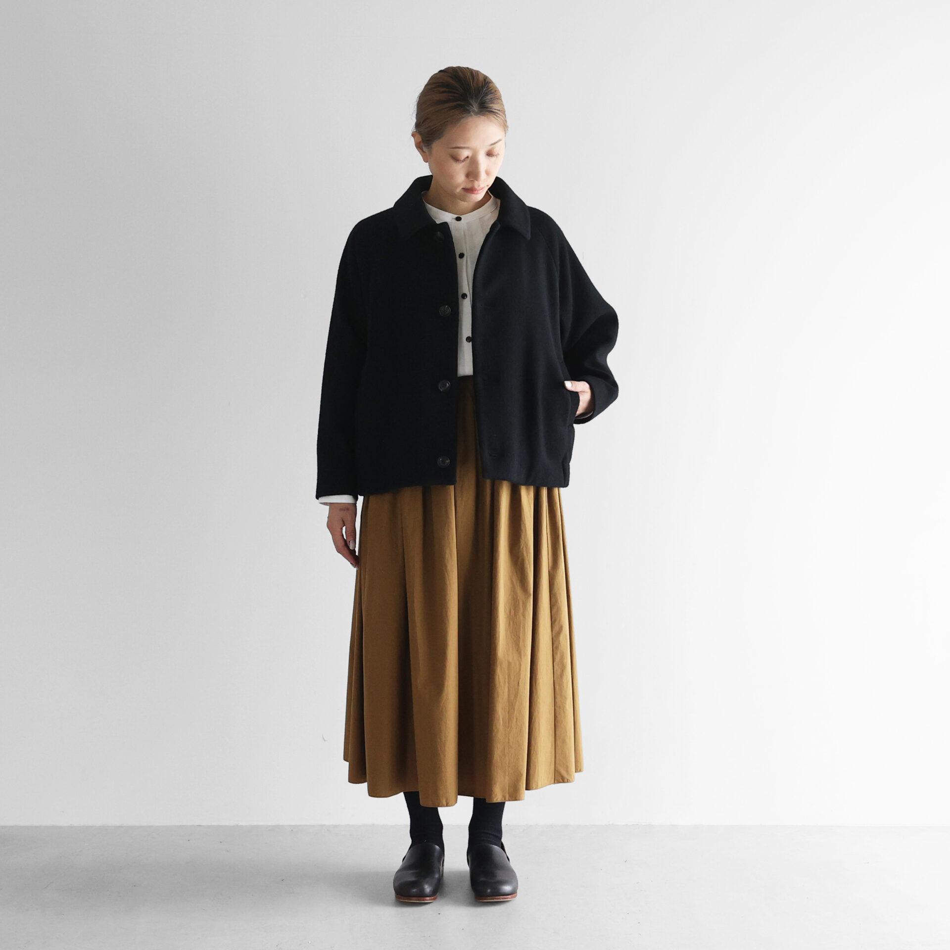 コンパクトな丈感と、ゆとりある身幅のバランスが心地よいショートコートです。肩から袖にかけてはラグランスリーブで動きやすく柔らかなシルエットに仕上げています。