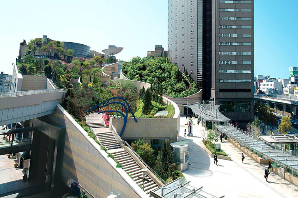 映画のワンシーンを彷彿とさせるような岩山のような壮大な空間と、都心に現れる森。