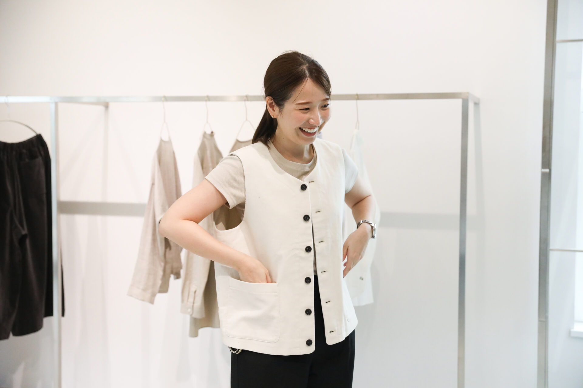 同じく松重見聞録の中で着用いただいている「オーガニックコットンオーバーシャツL」(こちらもリターン品に含まれています)の上に、オフホワイトのベストを着用されてこちらもばっちり。