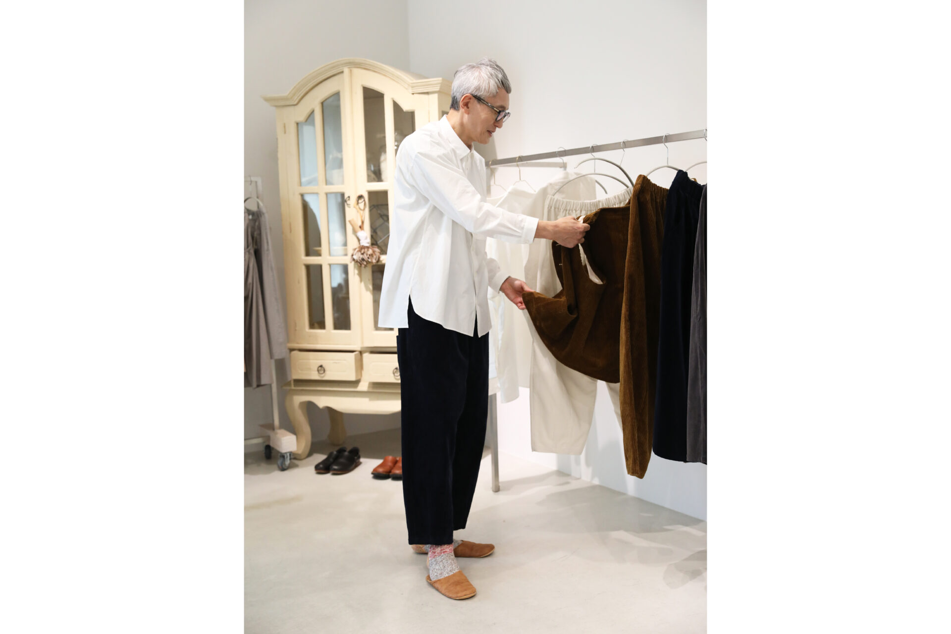 今回のクラウドファンディングでは、リターン品のアイテムをそれぞれ3色のコール天生地から選ぶことができますが、「松重見聞録」でも、収録の際に着用する何色を着用するか松重さんご本人が決められました。