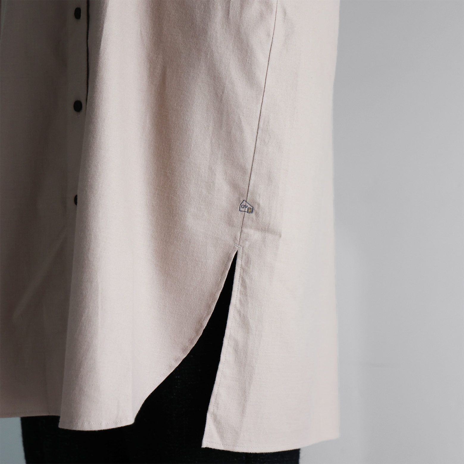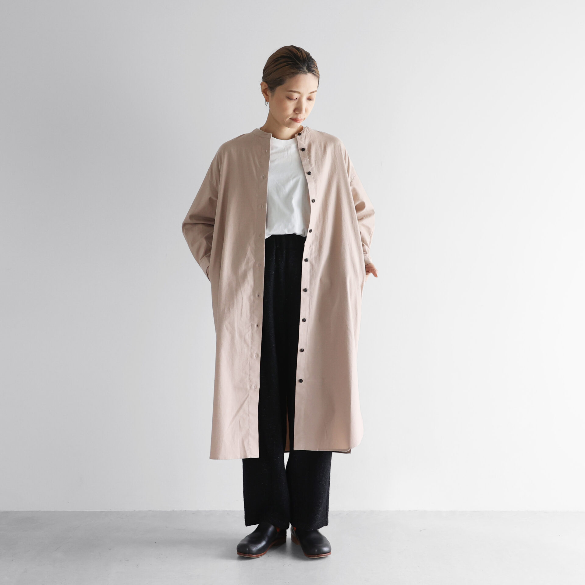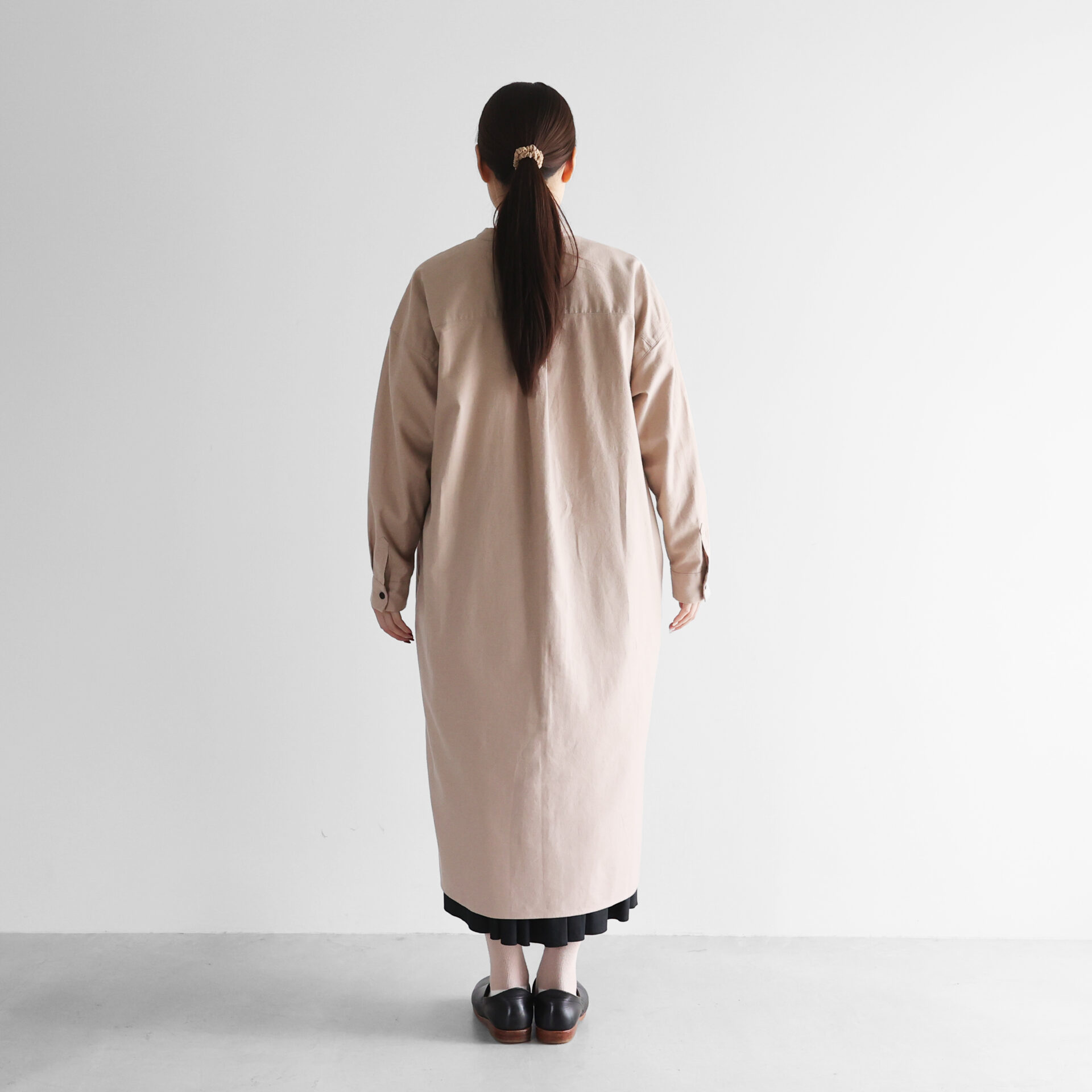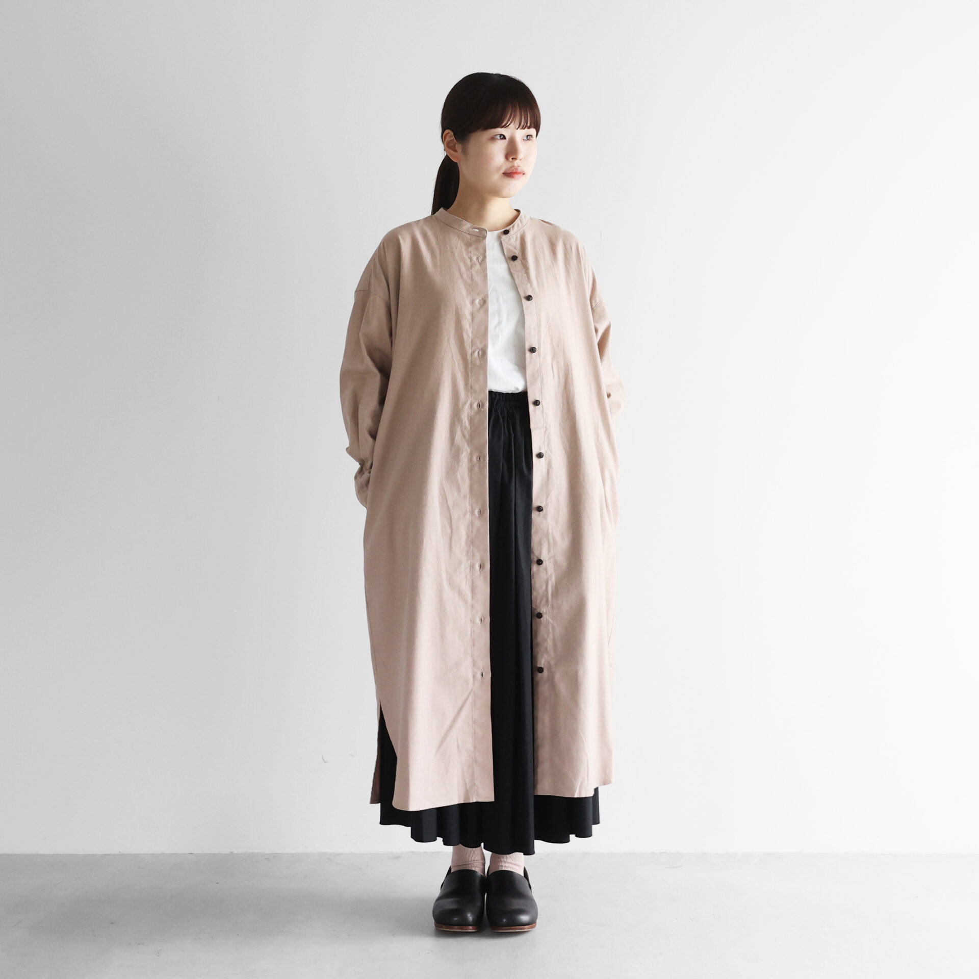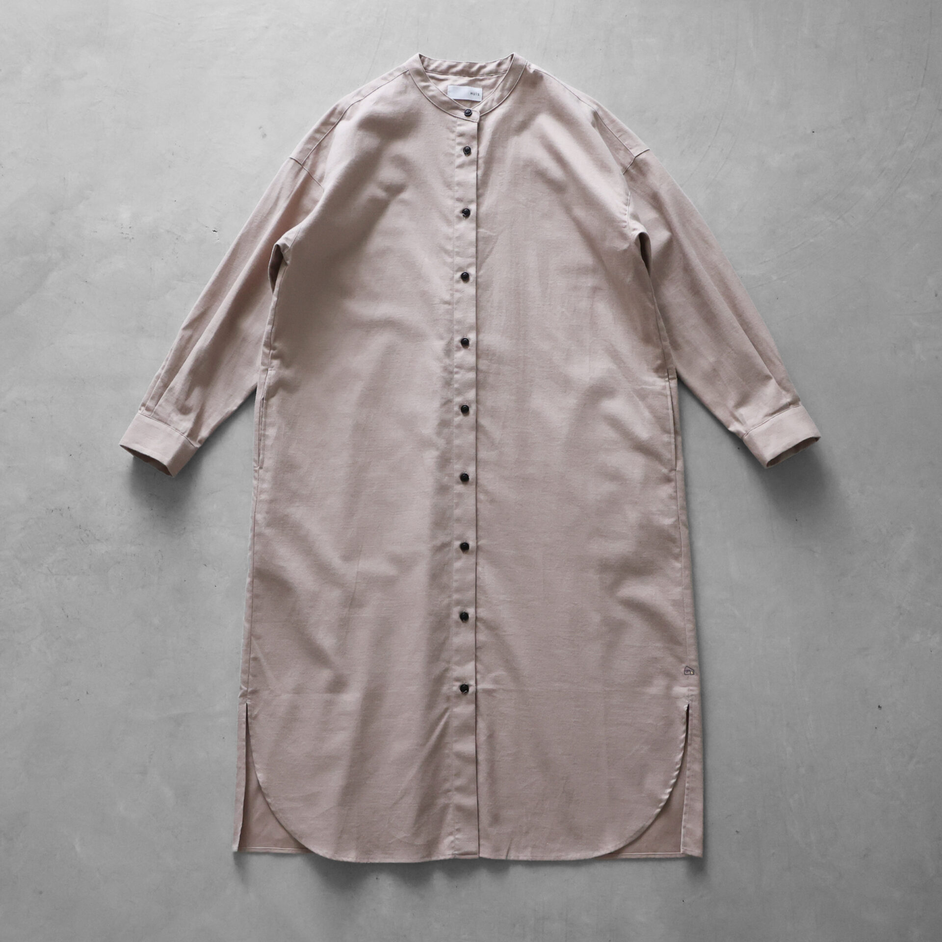 シンプルなバンドカラーのシャツワンピースで、シャツとワンピースの中間くらいのアイテム感。たっぷりと生地を使うことでシャトル織機で生まれる風合いを存分に味わえるロングワンピースです。クラシカルなボタンもポイントで、シンプルながらディティールの光るデザインです。