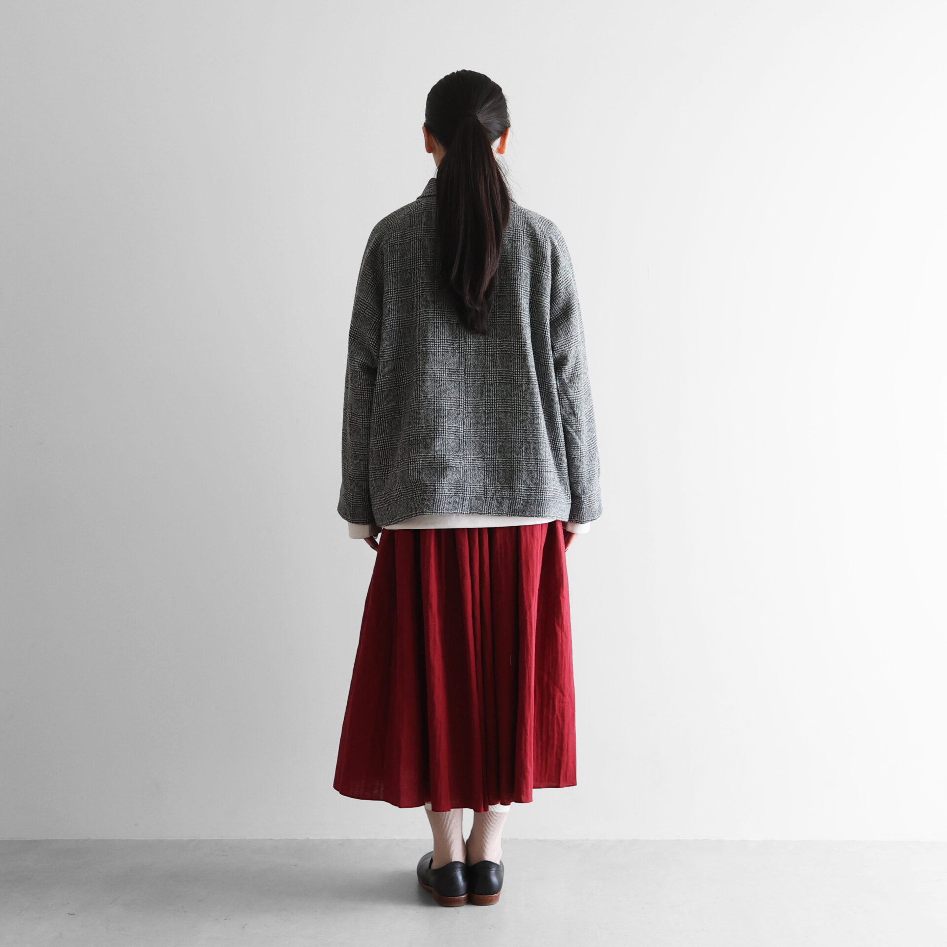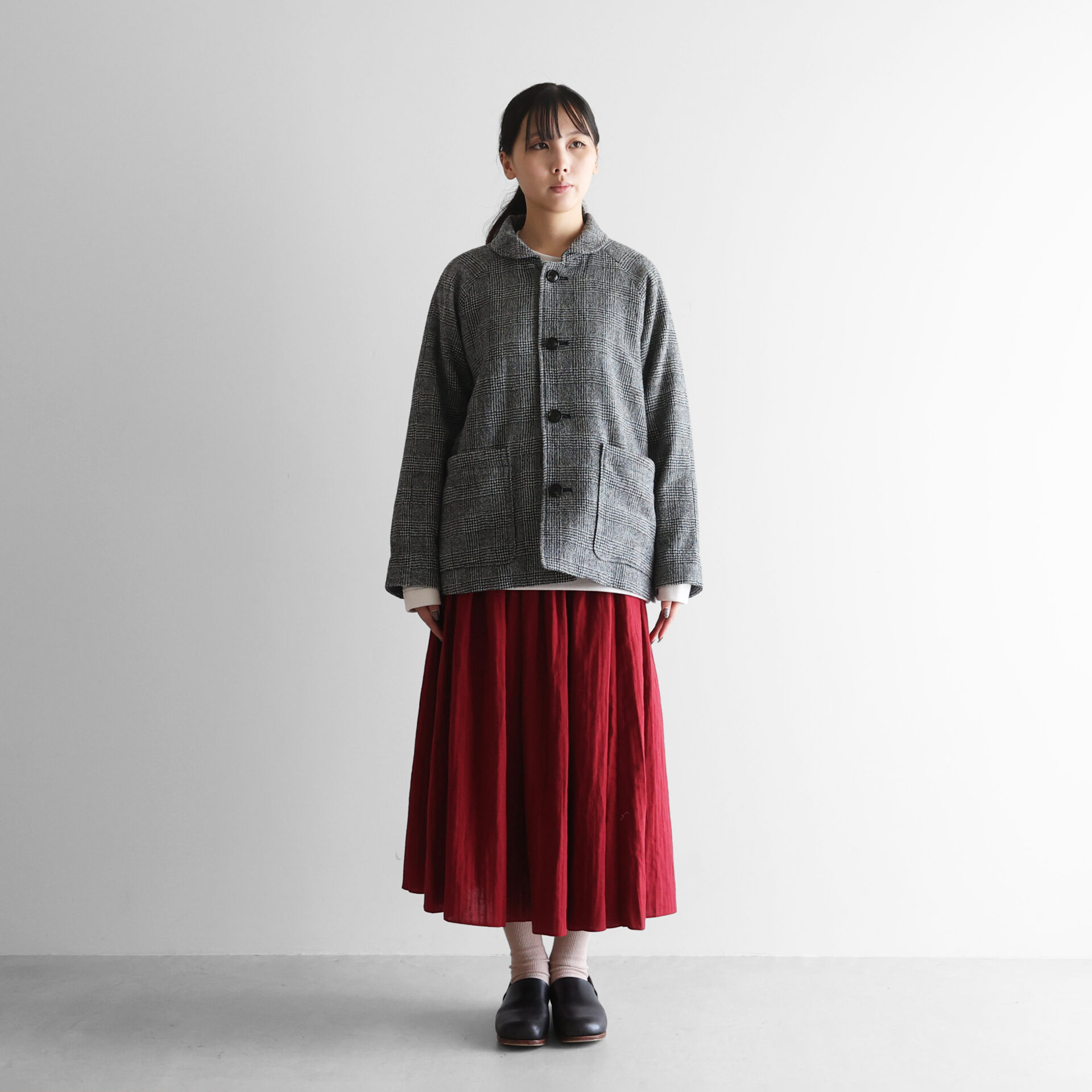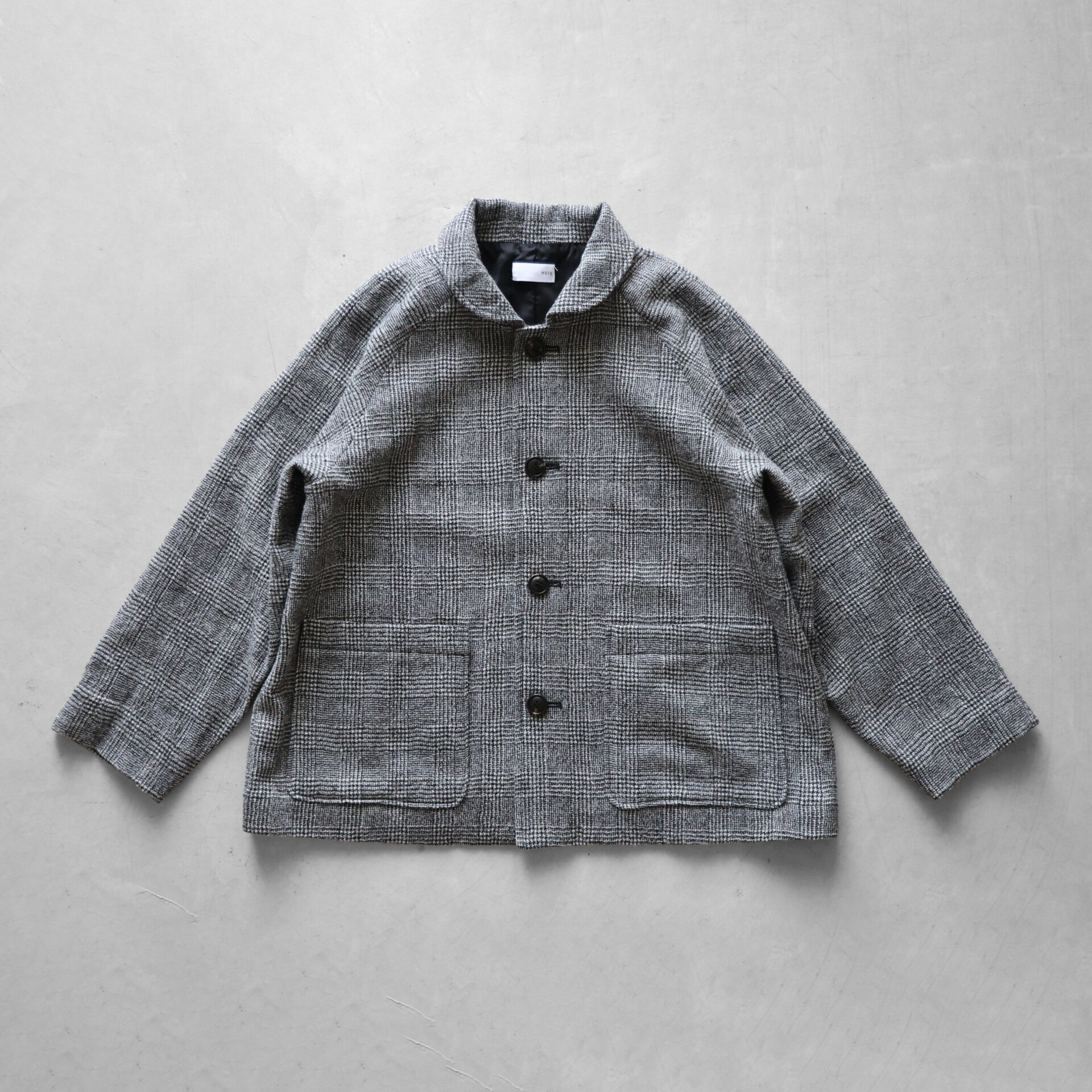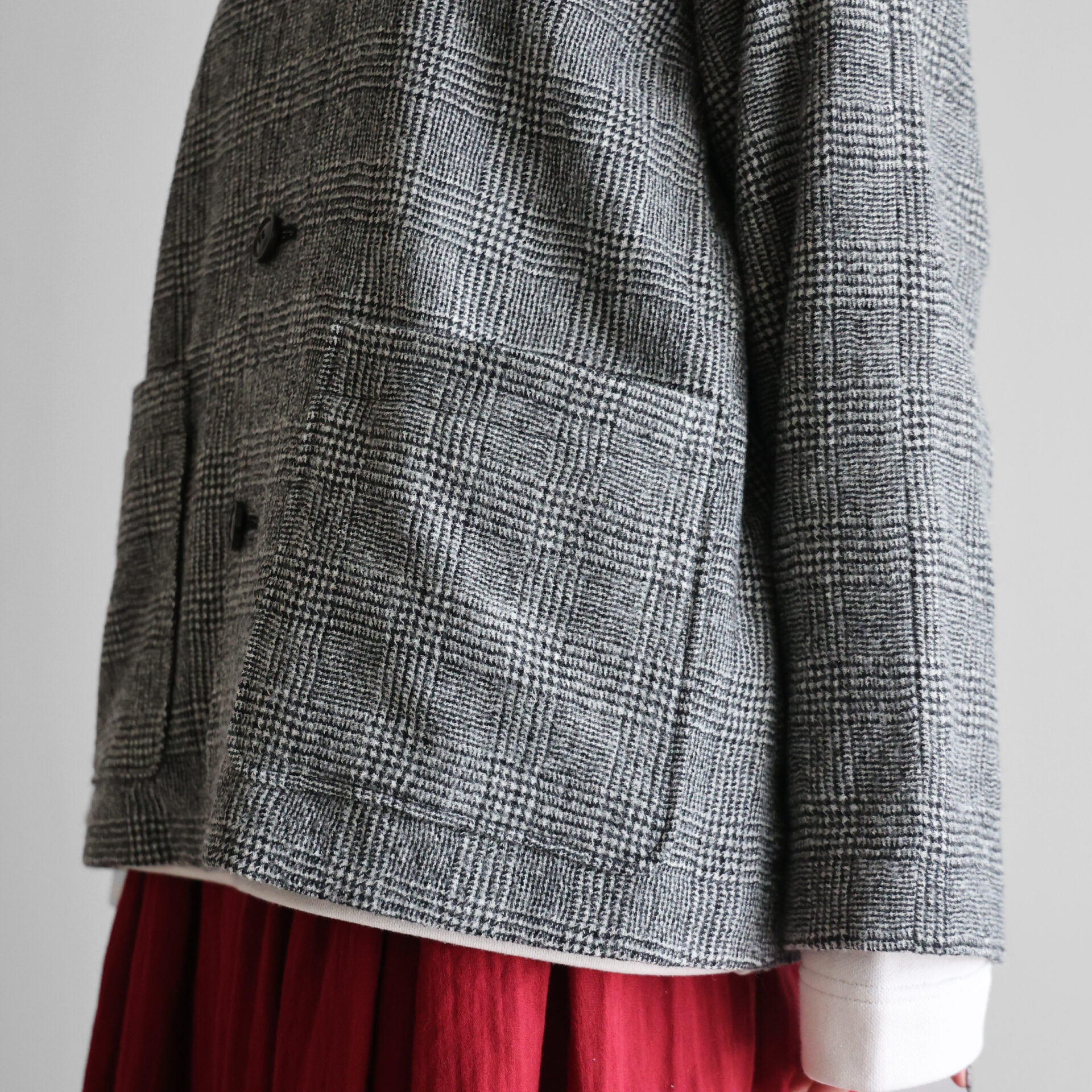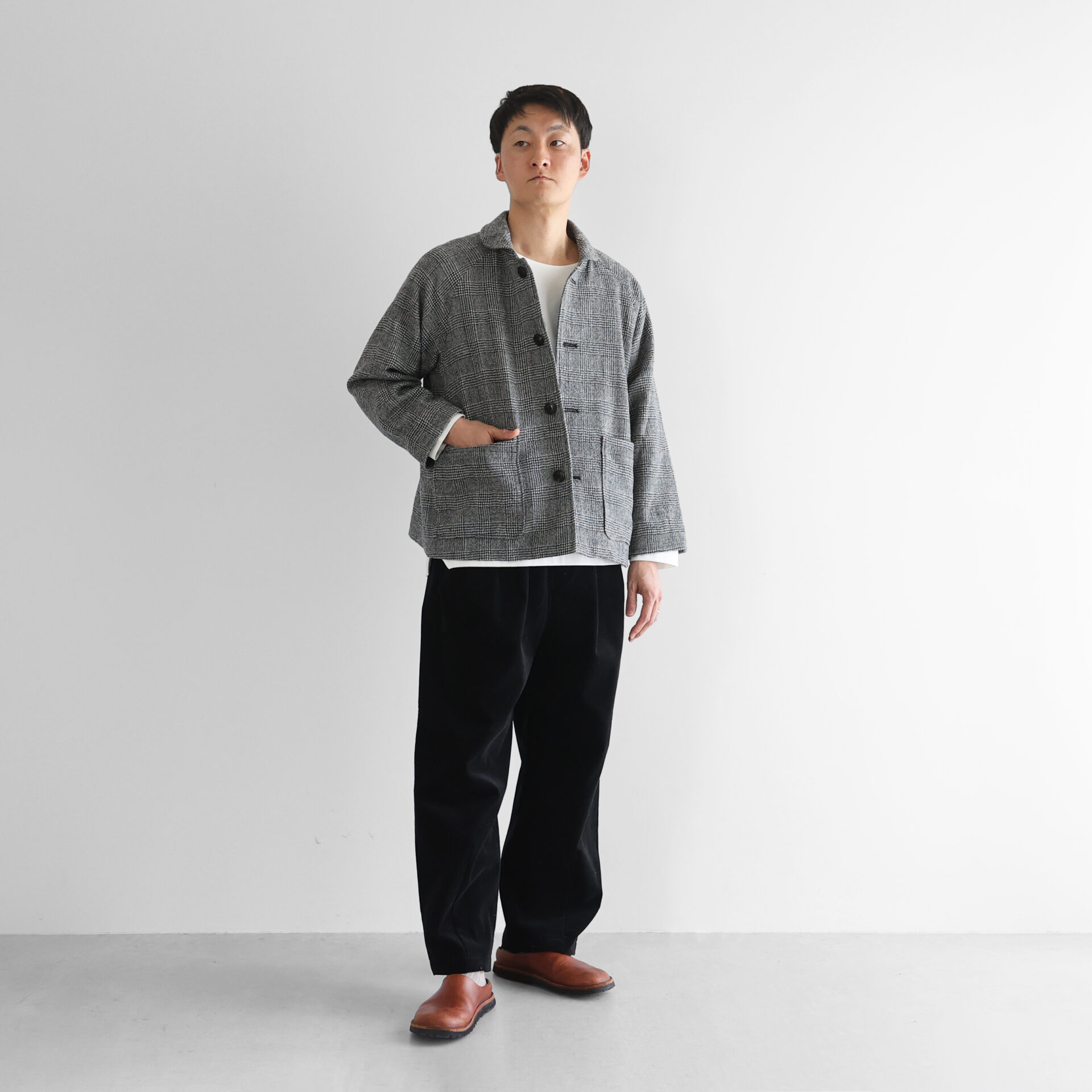 素材は、ウール 100%。48 番⼿梳⽑双⽷を、空気を含むよう特に低密度で⽢く柔らかく織ったうえで強い縮絨加⼯をかけることにより、⽣地に凹凸感のある豊かな⾵合いが⽣まれることが特徴です。 ふっくらとした⽴体感が⽣まれ空気を多く含むことから、 軽量で保温性を備えた⽣地となります。 伝統的なグレンチェック柄で、 尾州産地の⾼い製織&縮絨技術が⽣み出す特別な⽣地です。