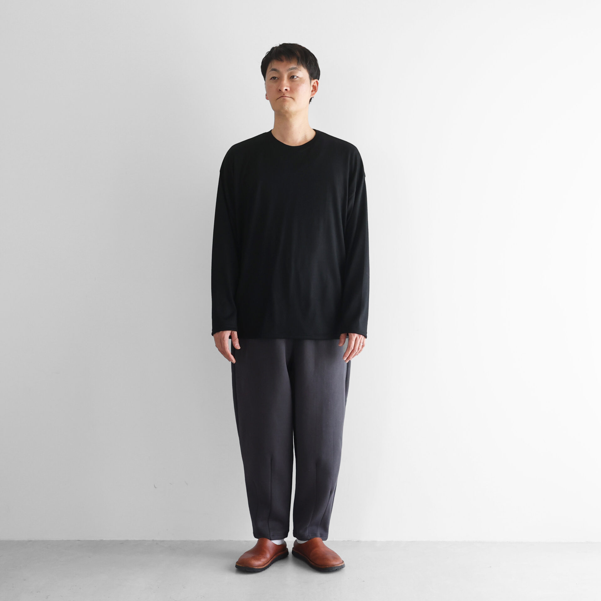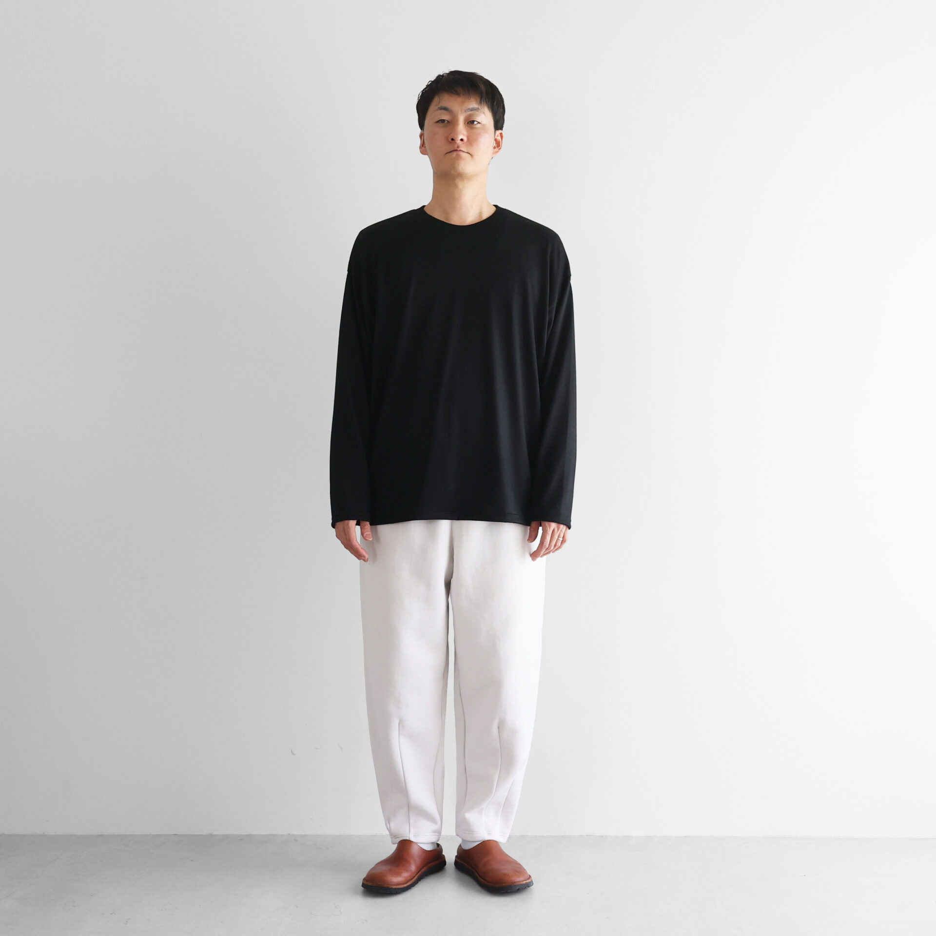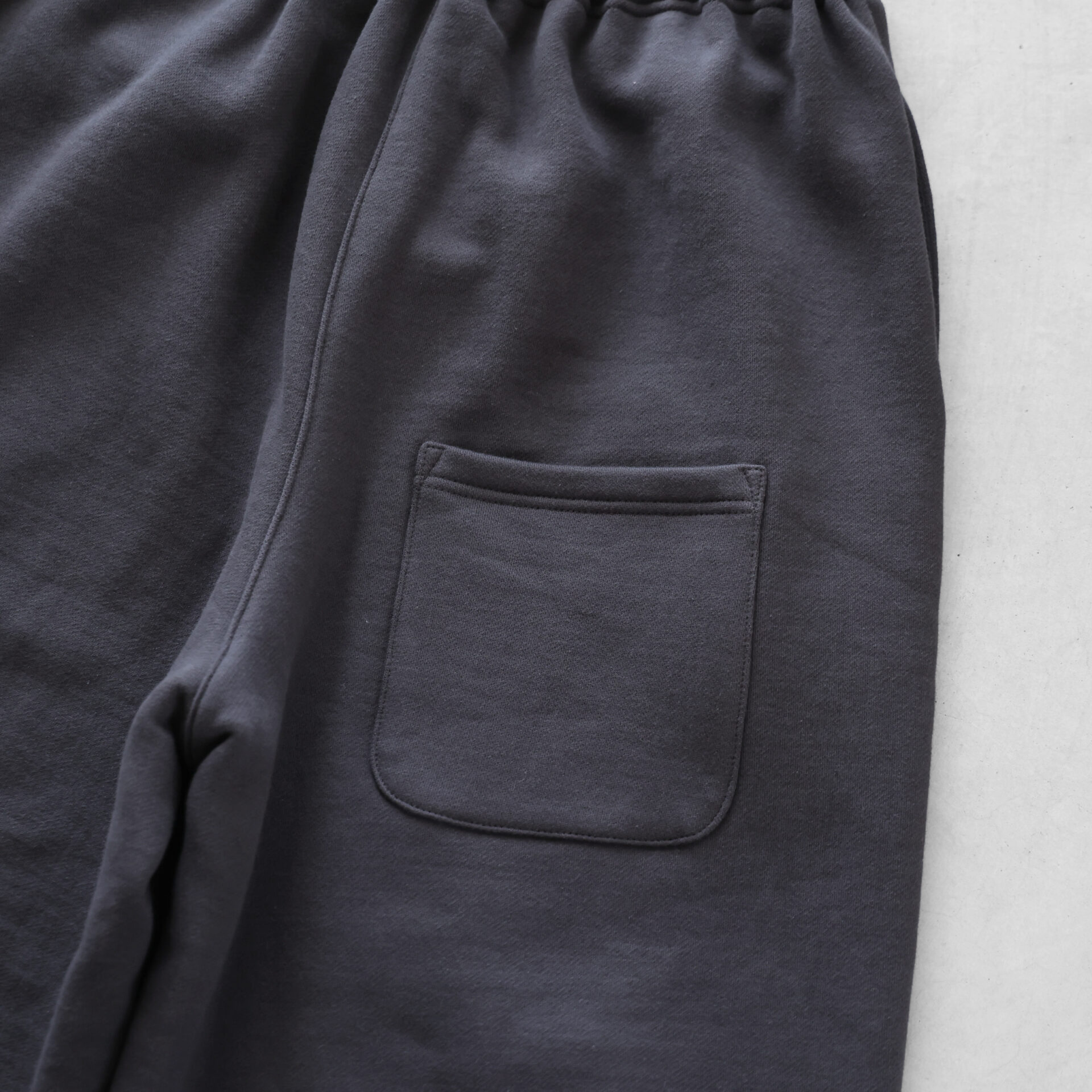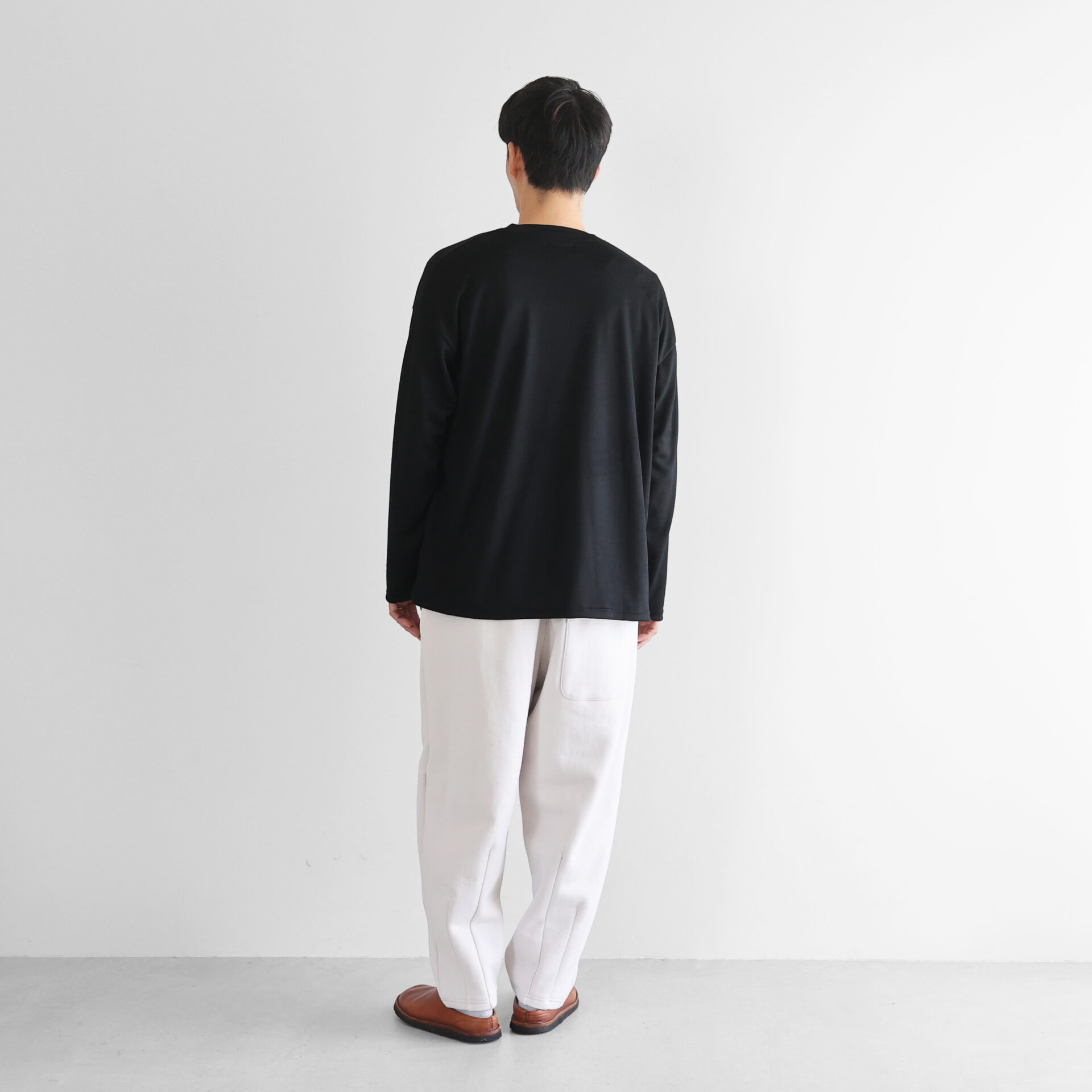 従来のスウェット素材にみられがちな硬さやごわつきを一切感じさせず、軽やかで、また、しなやかで落ち感のある素材感は、身体にしっとりと馴染みます。「超甘撚りの糸」が編み上げるSUVINスウェットは、唯一無二のスウェット素材です。